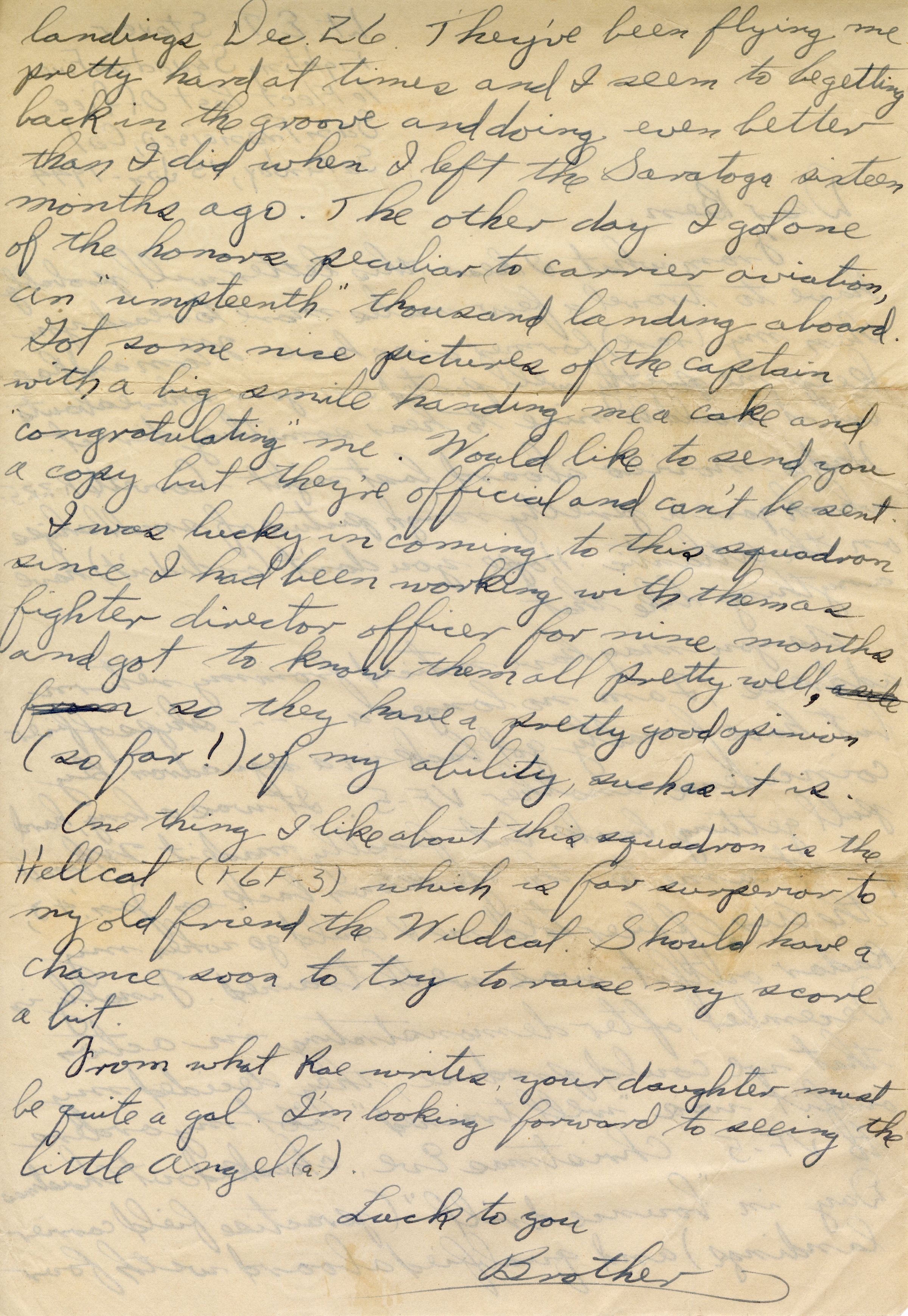 In this letter Elisha "Smokey" Stover discusses how he successfully rejoined a fighter squadron, and the process of getting ready to see combat again. Smokey also talks about his 7,000th carrier landing aboard the Yorktown and how much he is enjoying the F6F Hellcat.Context