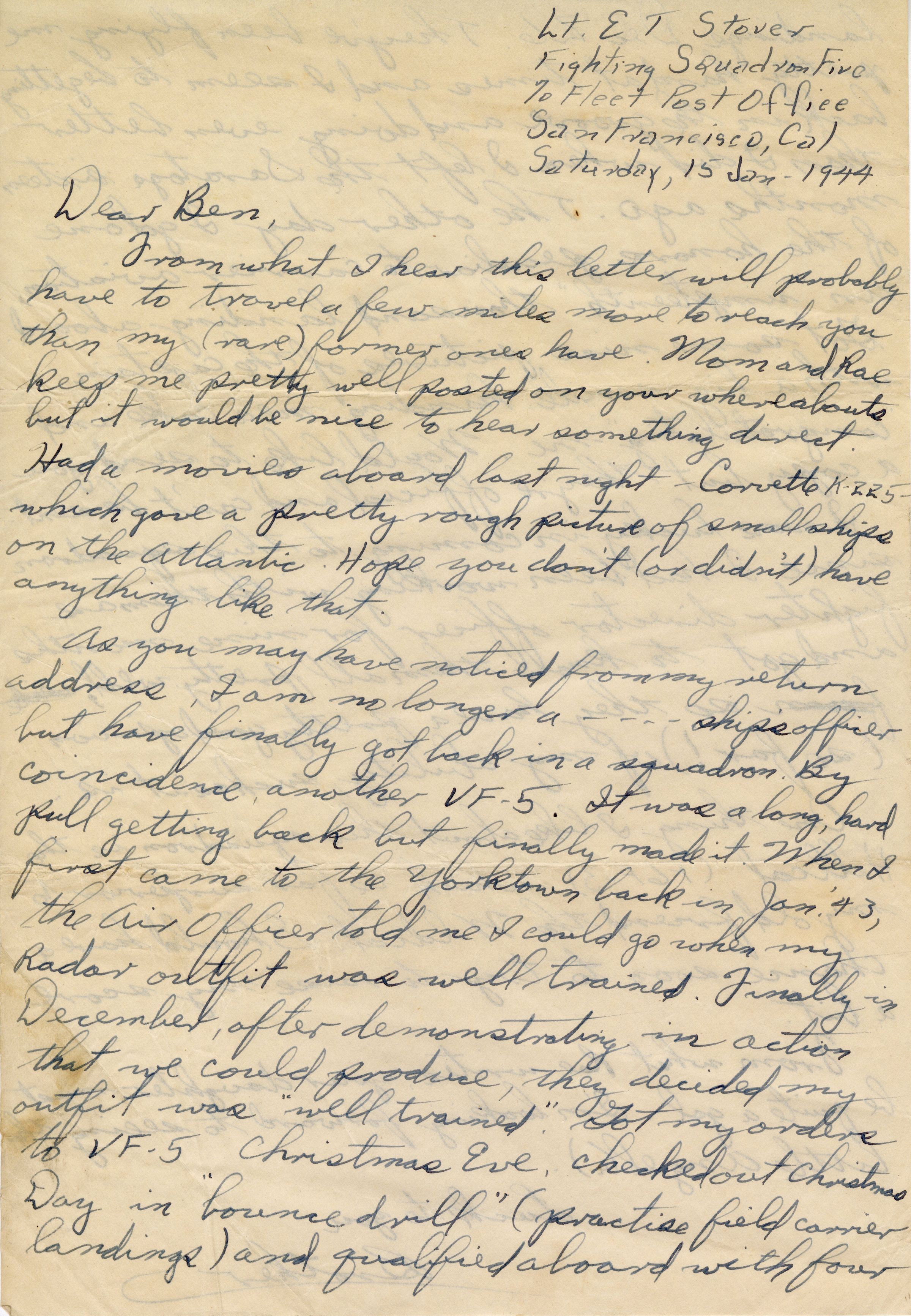 Letter From Elisha "Smokey" Stover to Benjamin Stover Dated January 15, 1944Scope and Content