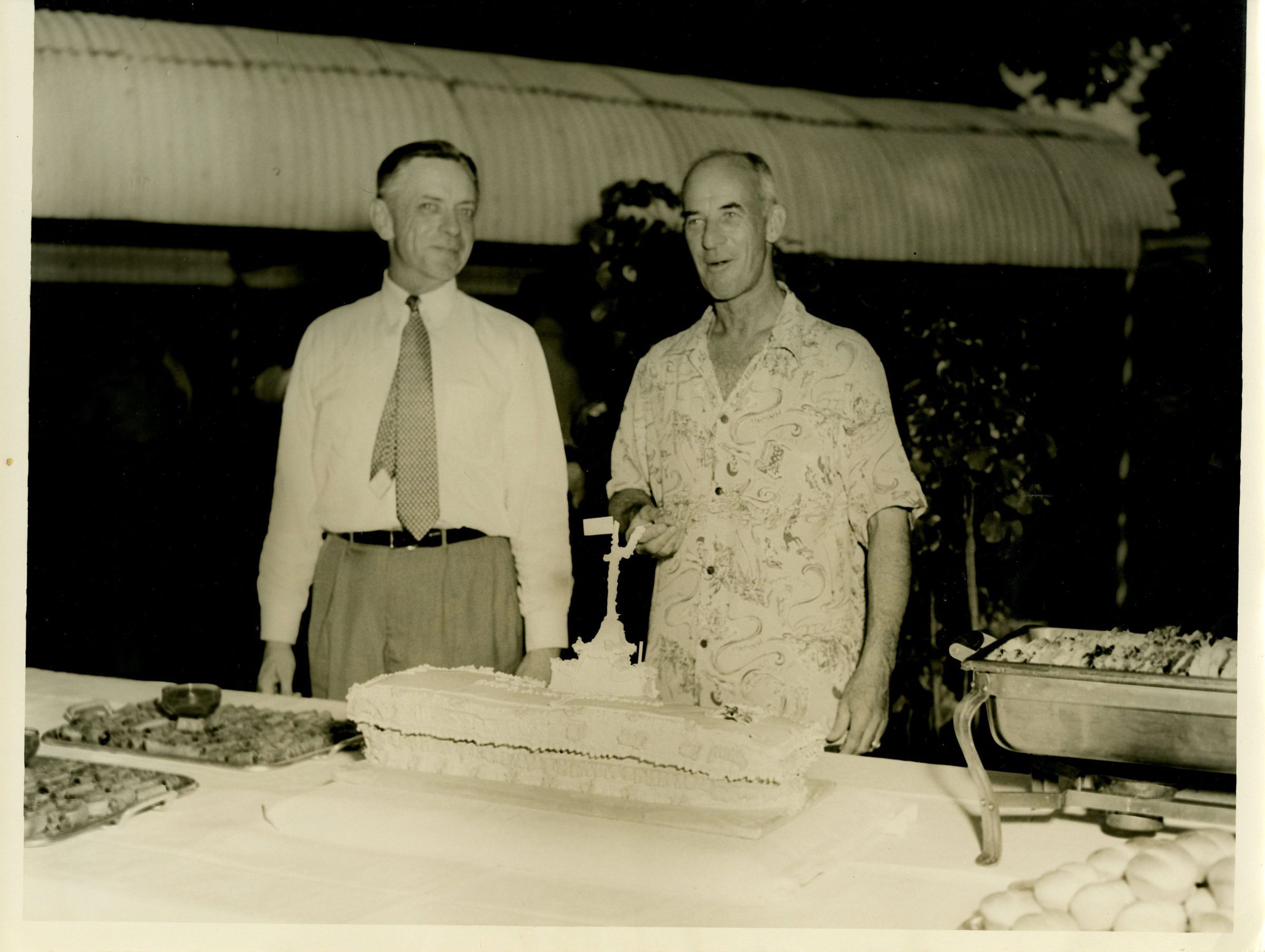 This photograph shows Captain Arnold McKechnie trying the Yorktown-shaped cake prepared for his farewell party in 1954. Captain McKechnie had just been relieved of command by Captain Gerald Huff.Context
