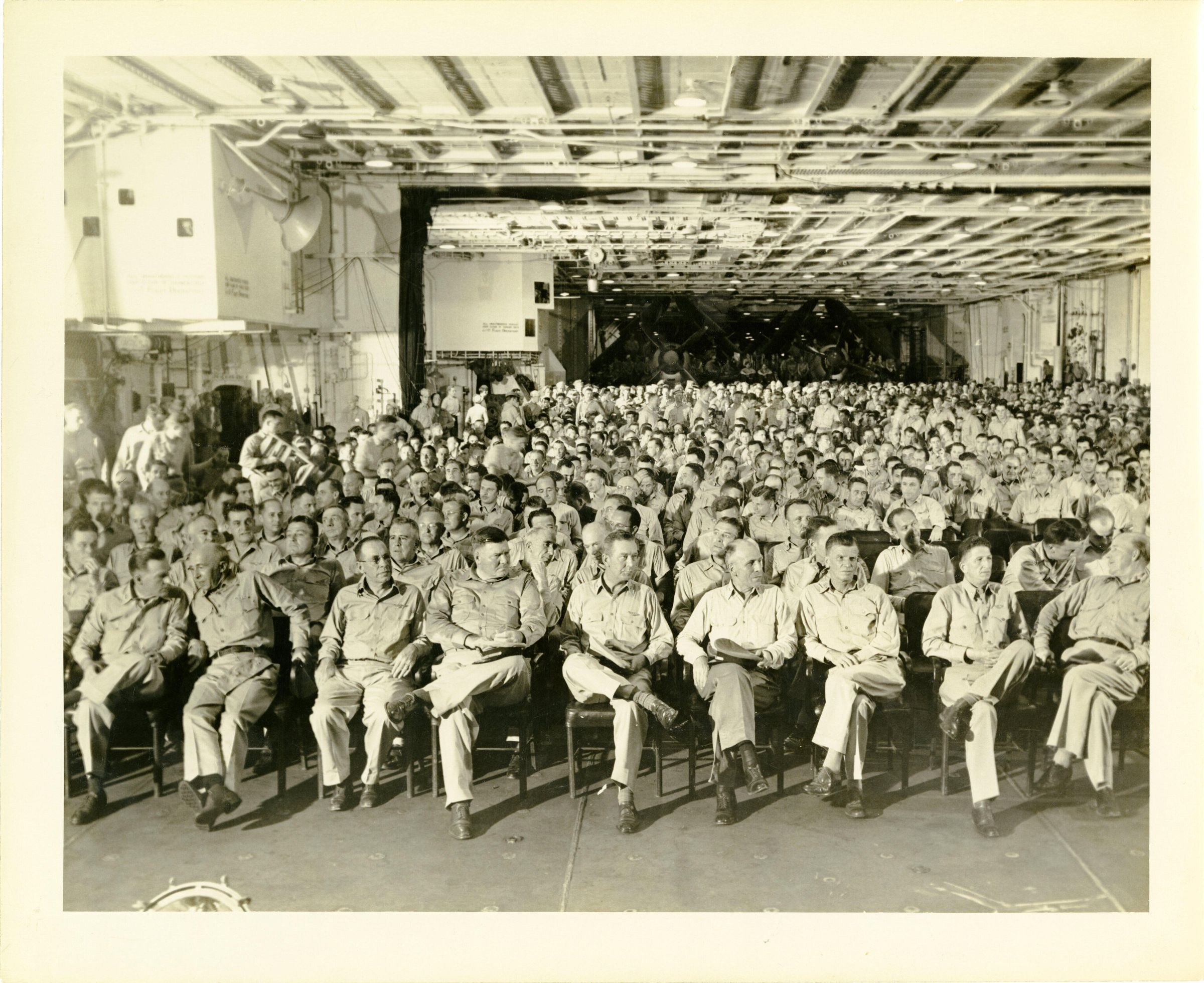 Photograph of a large number of officers and sailors assembled in the hangar bay of the USS Yorktown (CV-10), for the February 5th, 1945, Fleet Premier of "The Fighting Lady". The premier included a dinner and a speech by Dwight Long. Several crewmen can be seen using Curtiss SB2C Helldivers as seating toward the back of the crowd.Collection