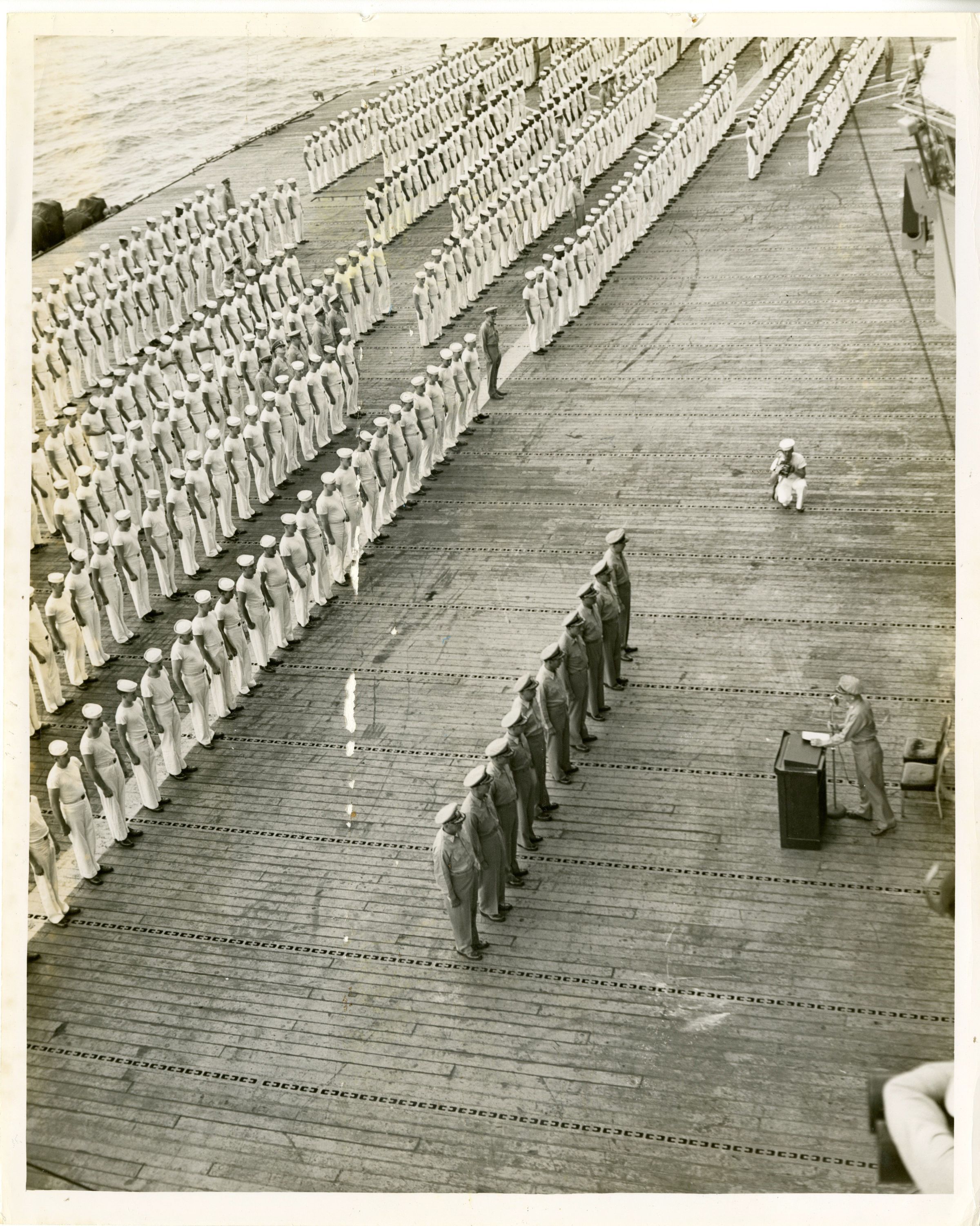 This is a photograph of crew at quarters during the changing of command ceremonies aboard the USS Yorktown (CVA-10). Captain Arnold McKechnie is being relieved by Captain Gerald Huff.Context