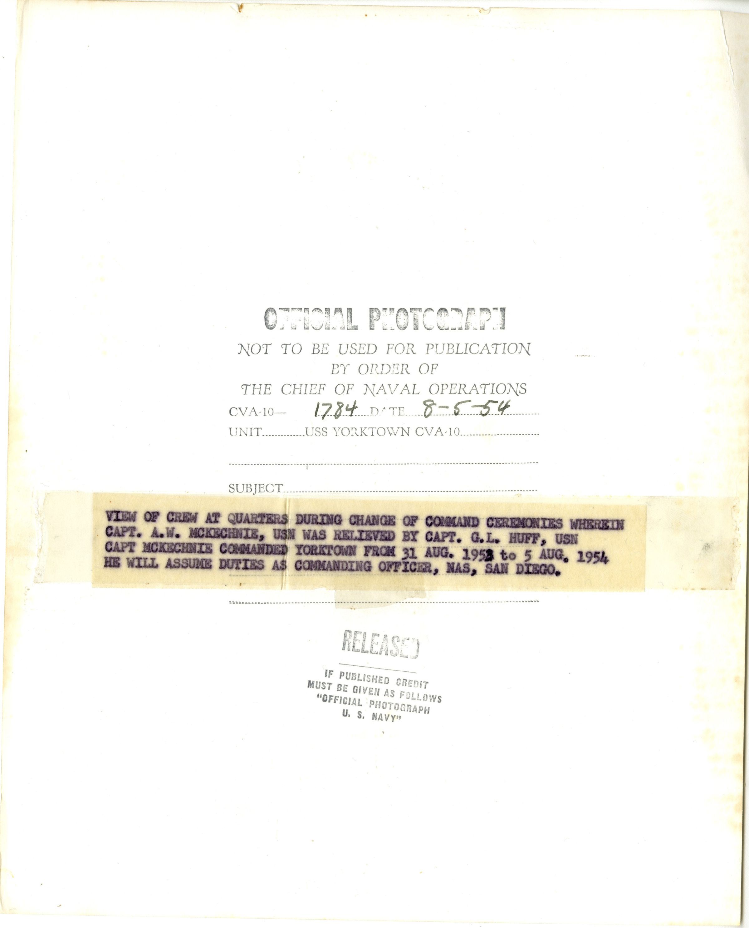 View of Crew at Quarters During Change of Command Ceremonies Wherein Capt. A.W. McKechnie, USN was relived by Capt. G.L. Huff, USN Capt McKechnie Commanded Yorktown From 31 AUG. 1953 to 5 Aug 1954 He will assume dutues as Commanding Officer, NAS, SAN DIEGO.Update Date