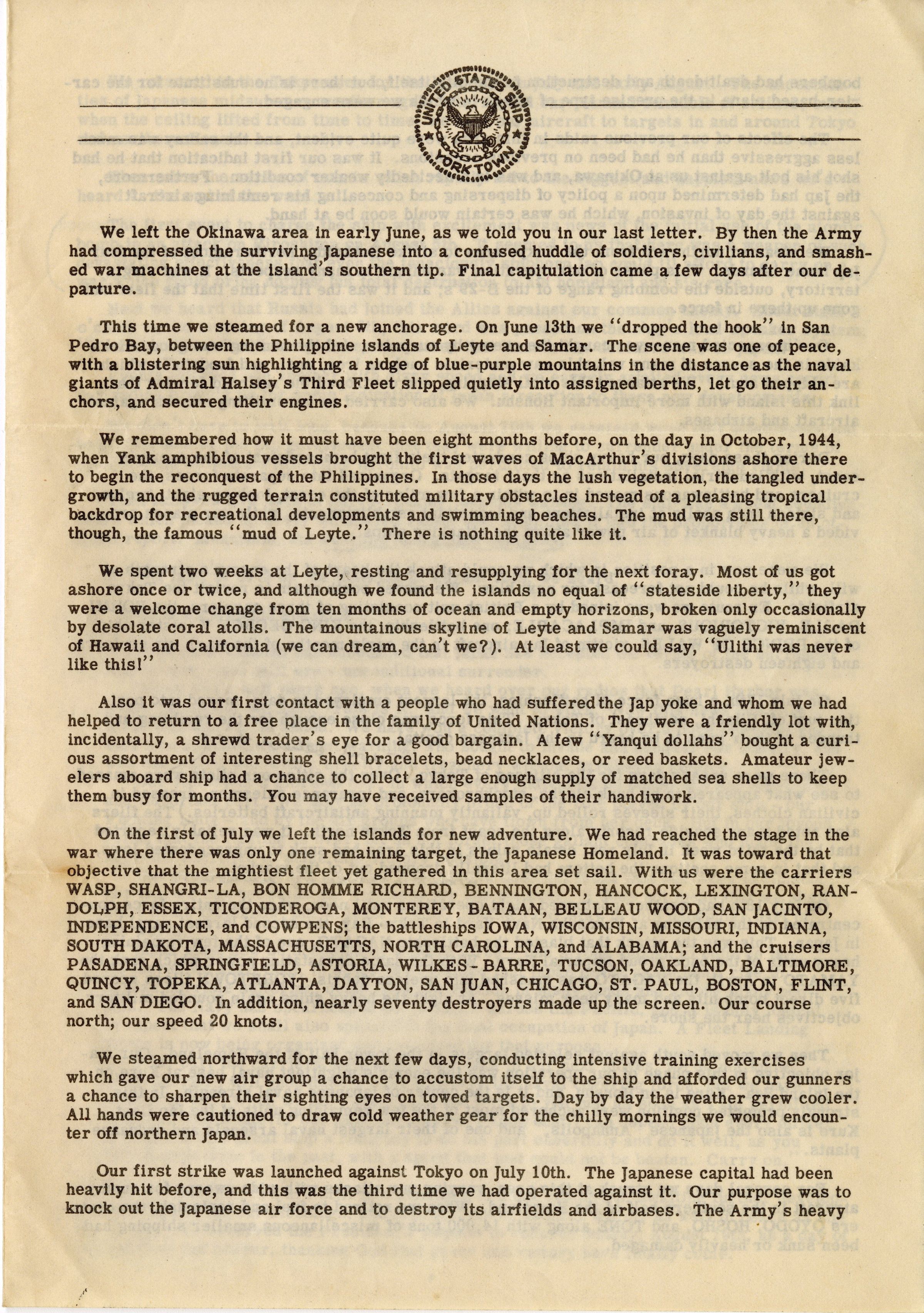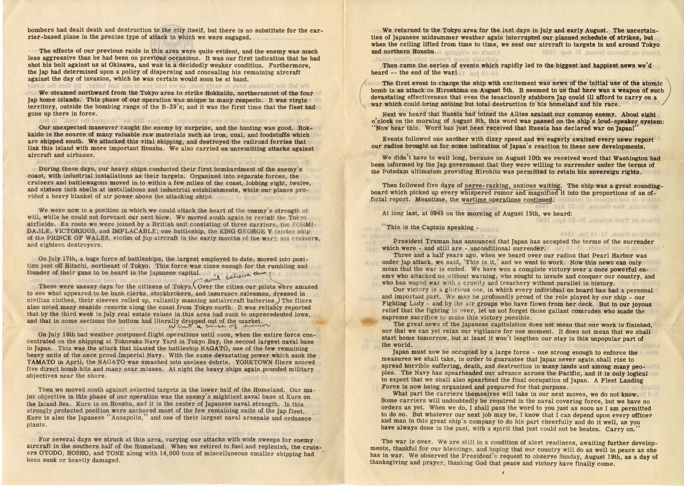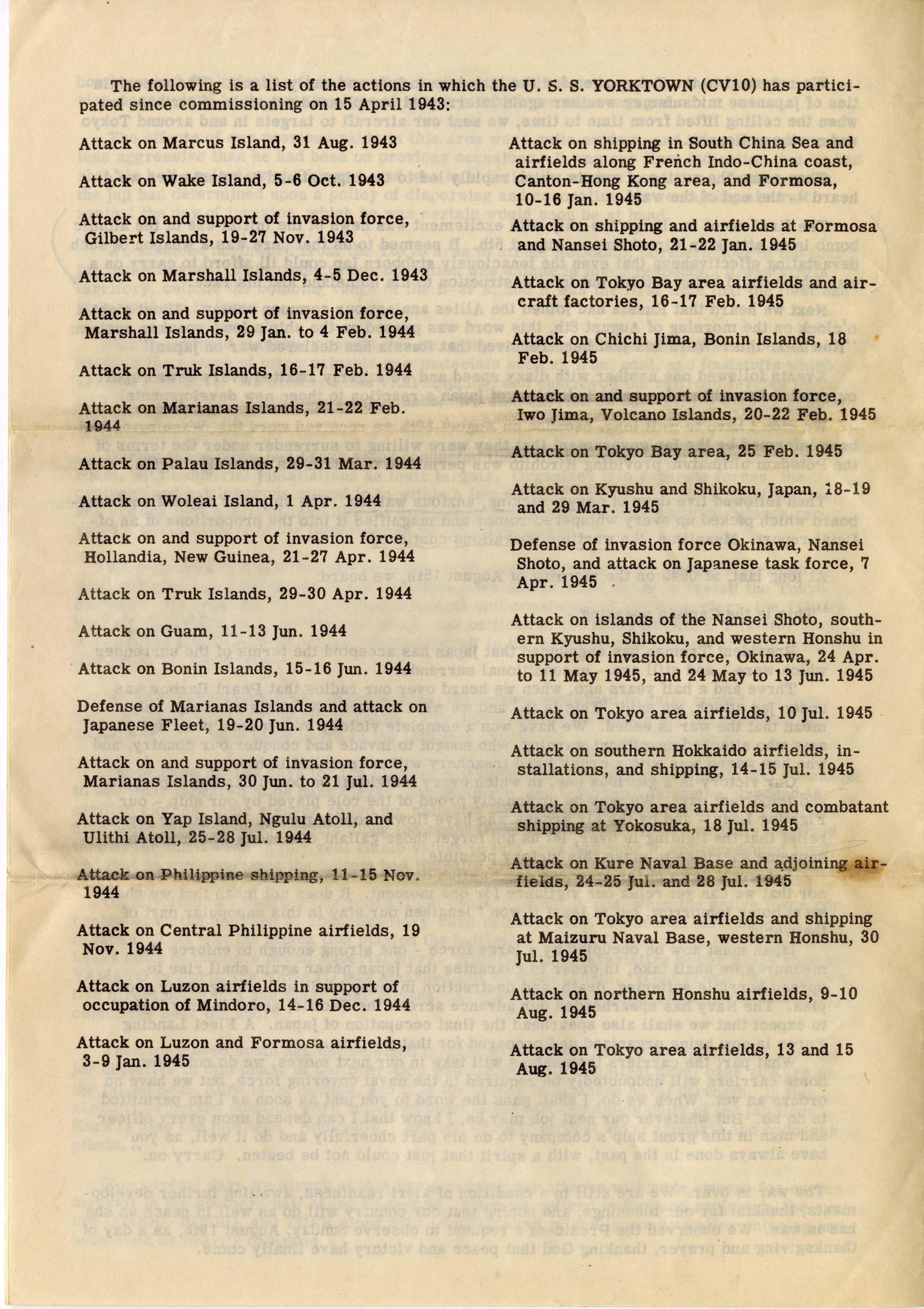 This pamphlet covers the service history of the USS Yorktown (CV-10) during World War II and features some handwritten comments in the margins of the document. Most likely Gerald Hennesy left the comments before sending it to his mother.Context