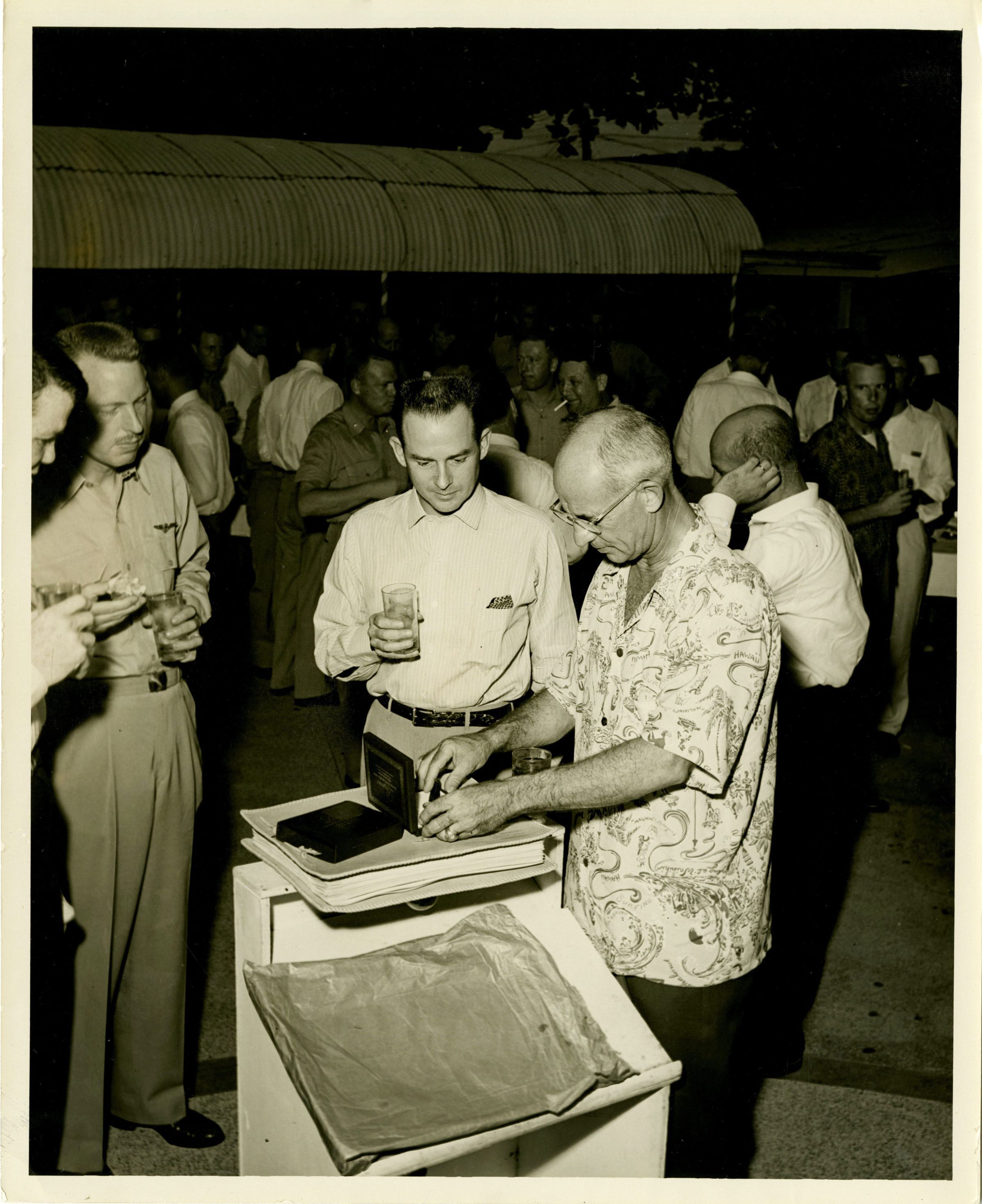 This photograph shows Captain Arnold McKechnie looking over some of the gifts given to him following being relieved of command of the USS Yorktown (CVA-10).Context