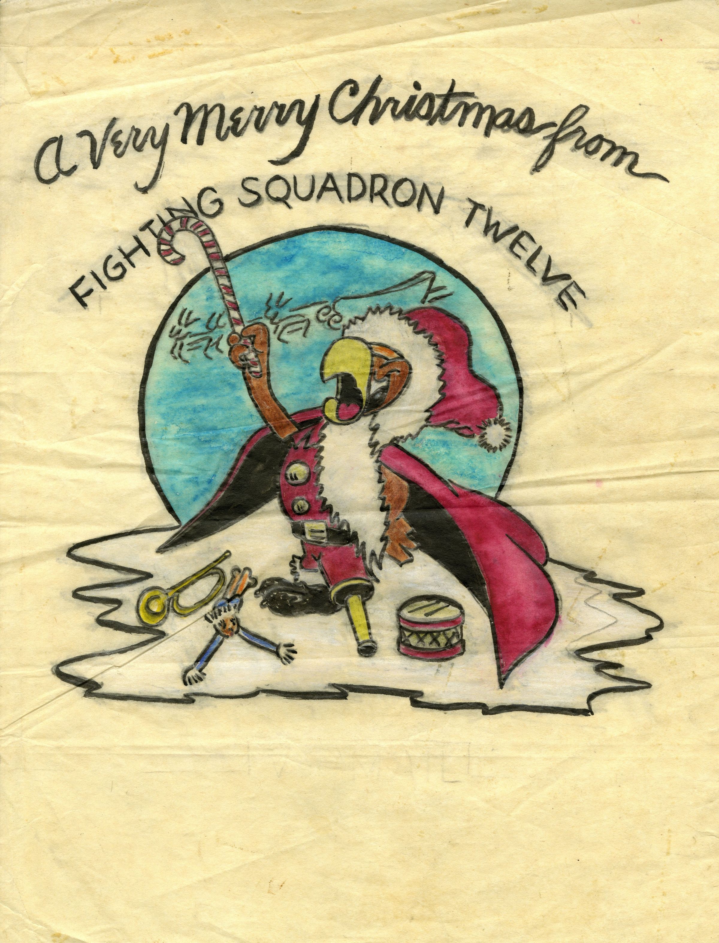 The Fighting Squadron Twelve (VF-12) insignia drawn on a sheet of paper and customized for Christmas. The paper reads 'A Very Merry Christmas from Fighting Squadron Twelve,' and shows a parrot dressed as Santa Clause brandishing a candy cane with Santa's sleigh in the background.Context