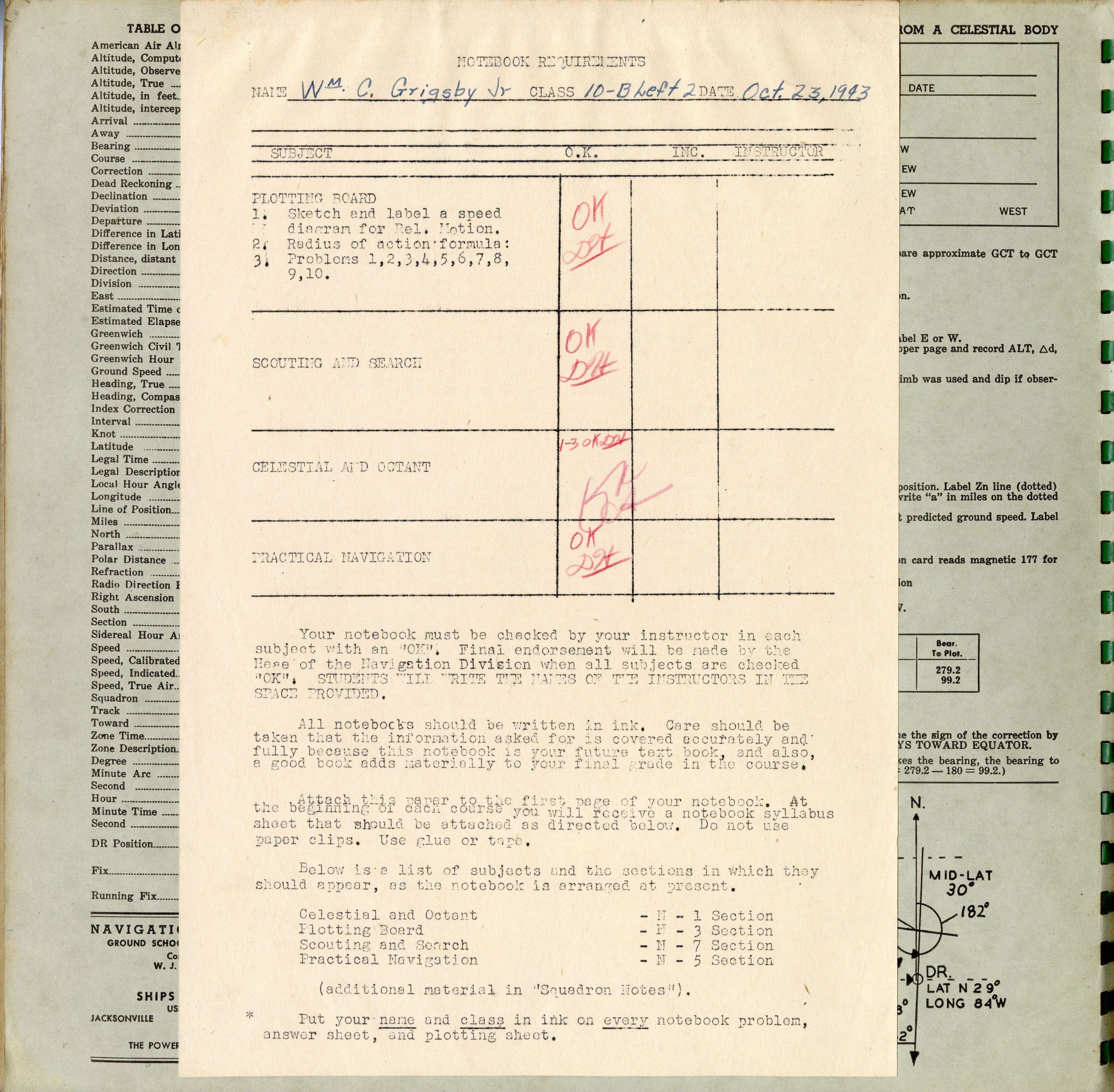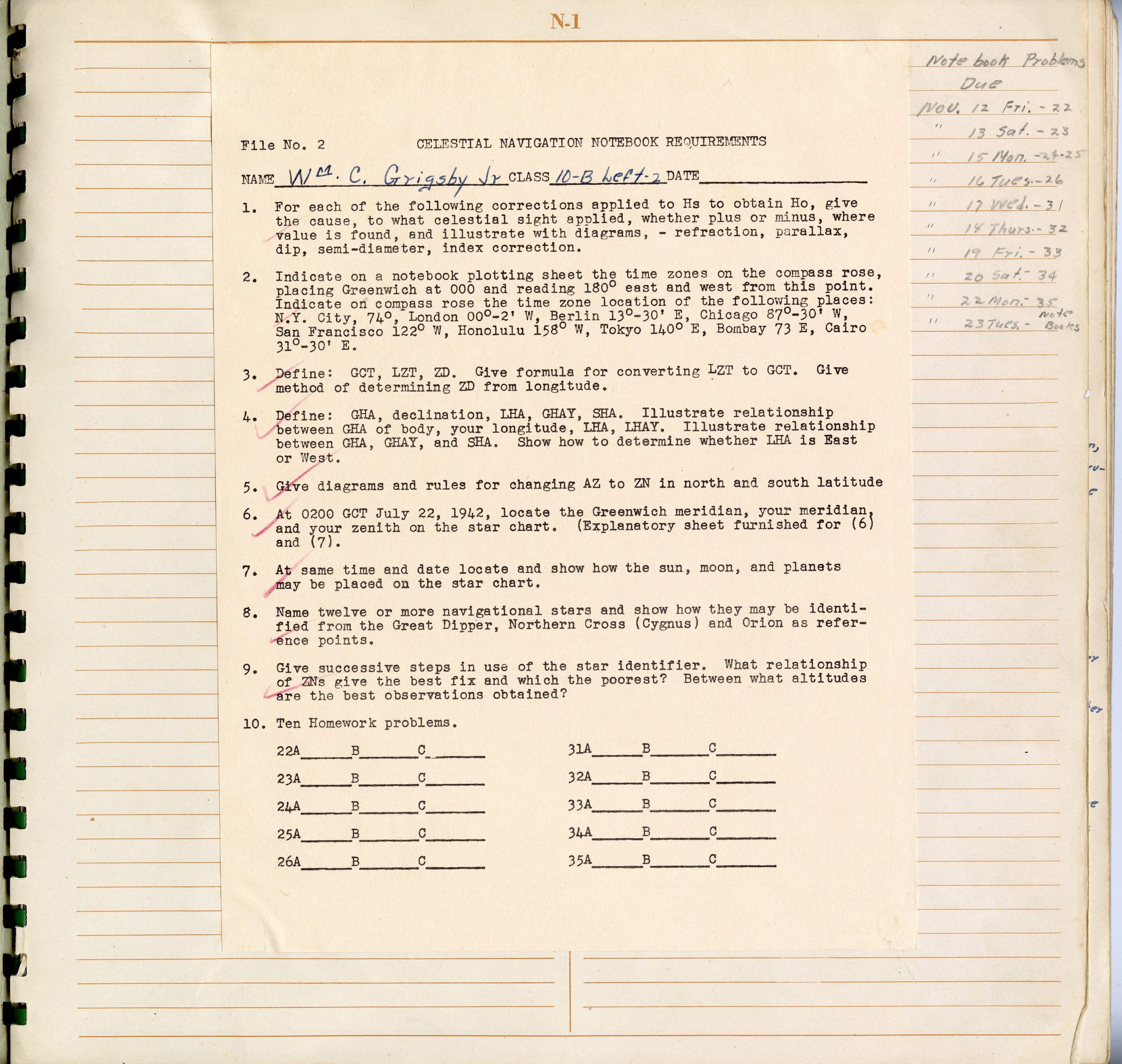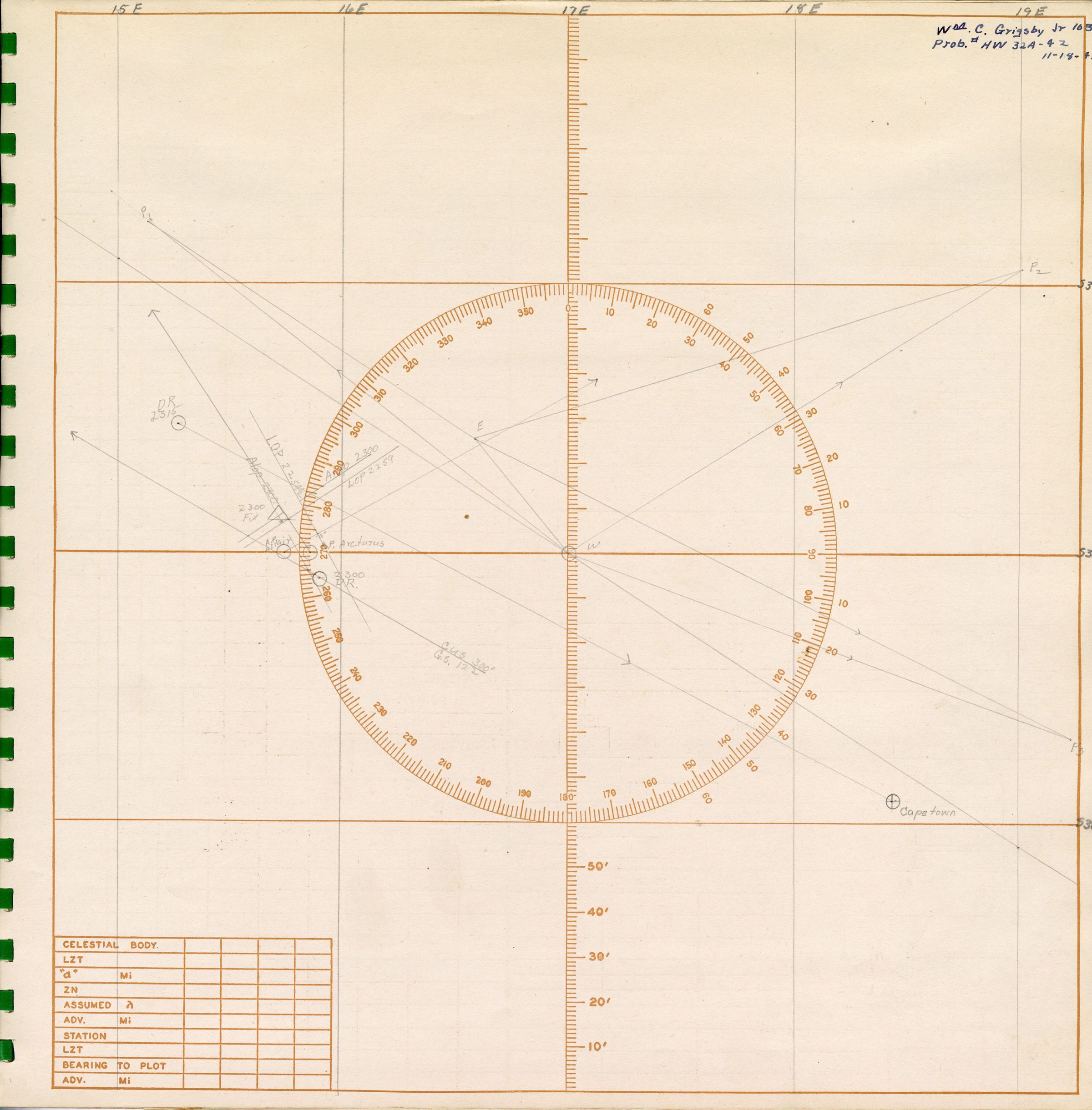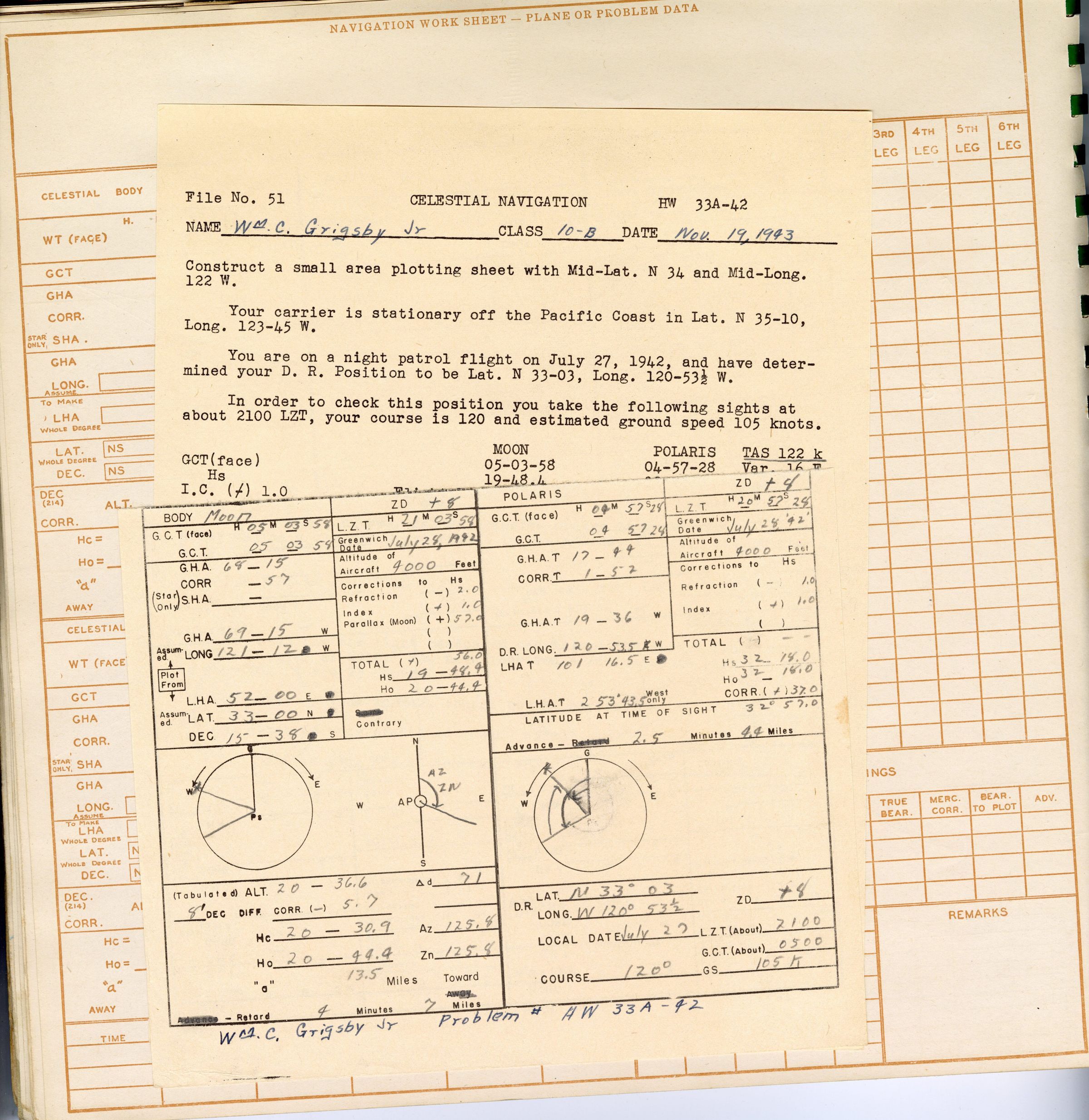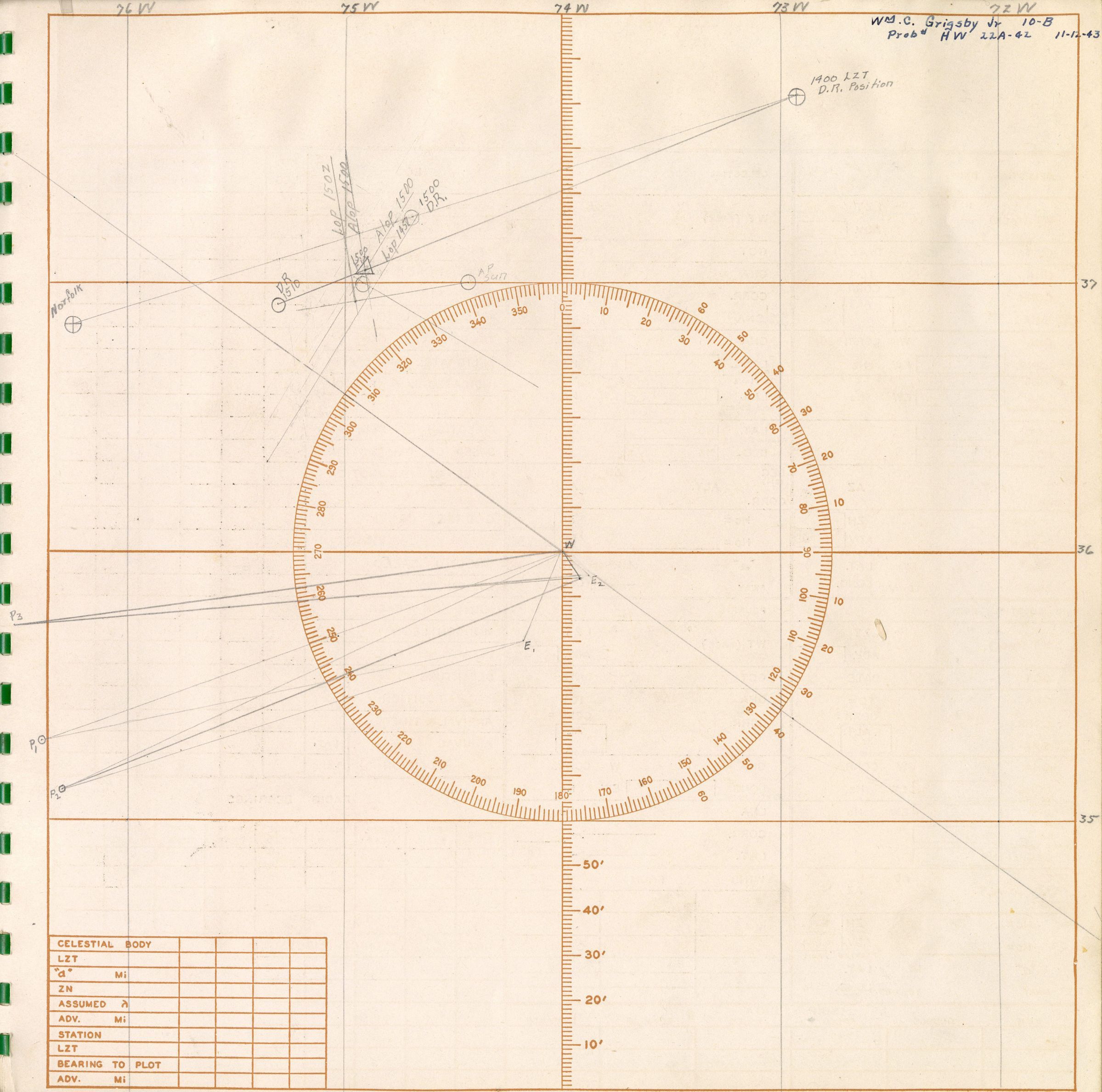 A celestial navigation practice notebook used by William Grigsby during his US Navy pilot training. Grigsby's handwritten notes and drawings can be seen throughout the notebook.Context