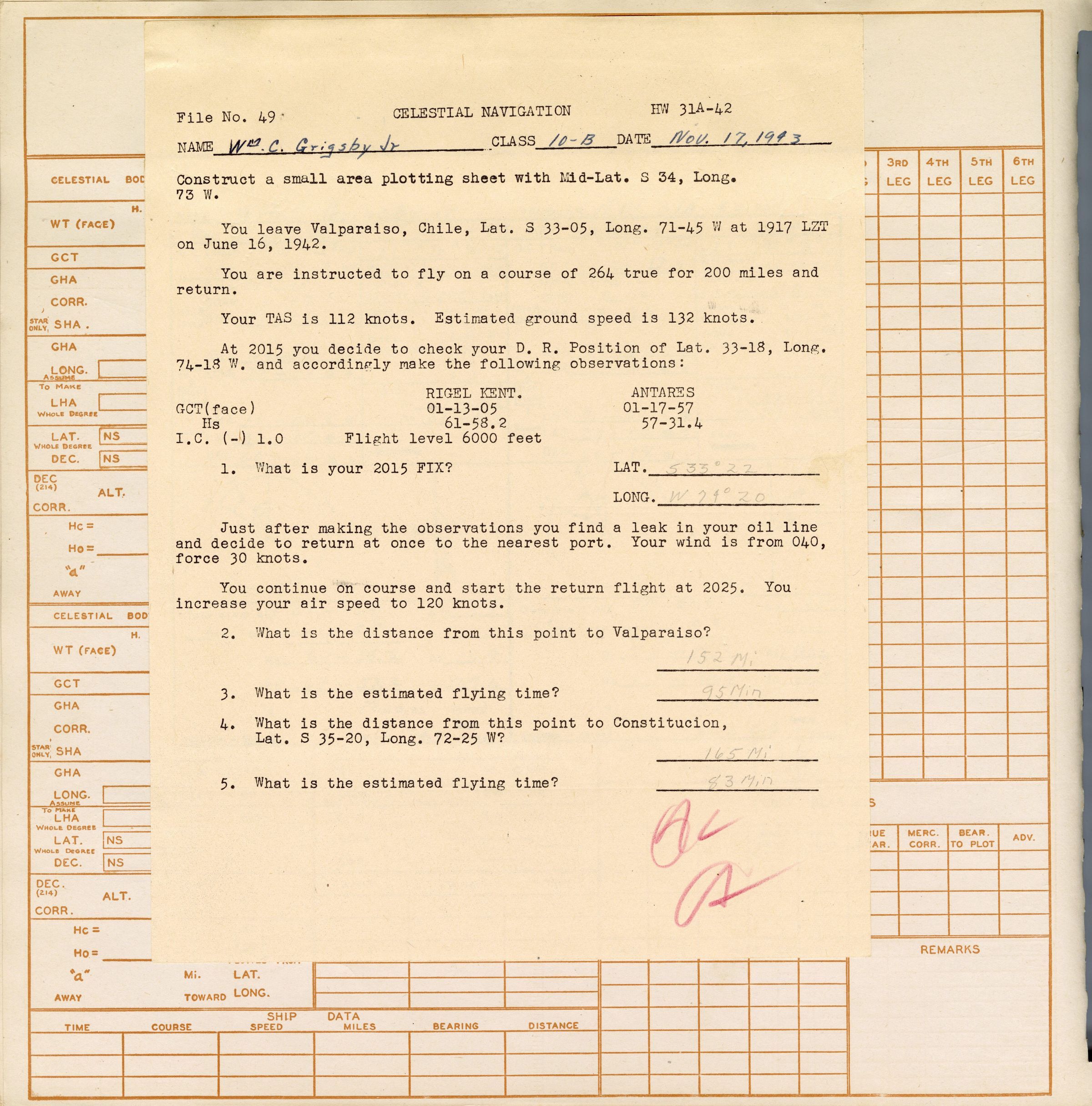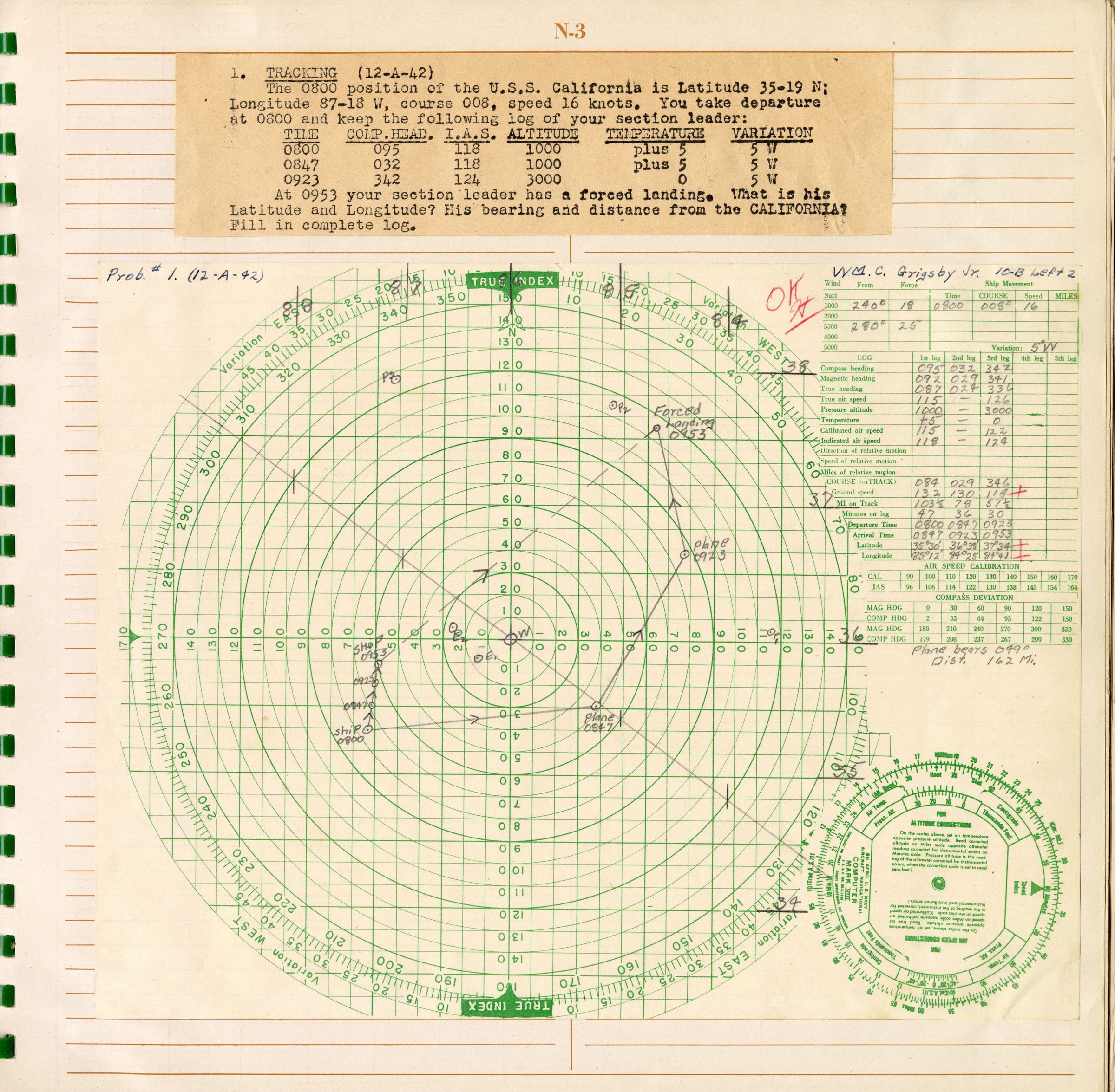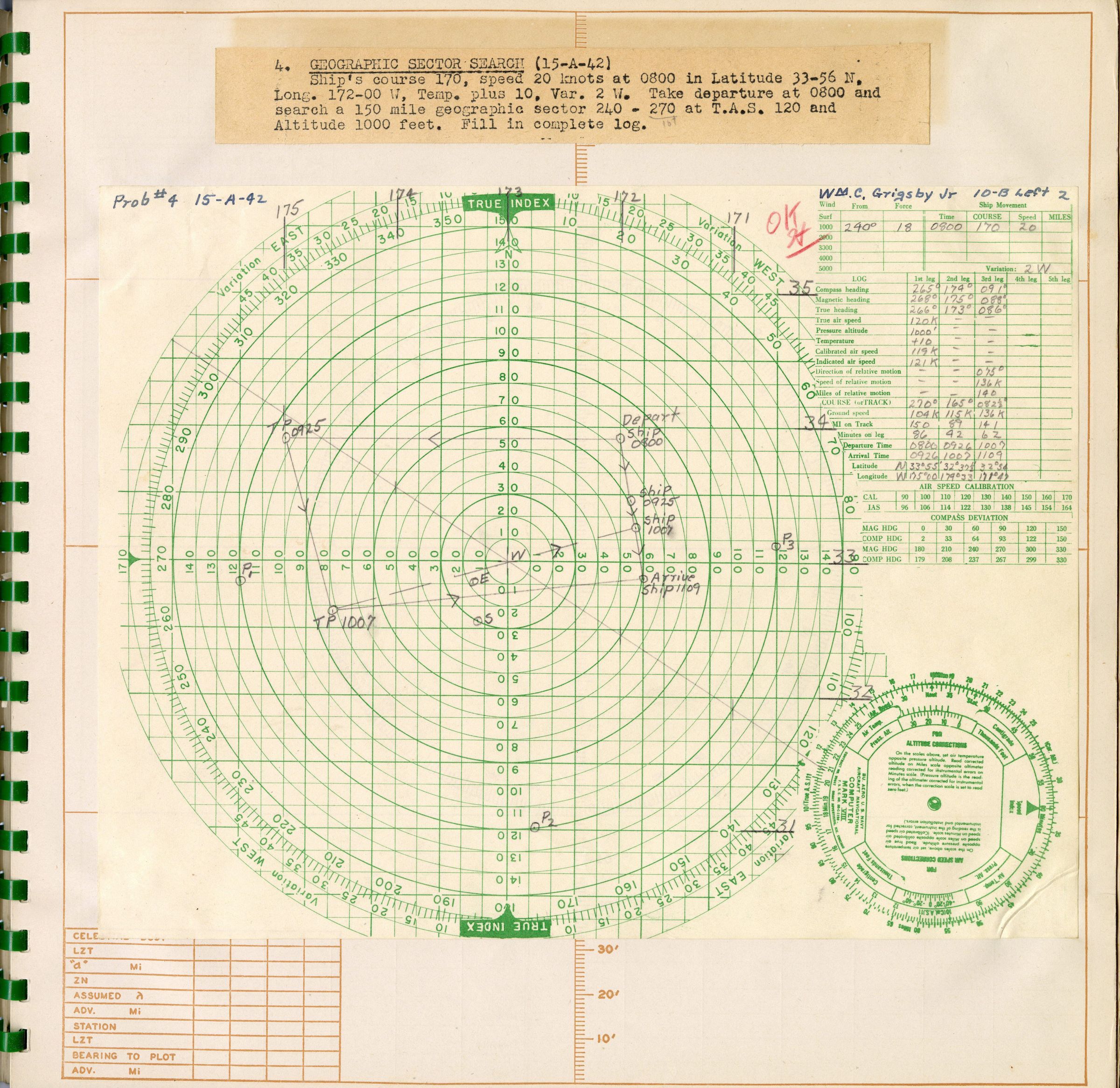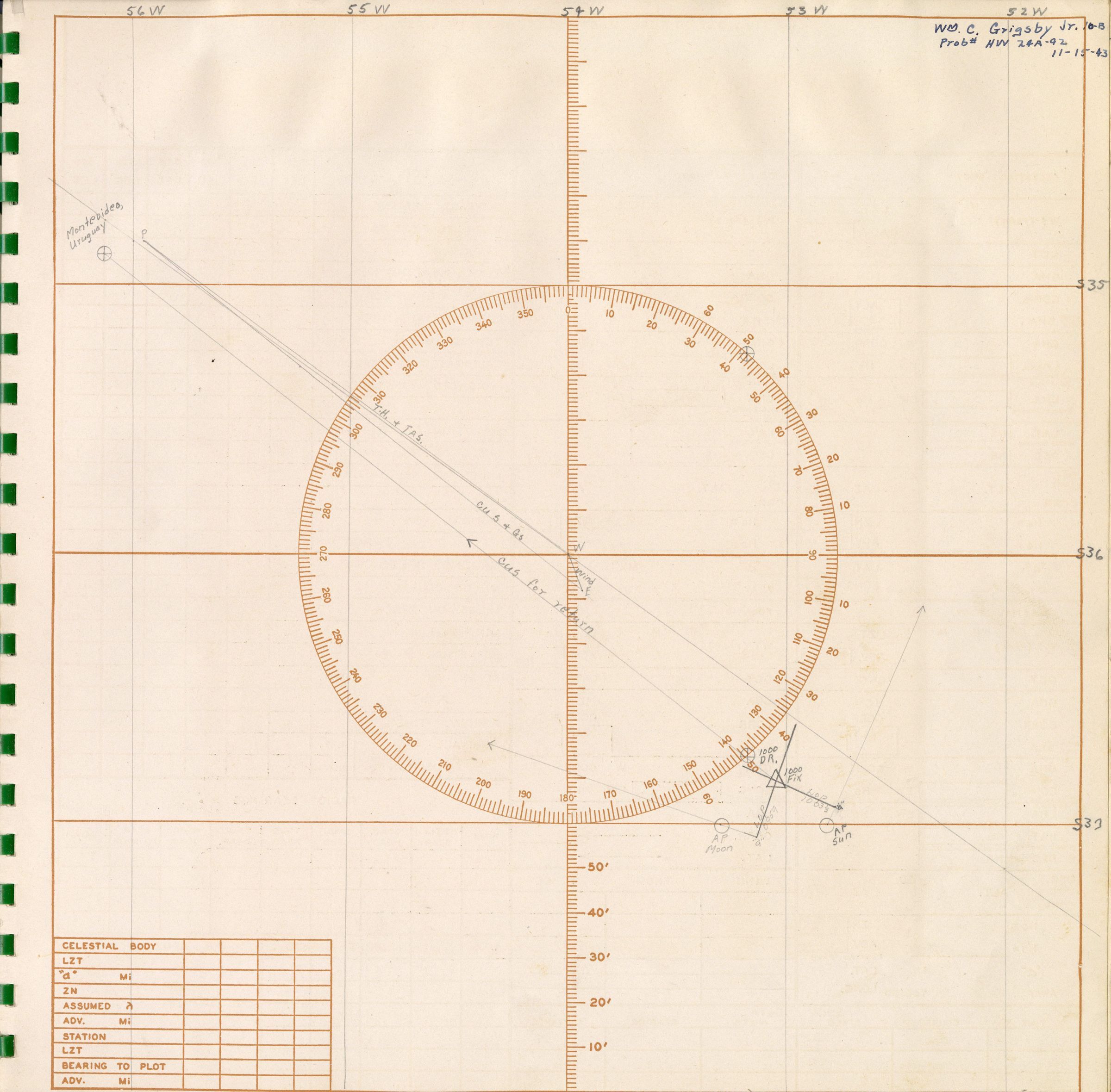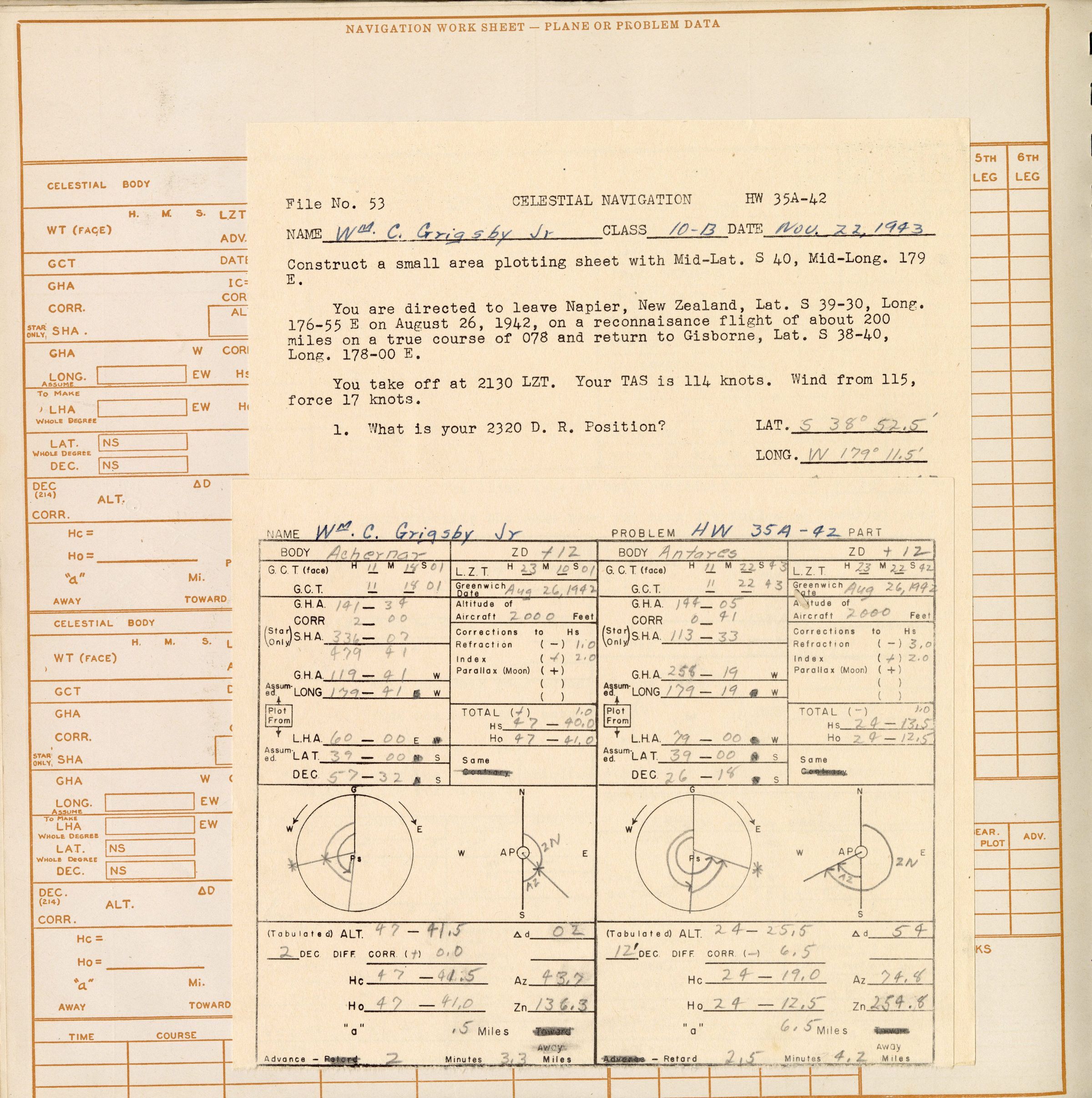 A celestial navigation practice notebook used by William Grigsby during his US Navy pilot training. Grigsby's handwritten notes and drawings can be seen throughout the notebook.Context