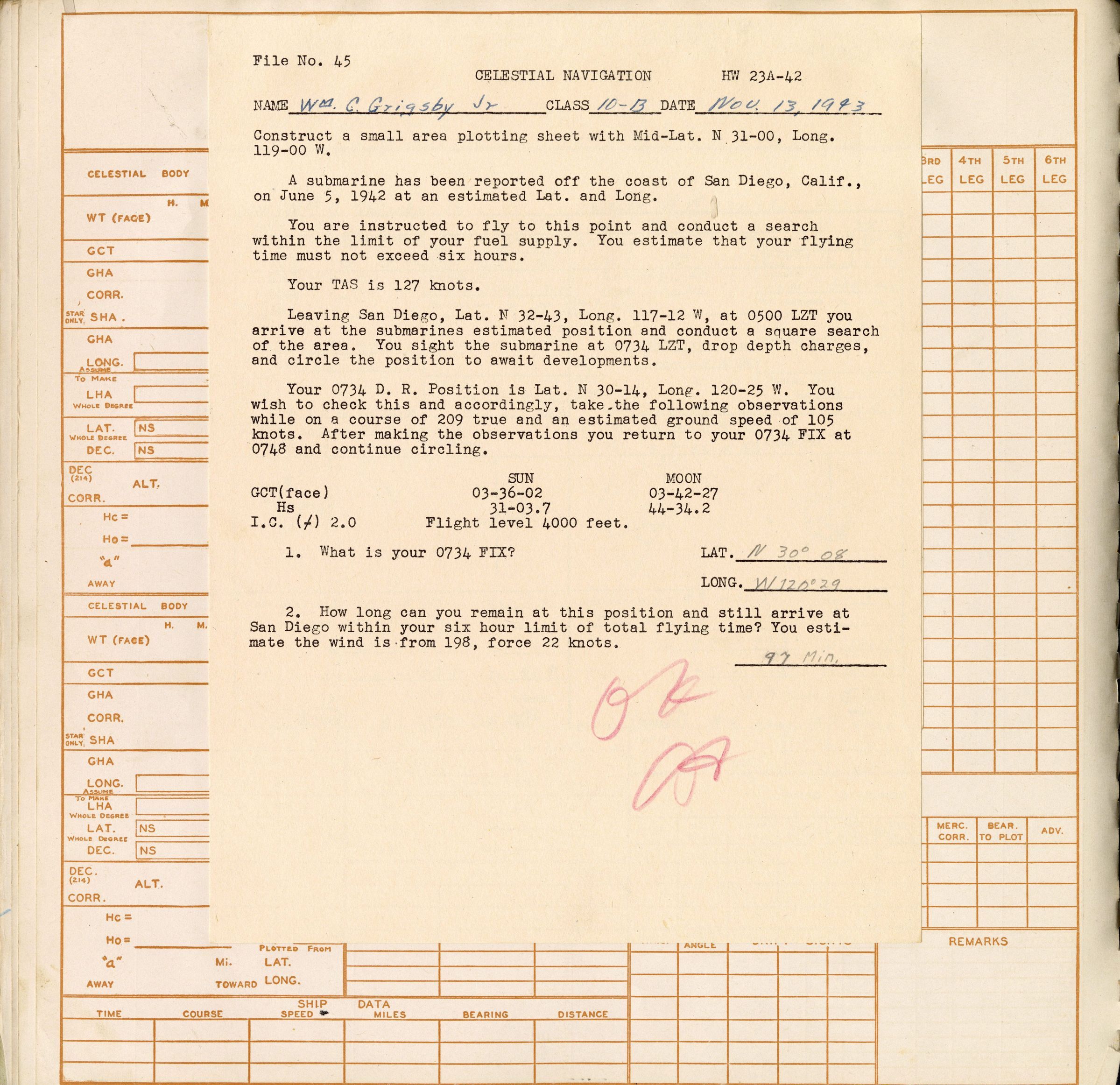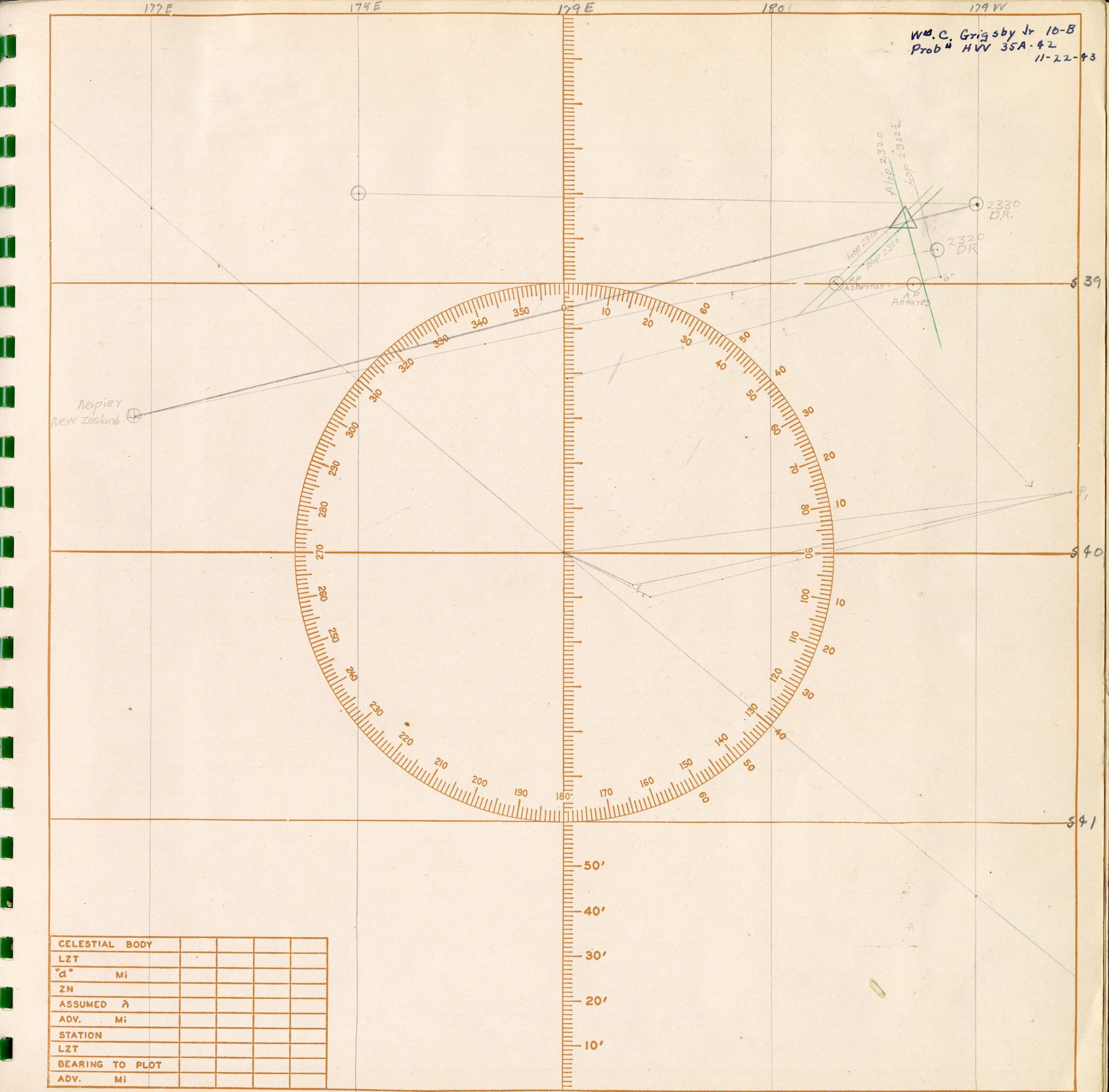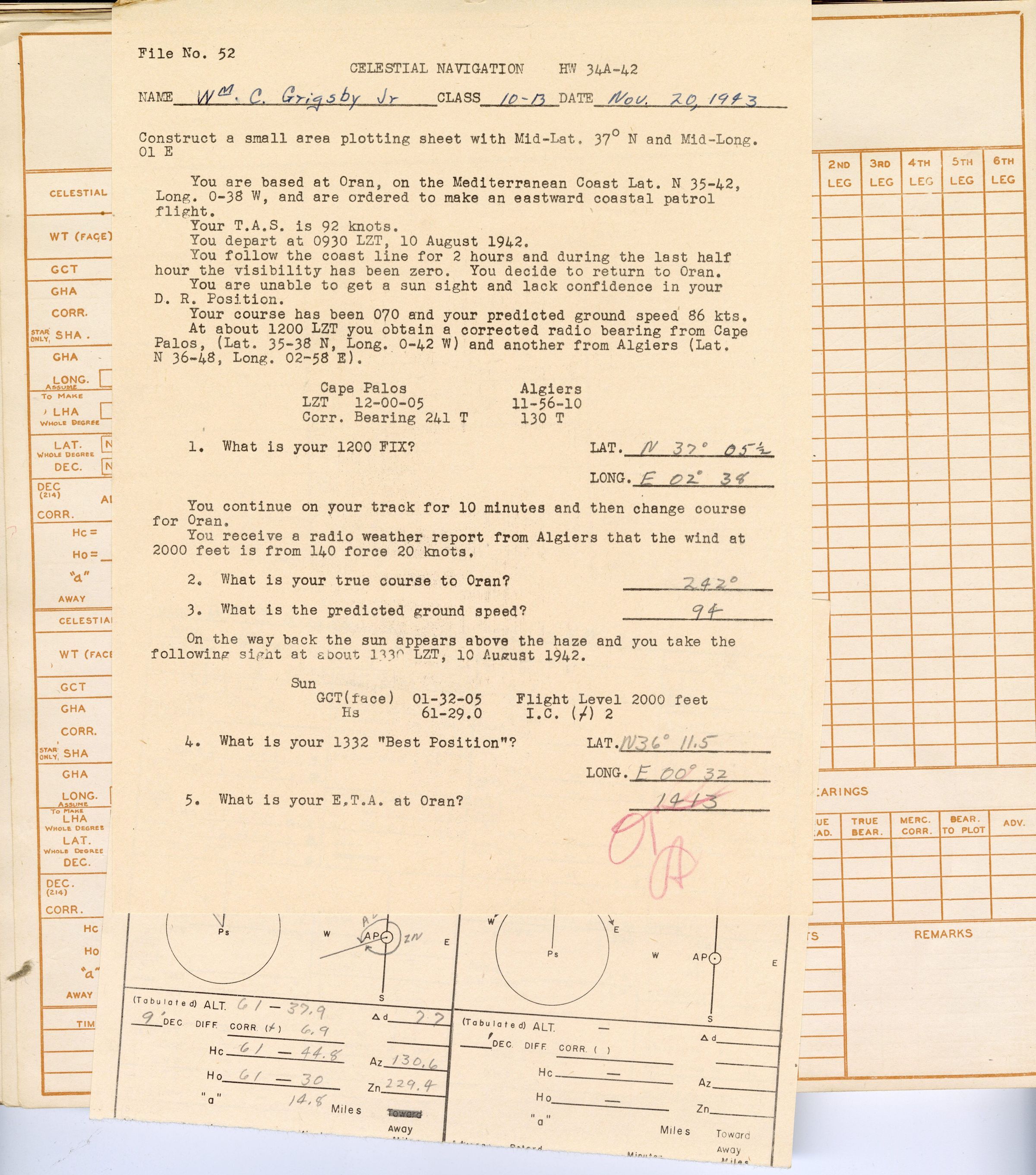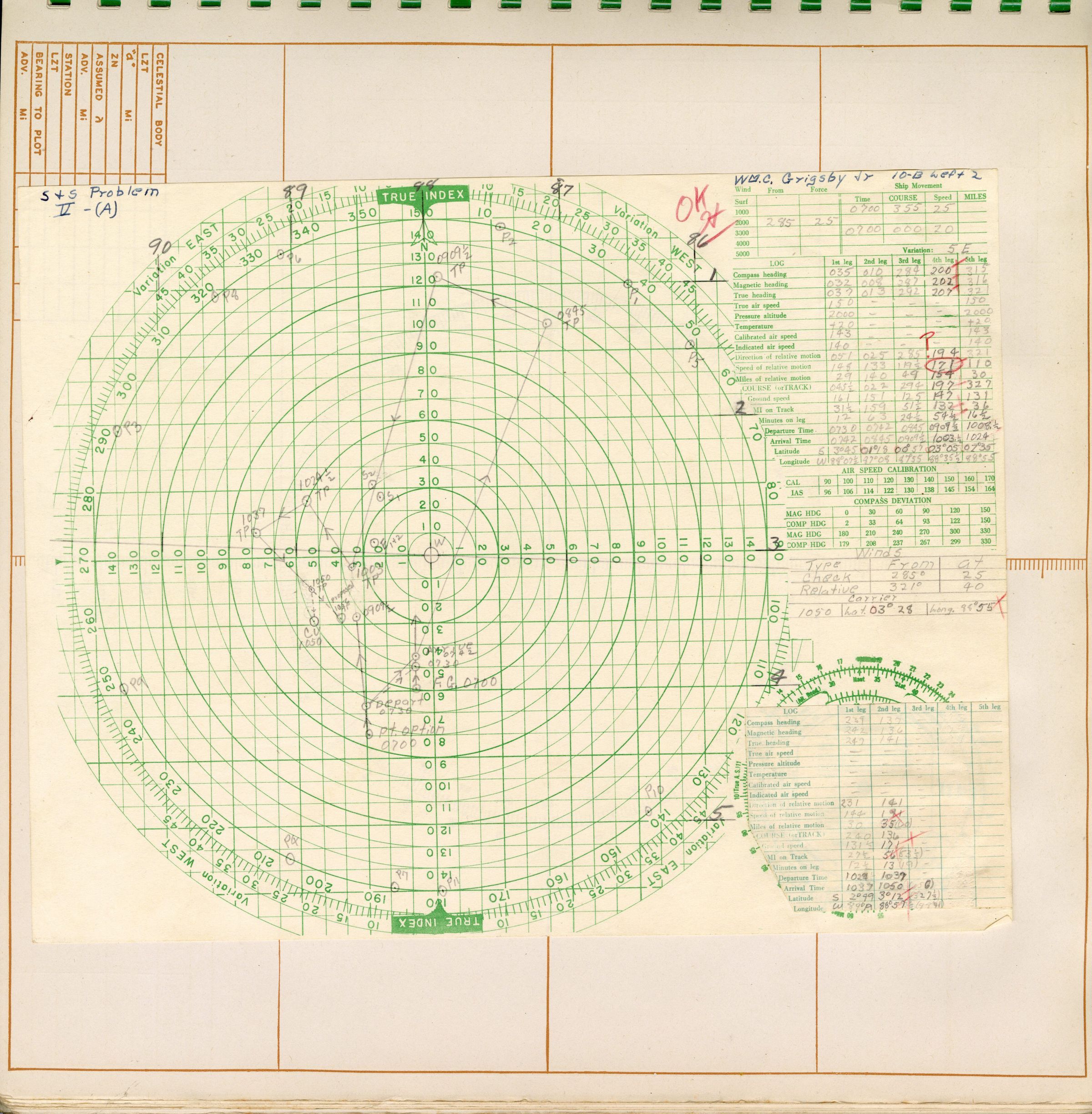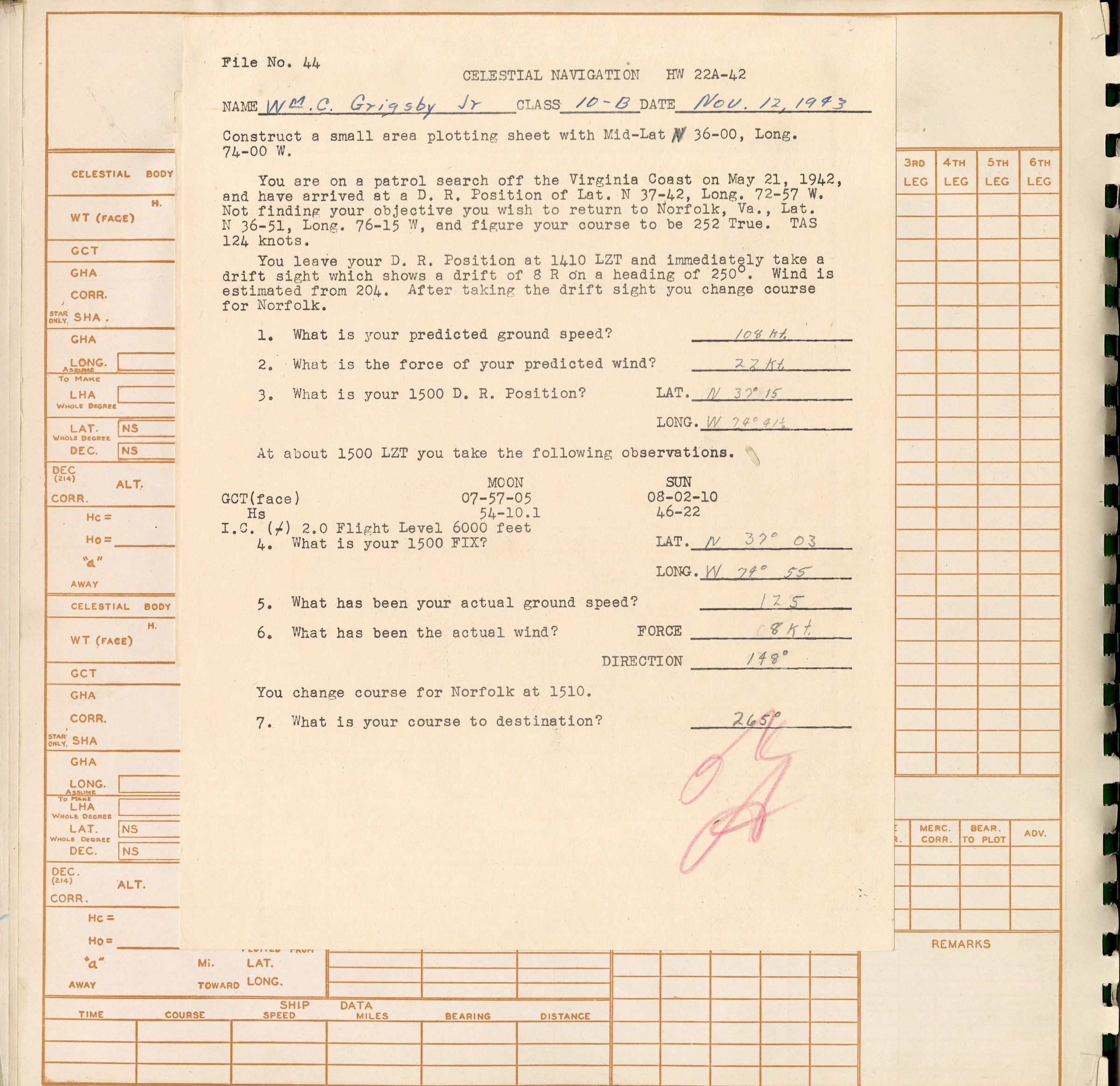 A celestial navigation practice notebook used by William Grigsby during his US Navy pilot training. Grigsby's handwritten notes and drawings can be seen throughout the notebook.Context