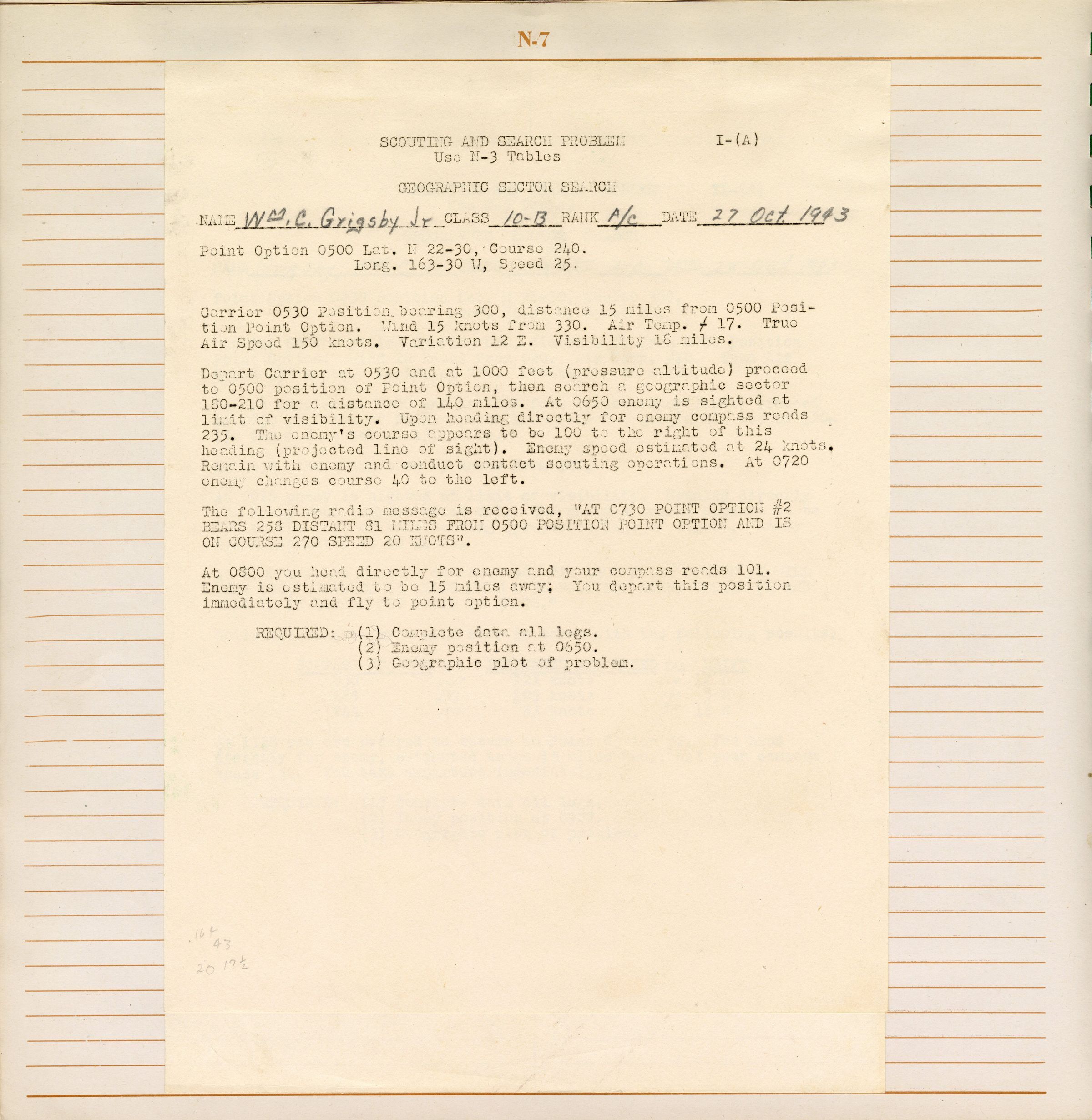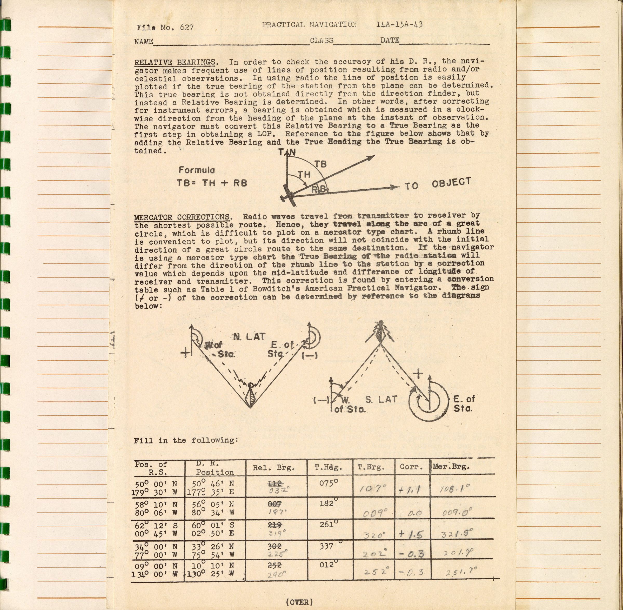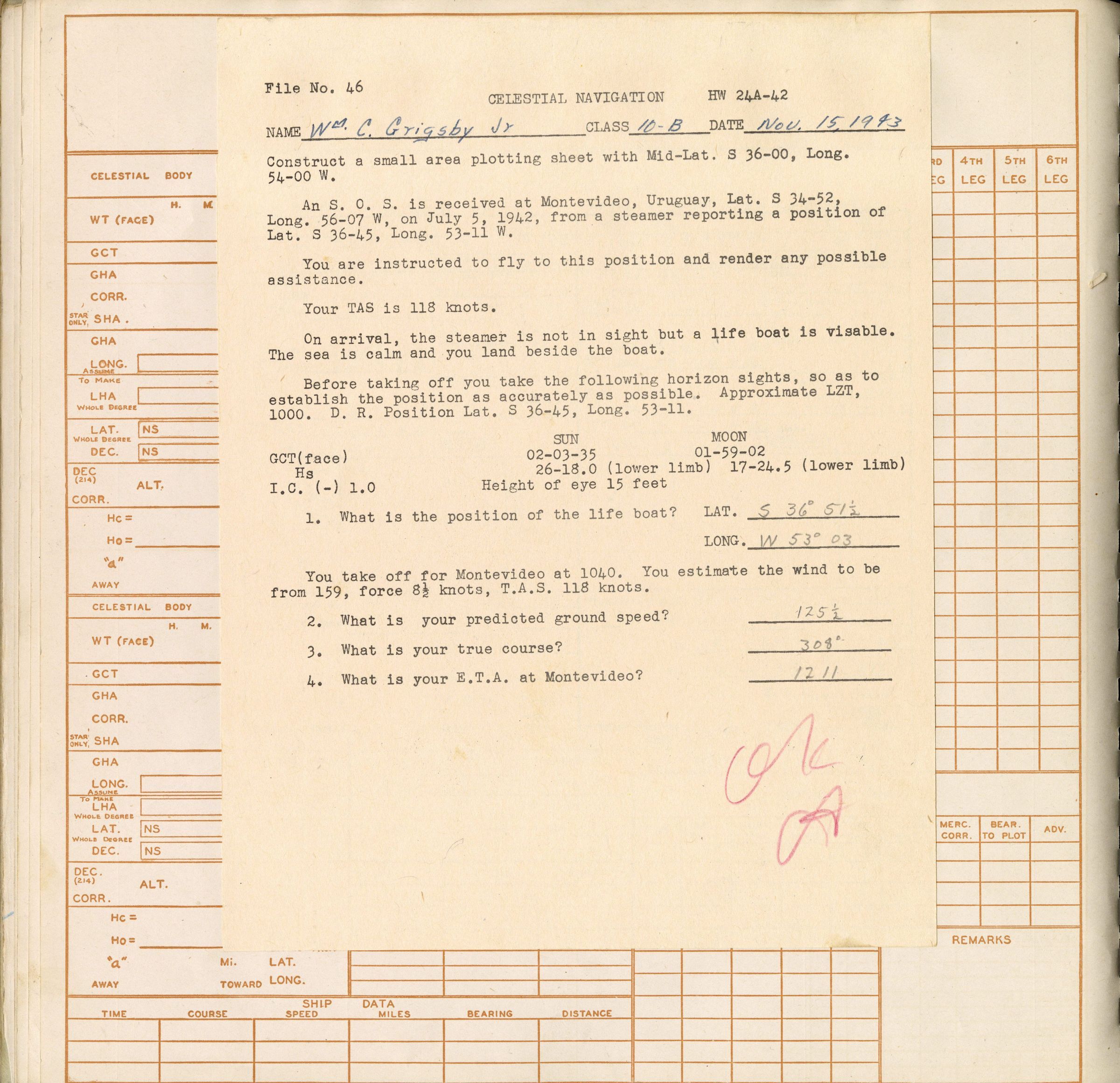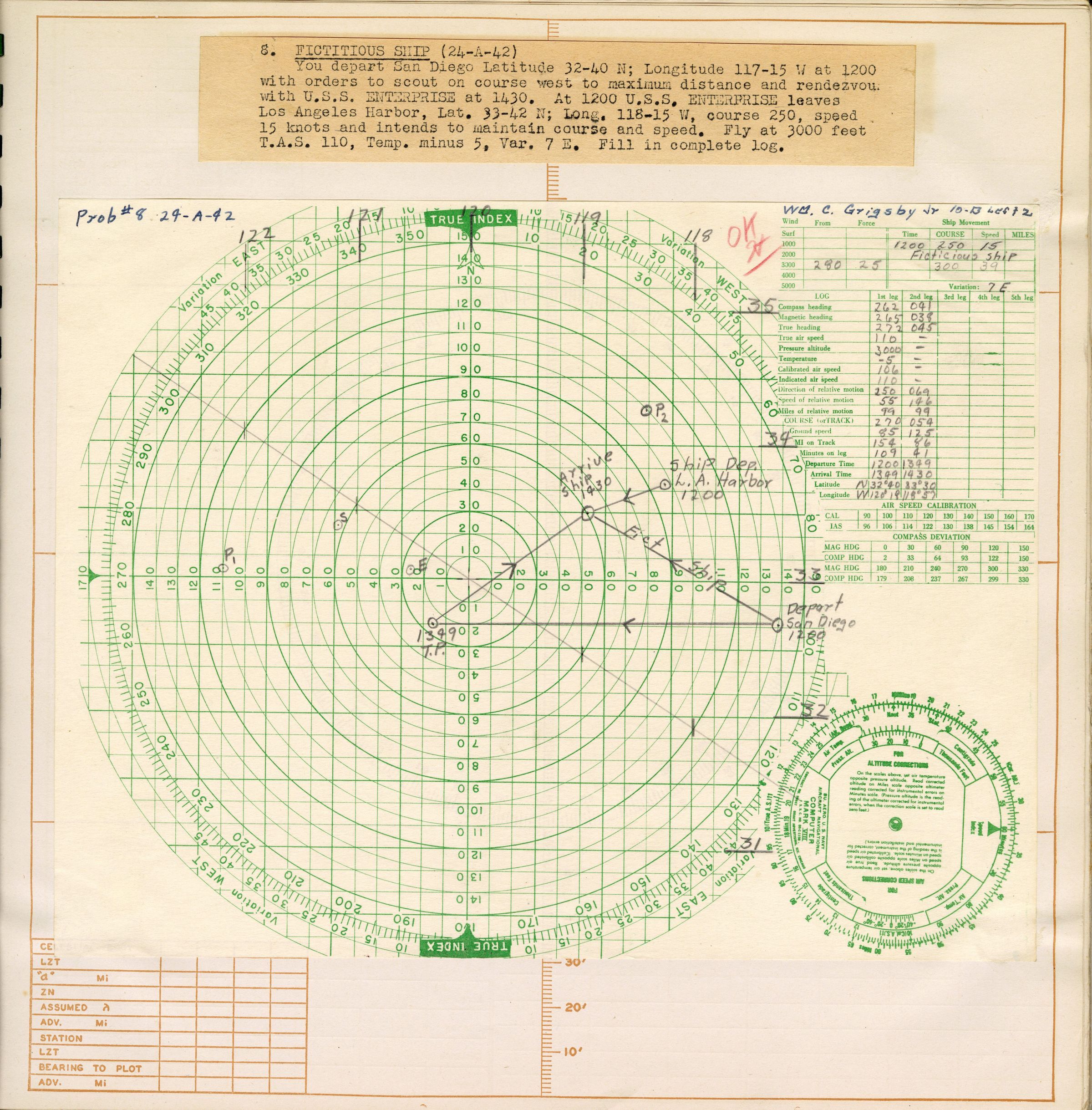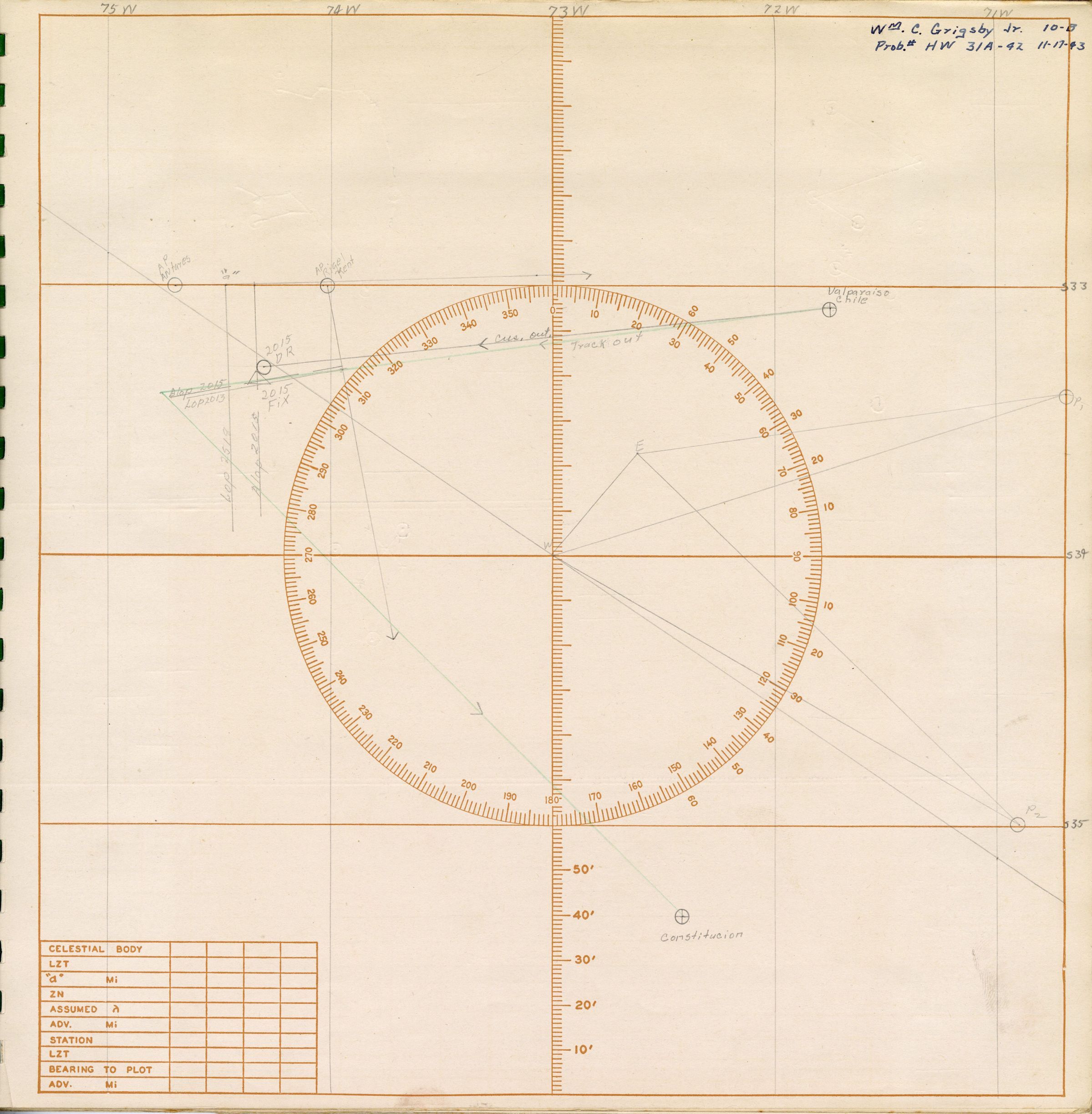 A celestial navigation practice notebook used by William Grigsby during his US Navy pilot training. Grigsby's handwritten notes and drawings can be seen throughout the notebook.Context