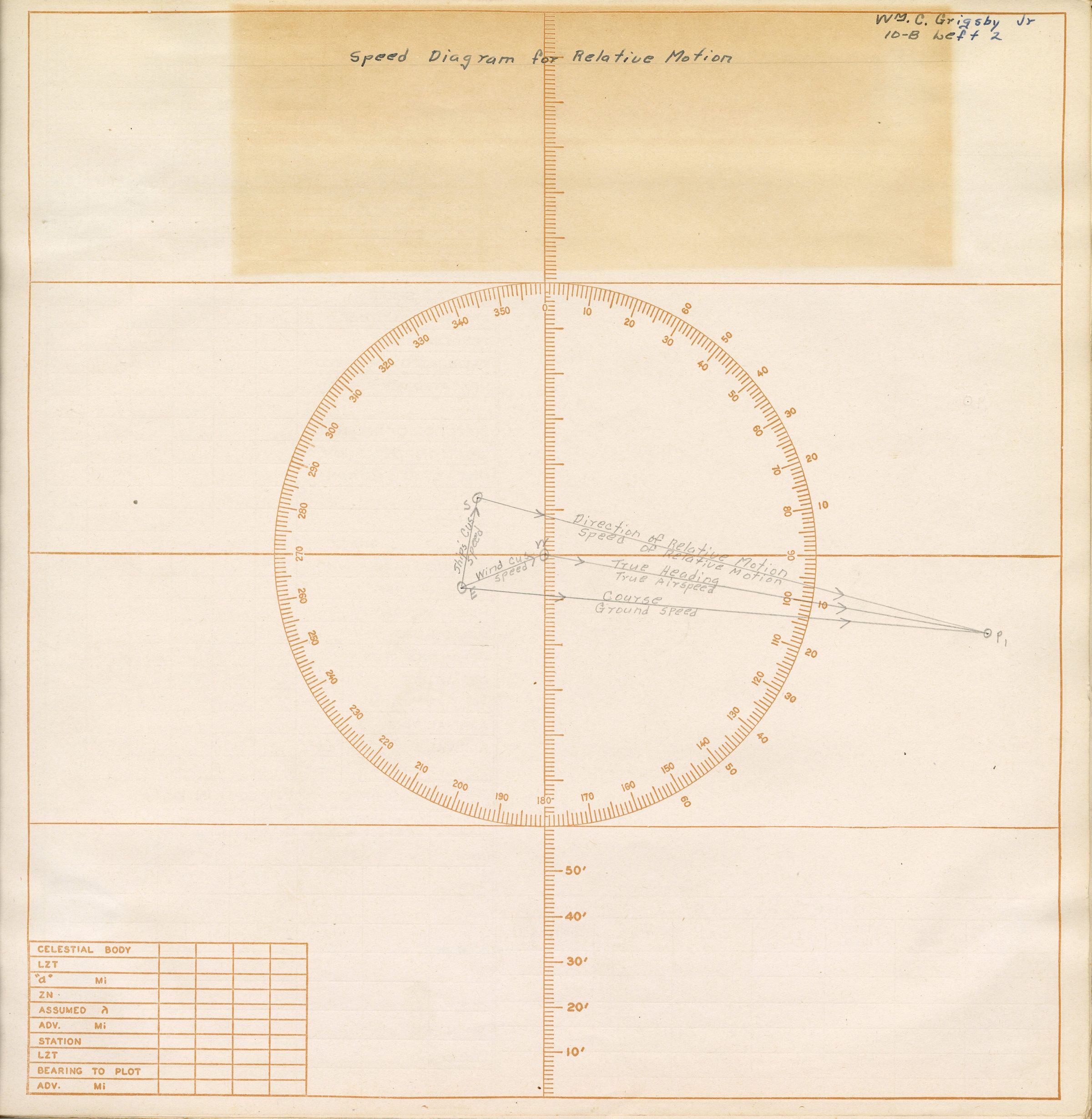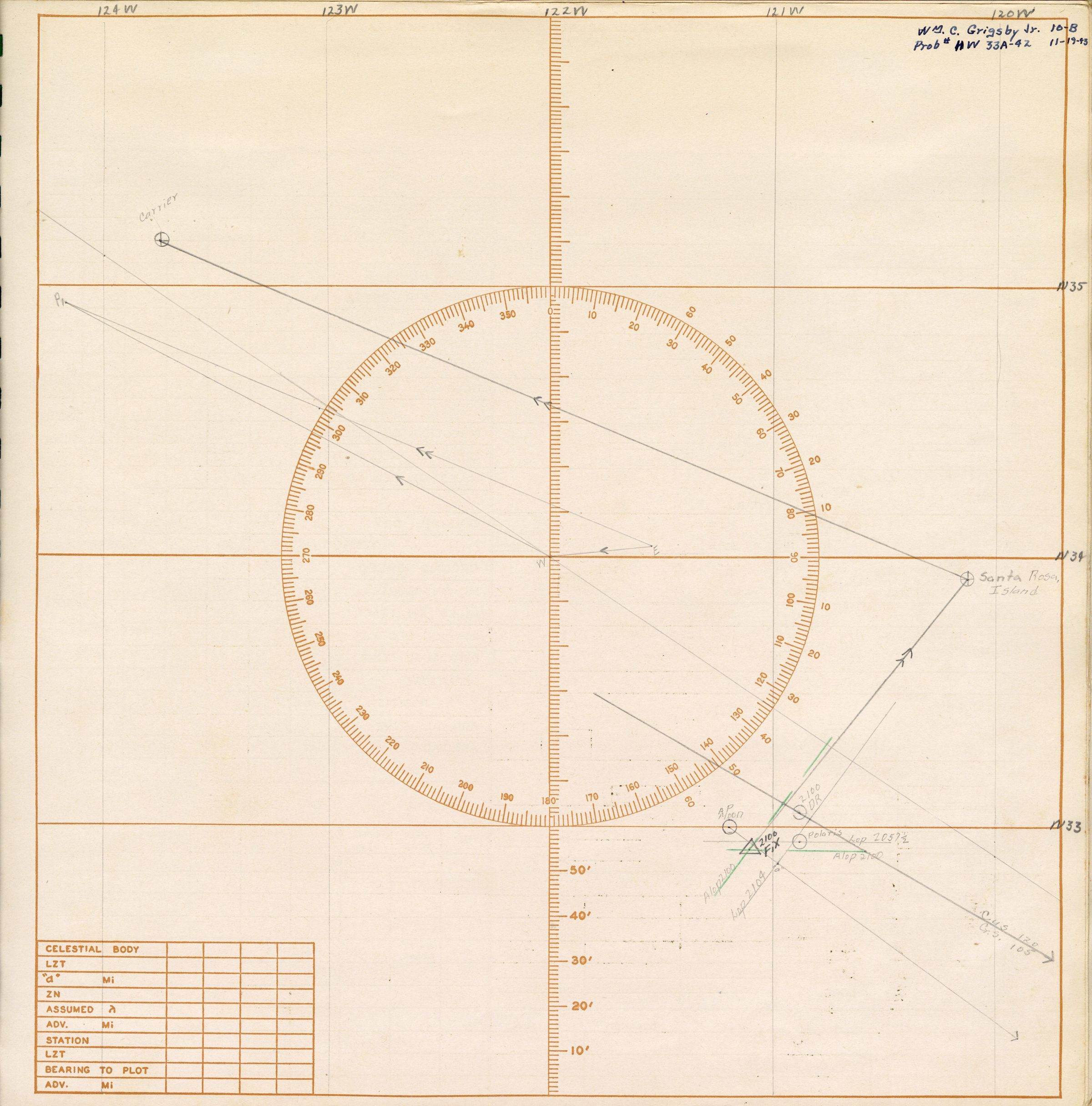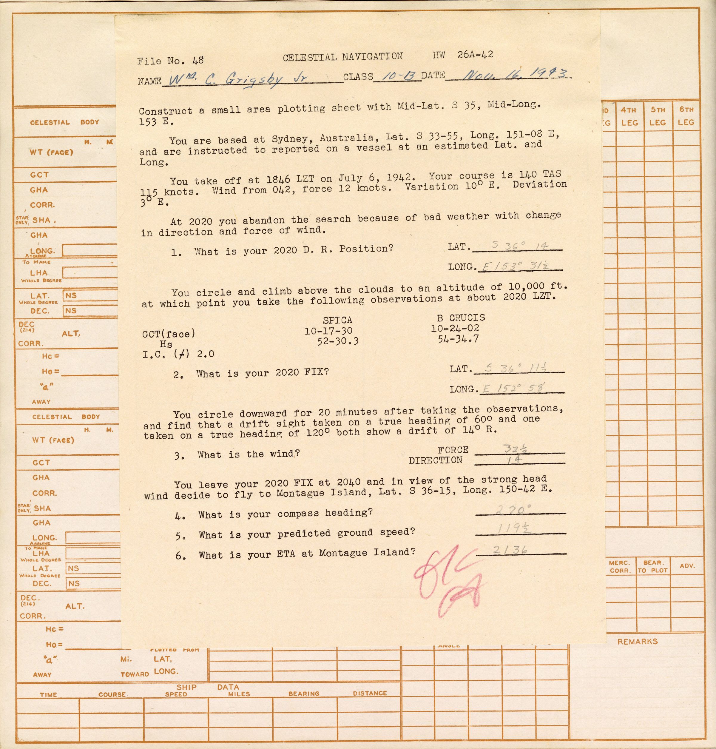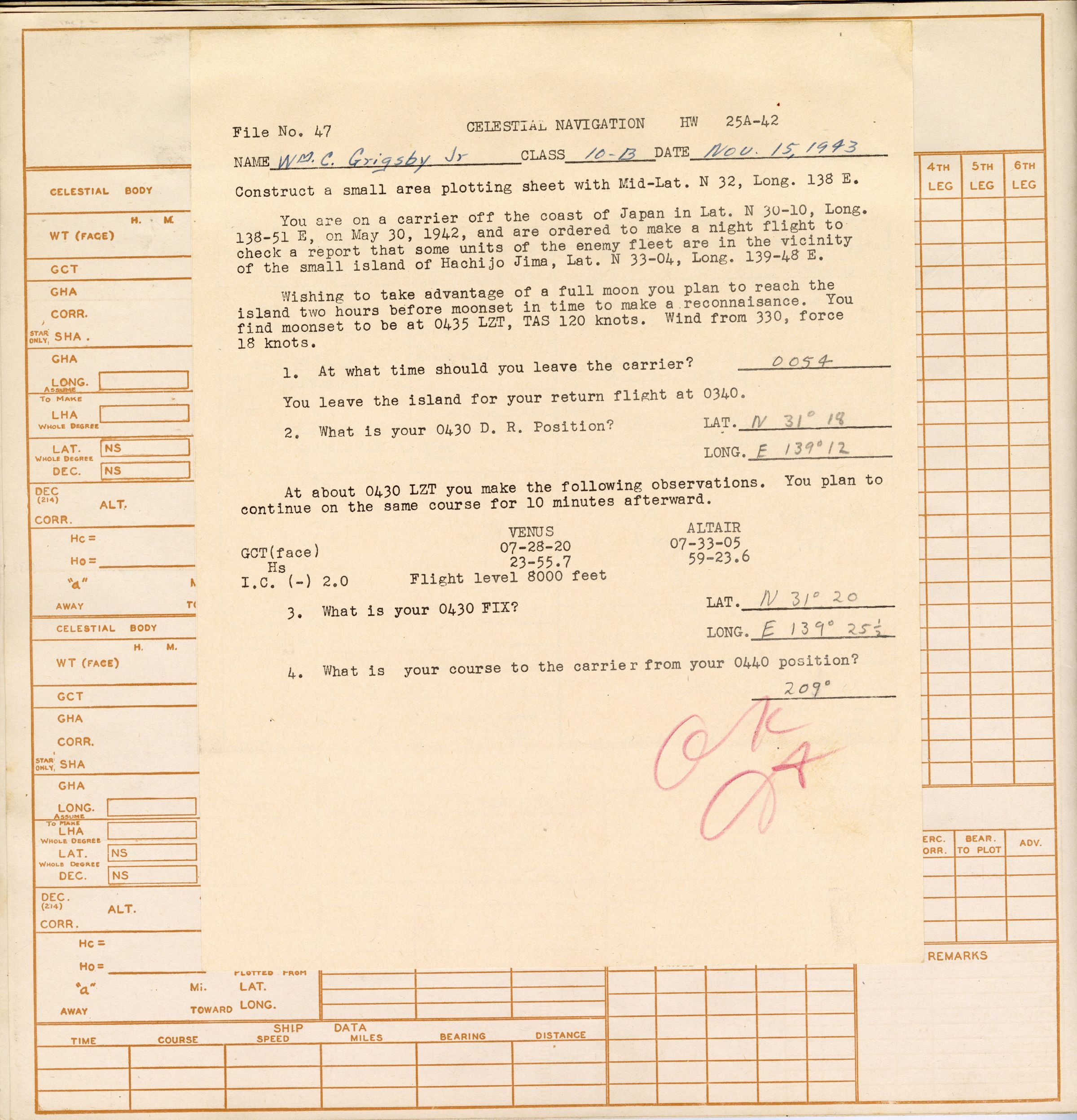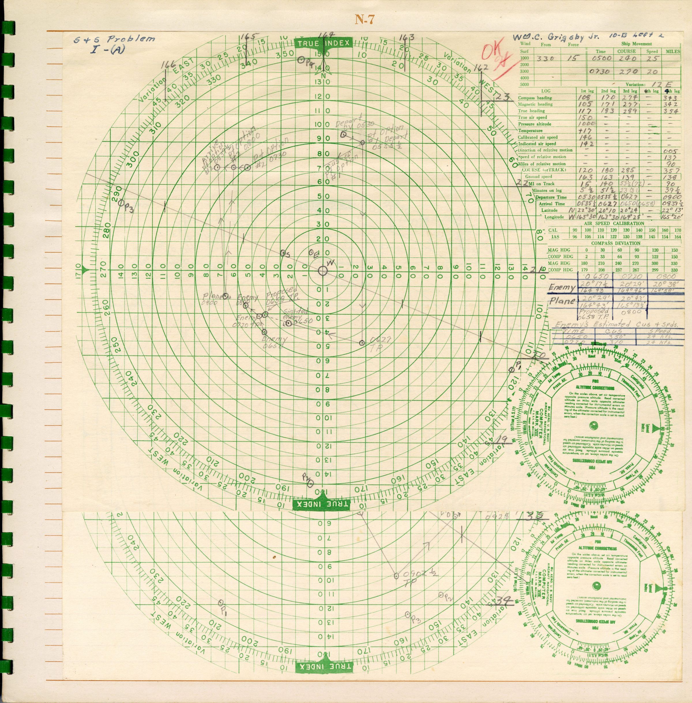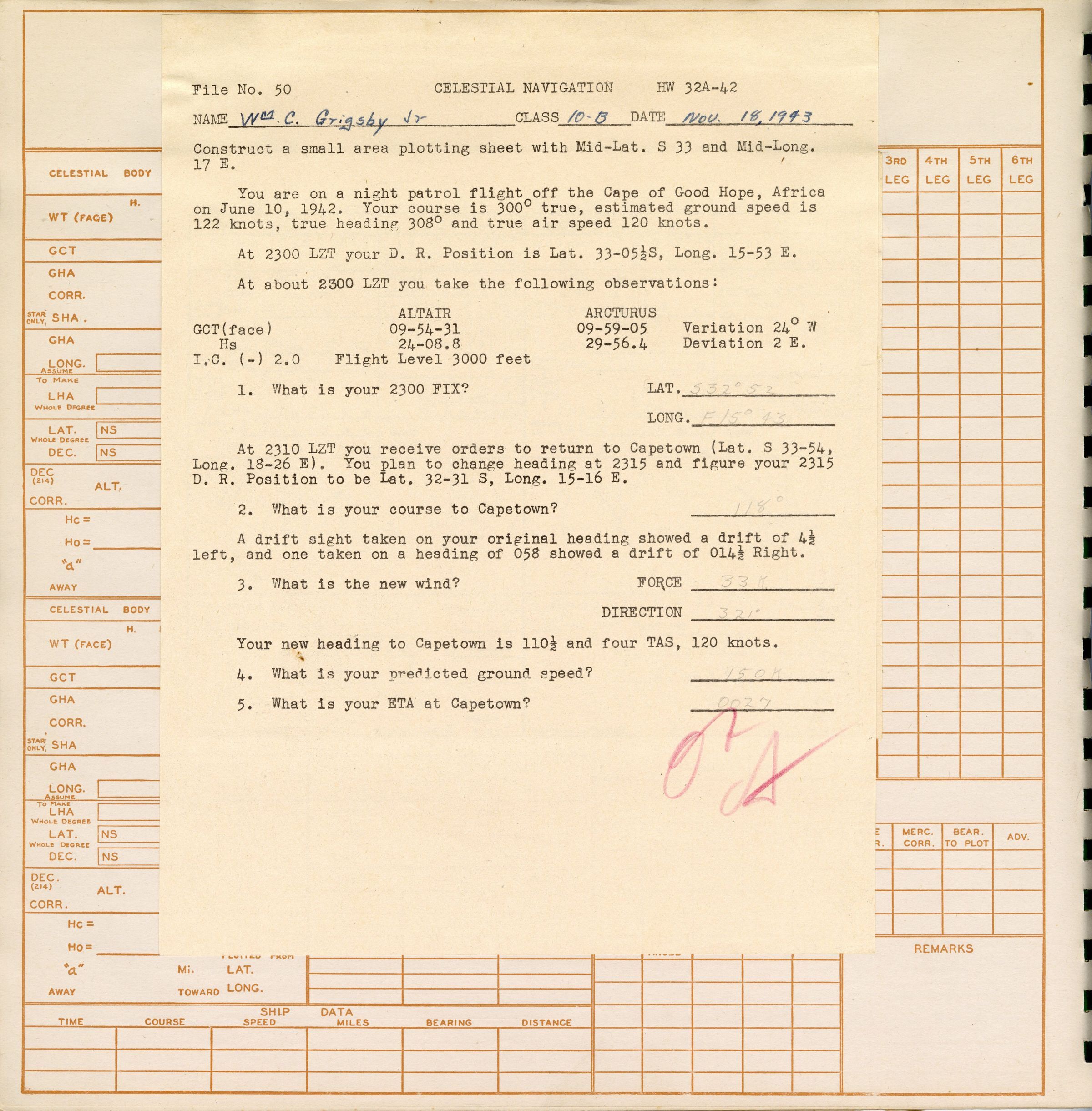 A celestial navigation practice notebook used by William Grigsby during his US Navy pilot training. Grigsby's handwritten notes and drawings can be seen throughout the notebook.Context