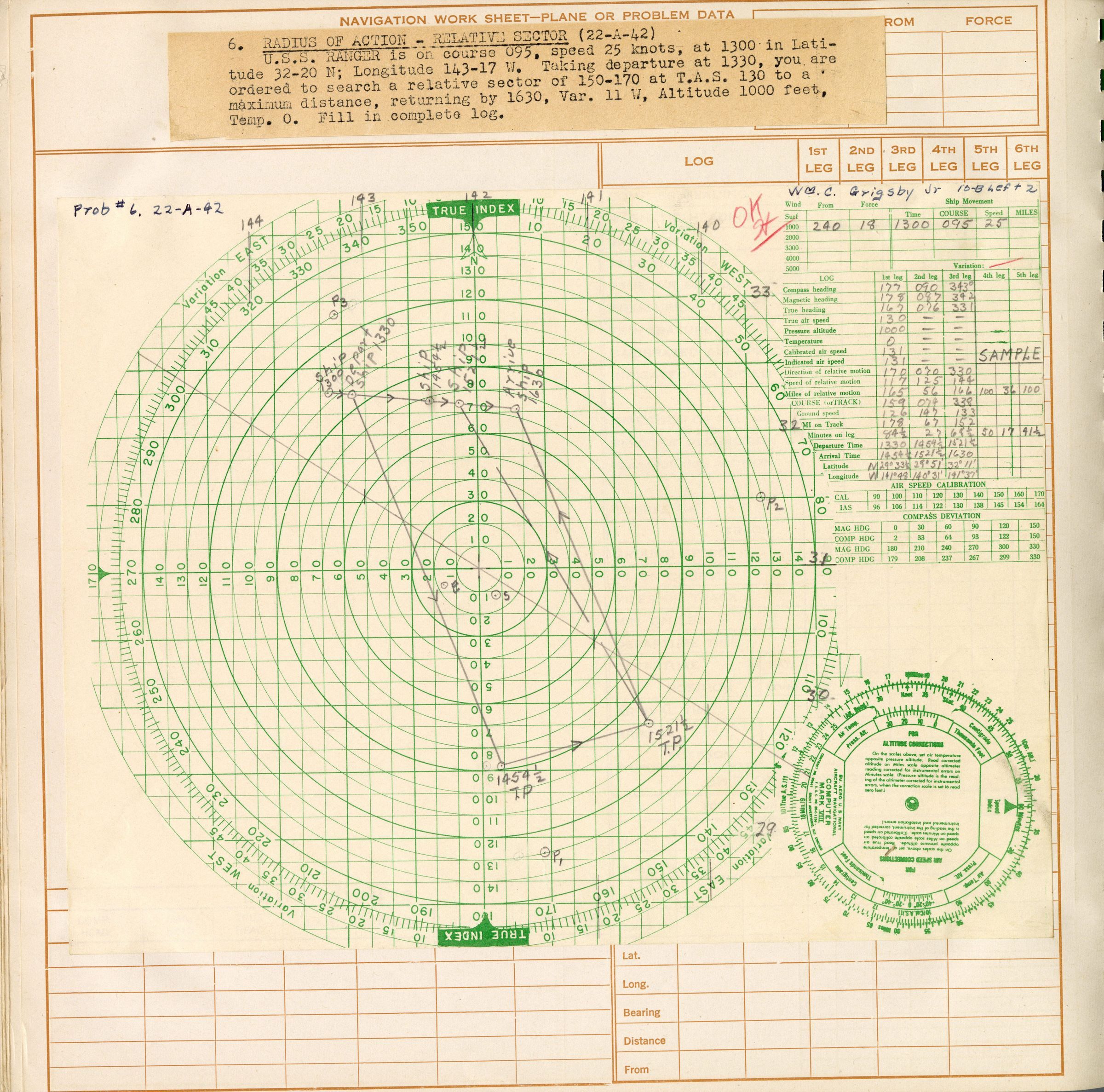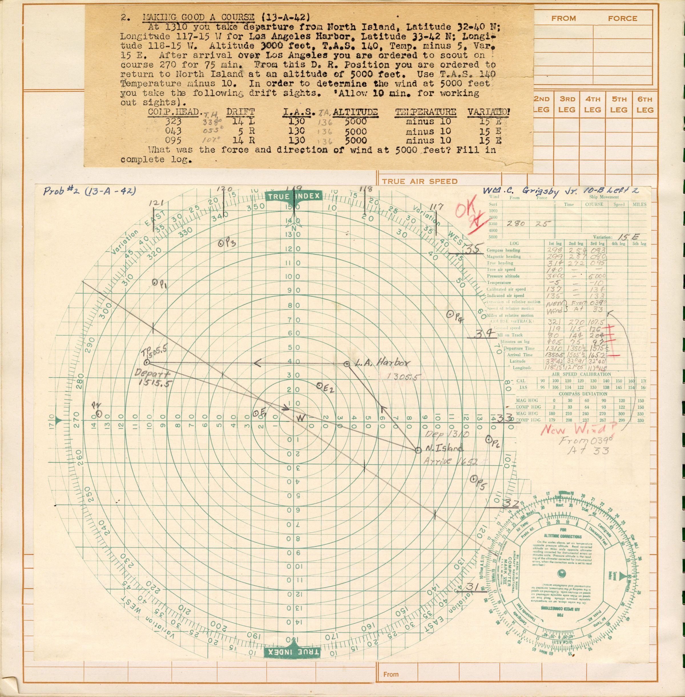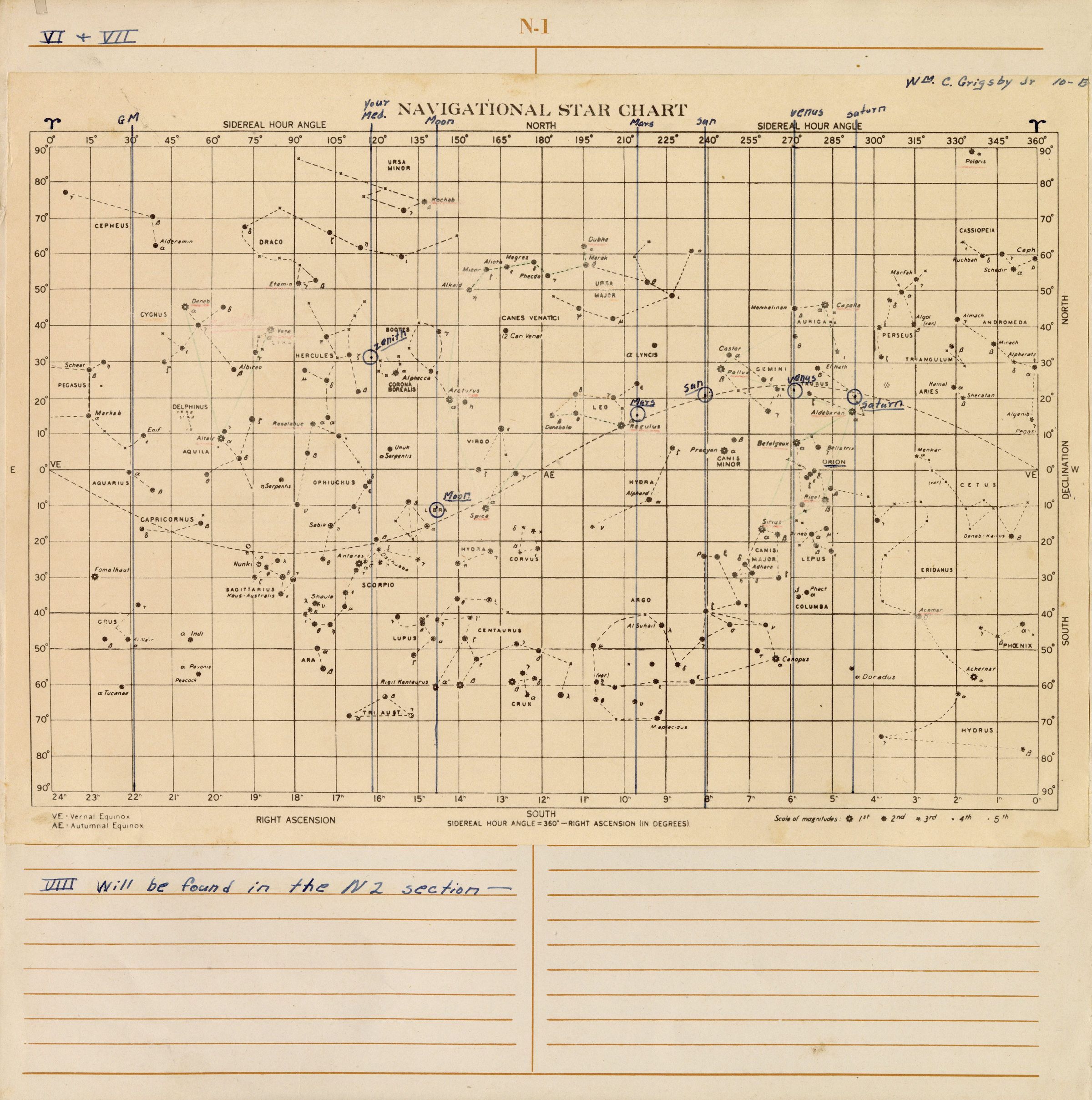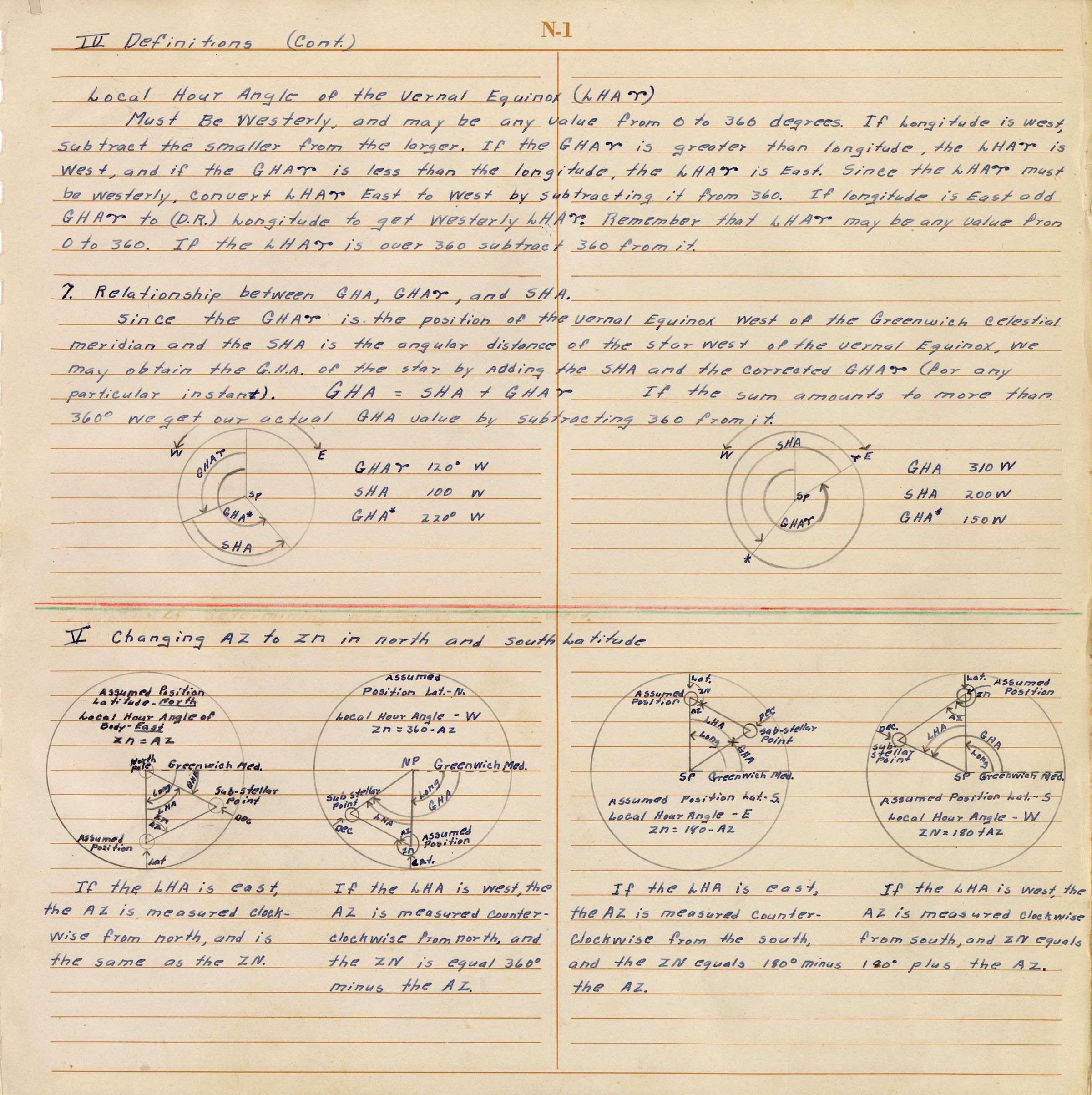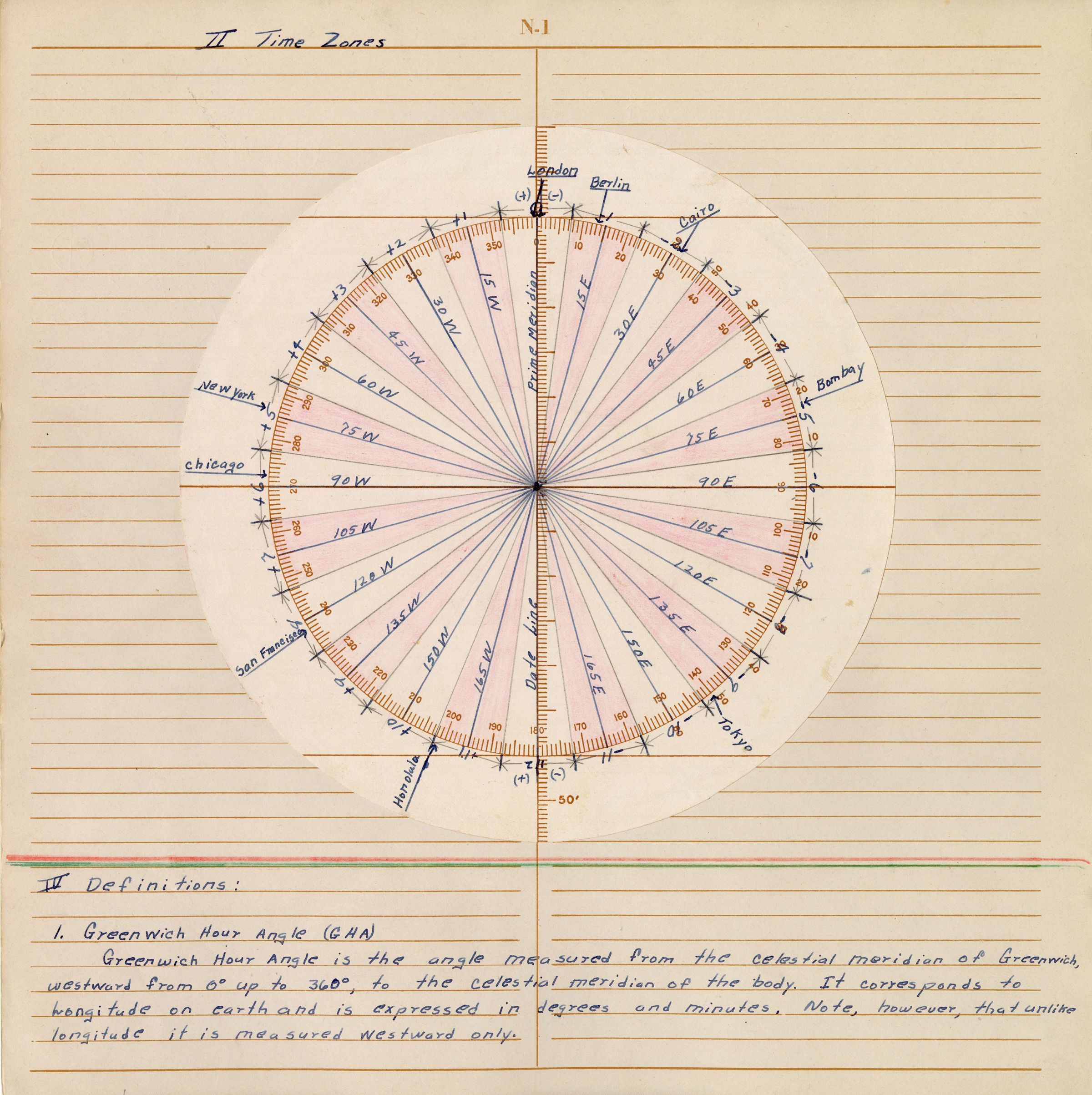 A celestial navigation practice notebook used by William Grigsby during his US Navy pilot training. Grigsby's handwritten notes and drawings can be seen throughout the notebook.Context