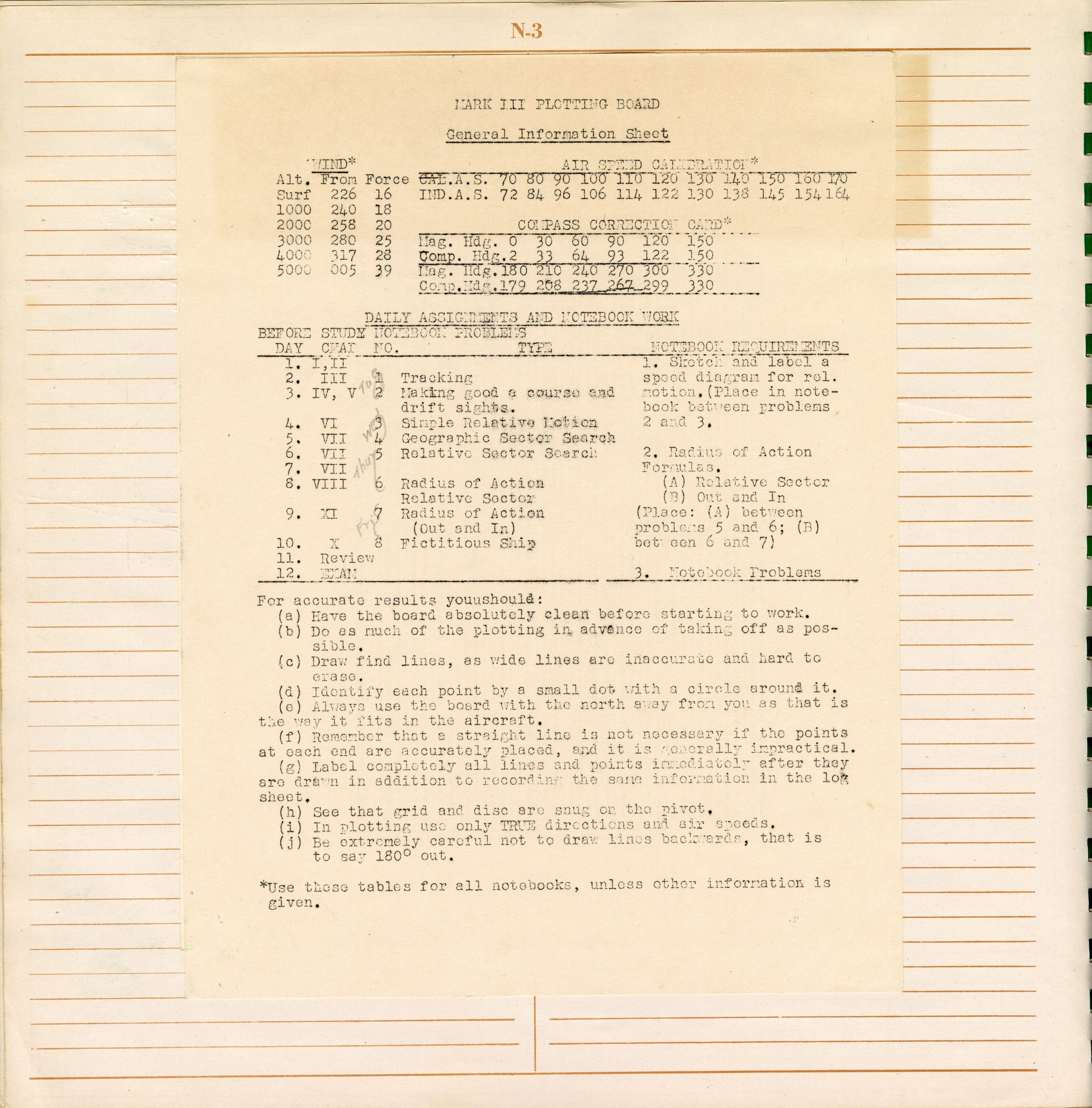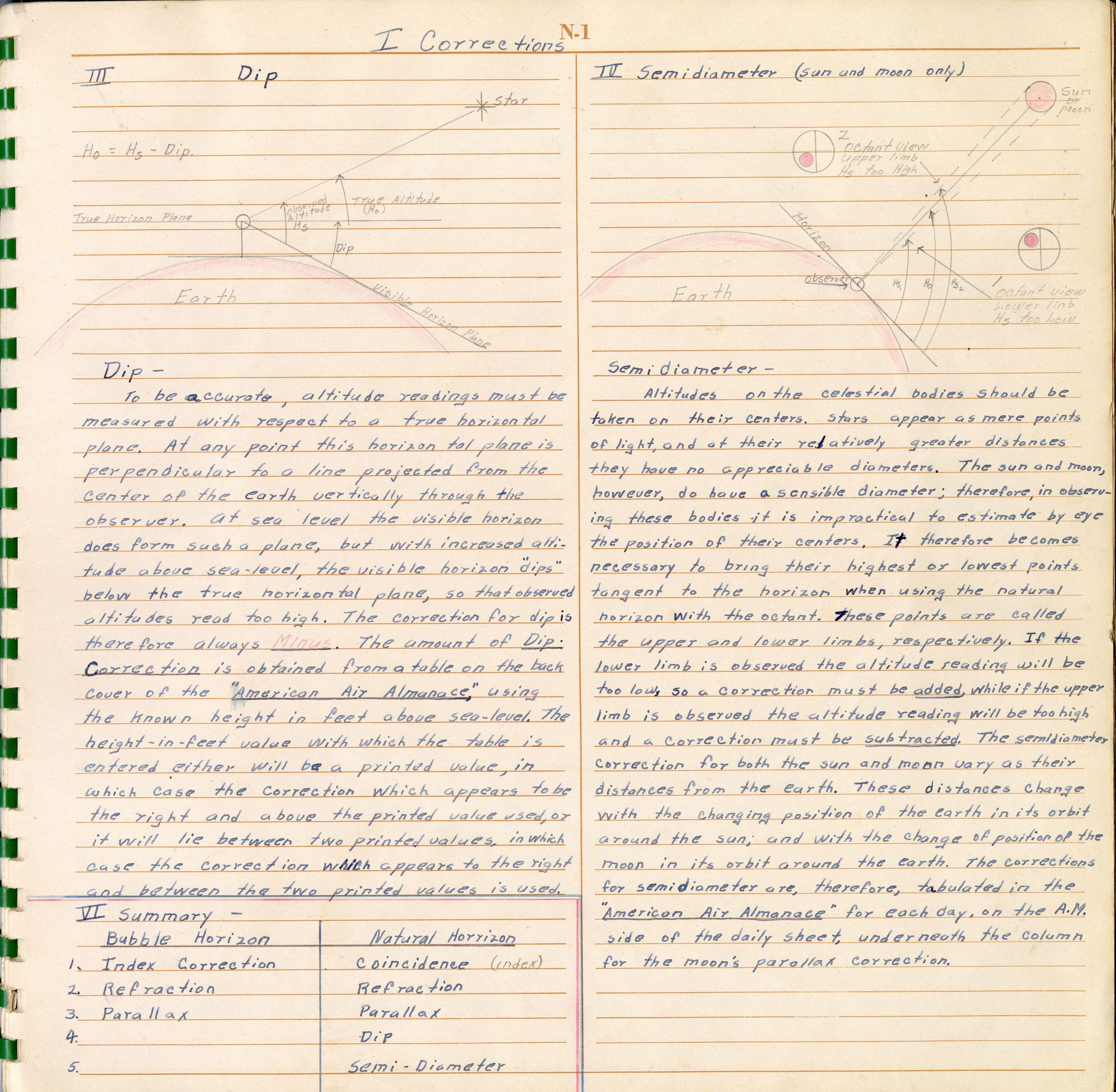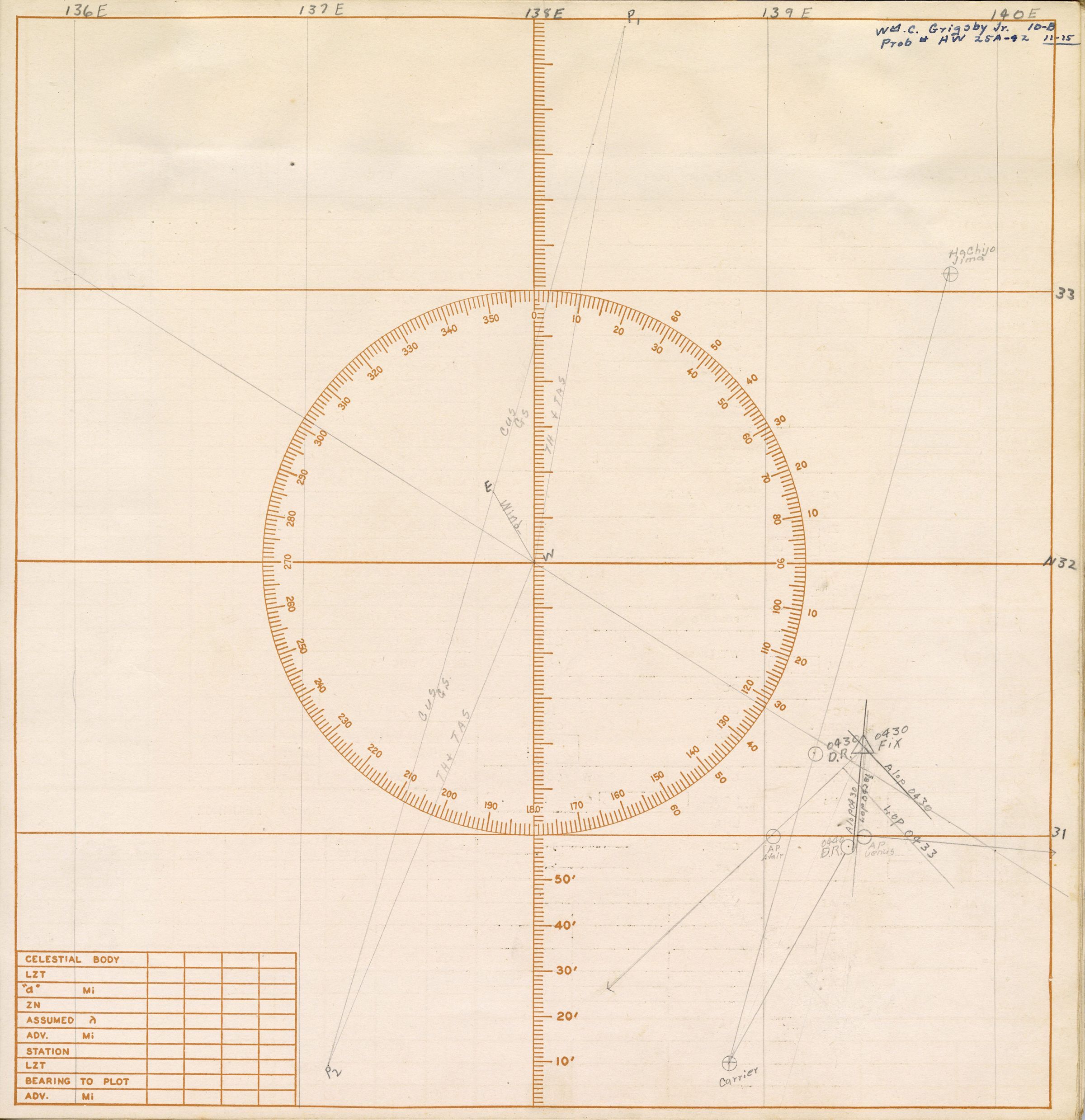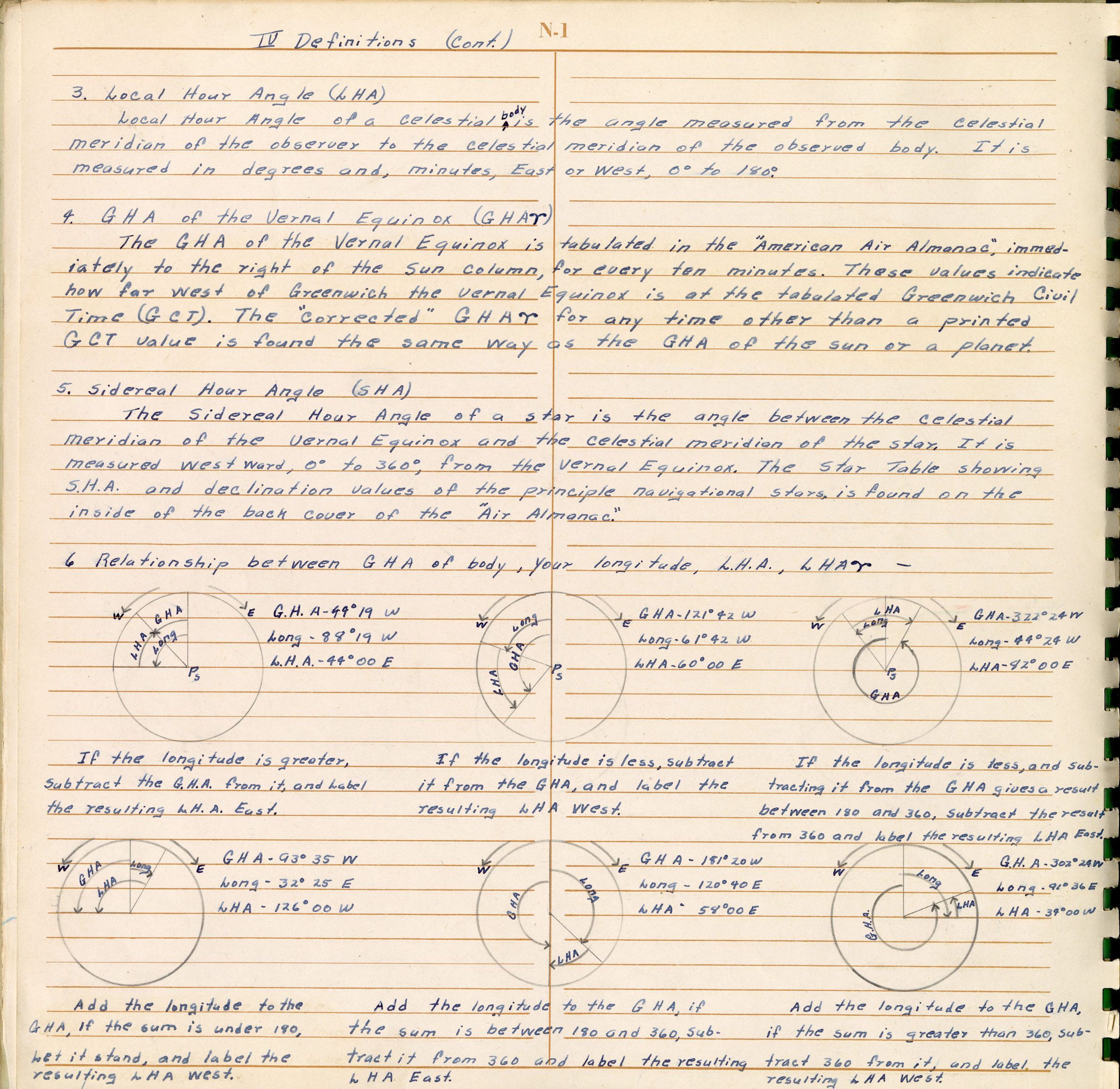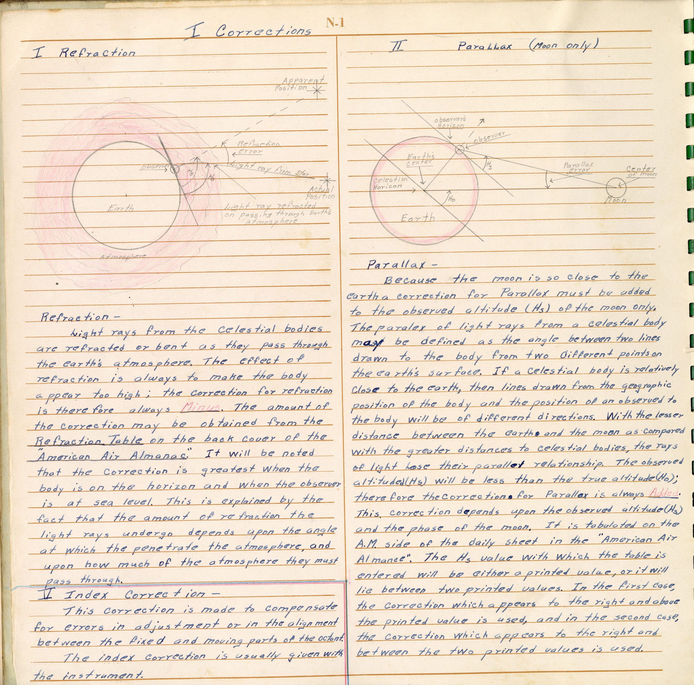 A celestial navigation practice notebook used by William Grigsby during his US Navy pilot training. Grigsby's handwritten notes and drawings can be seen throughout the notebook.Context