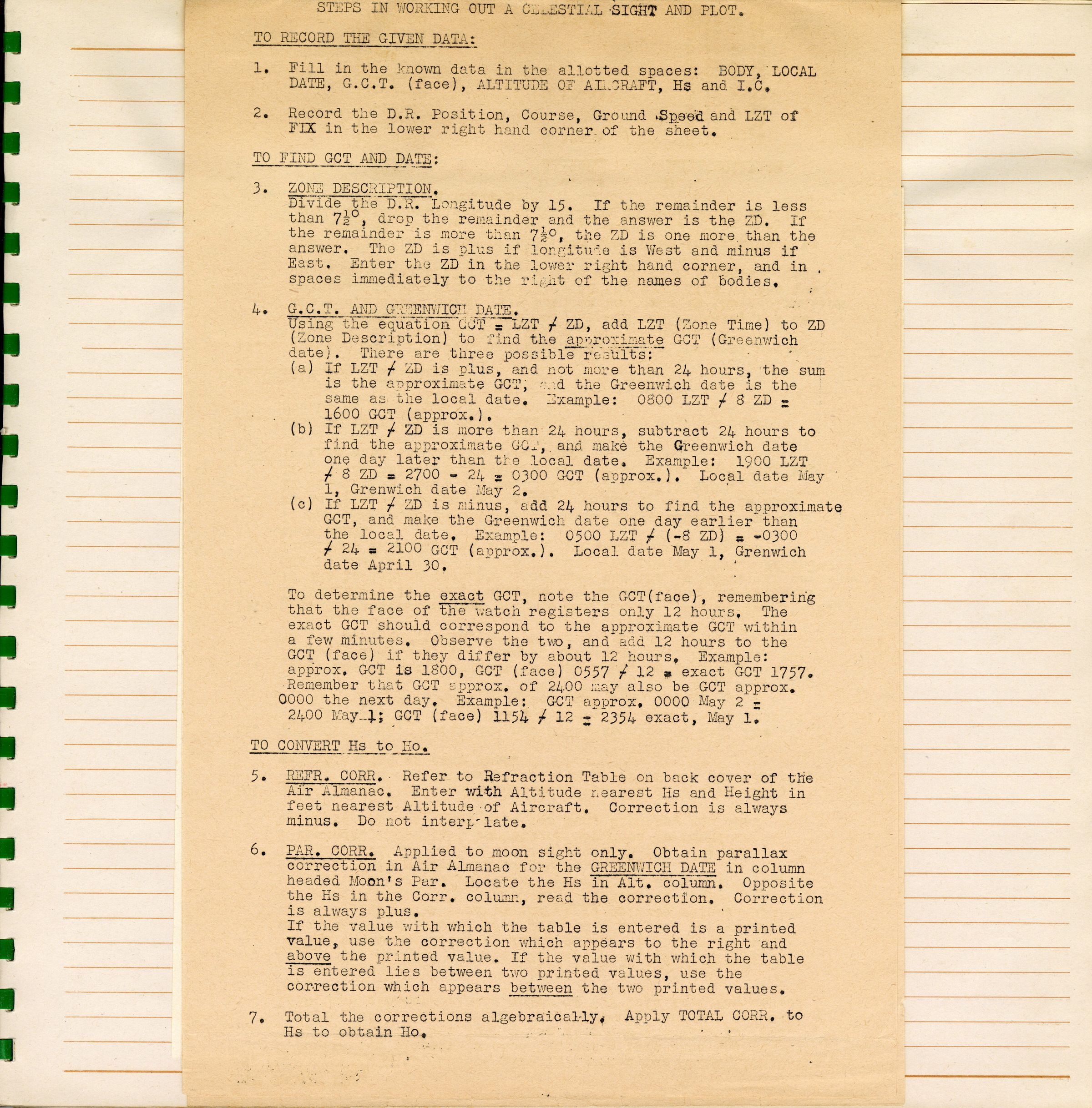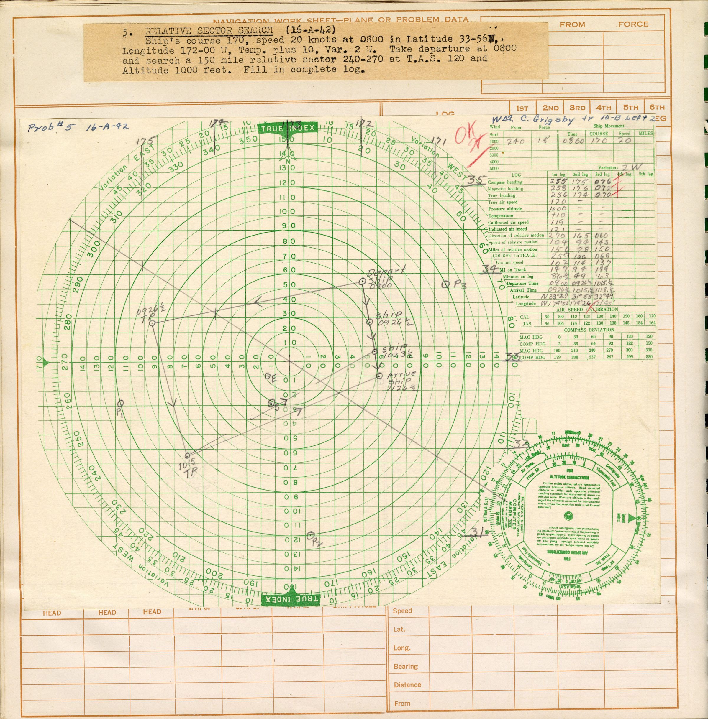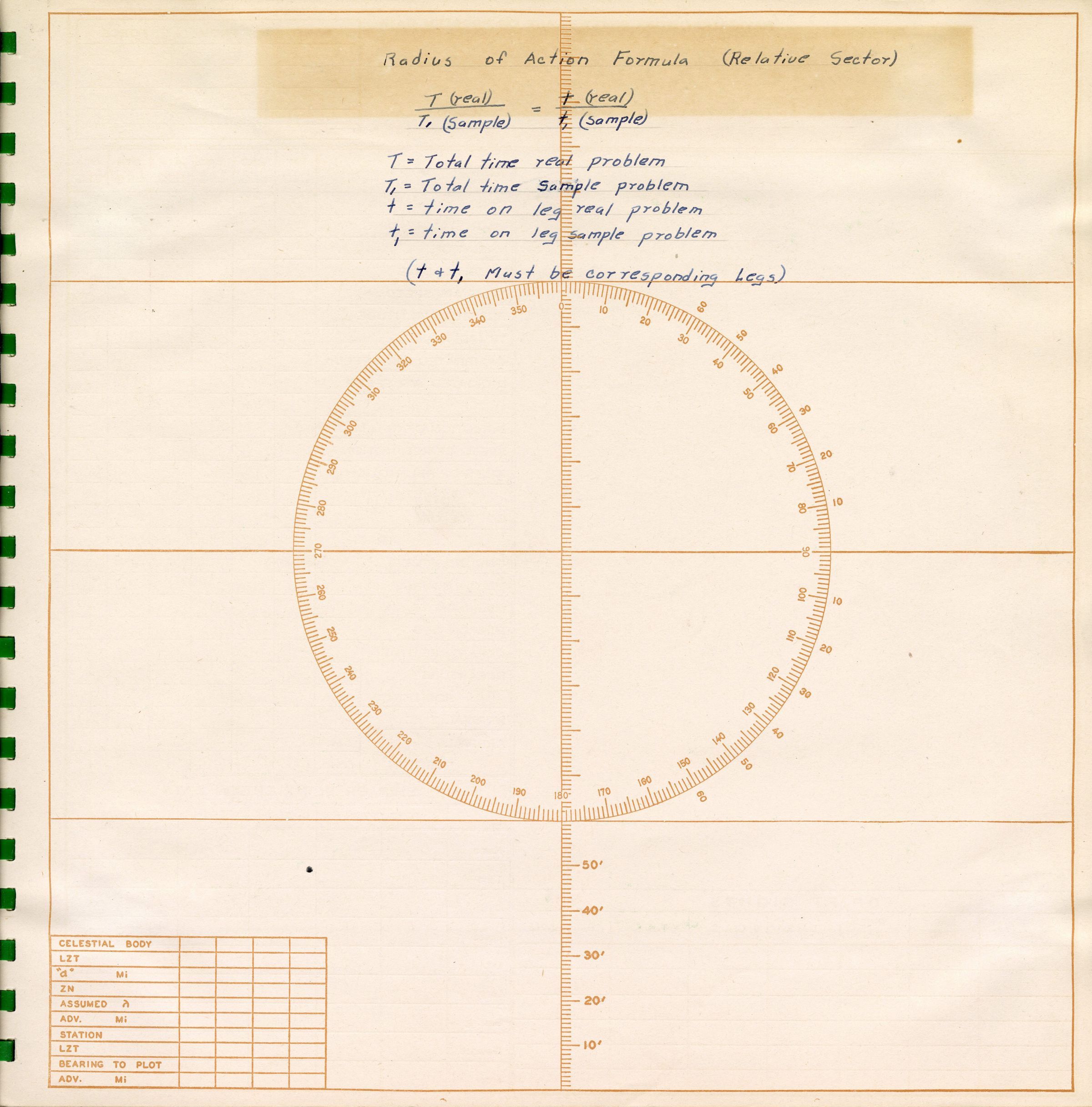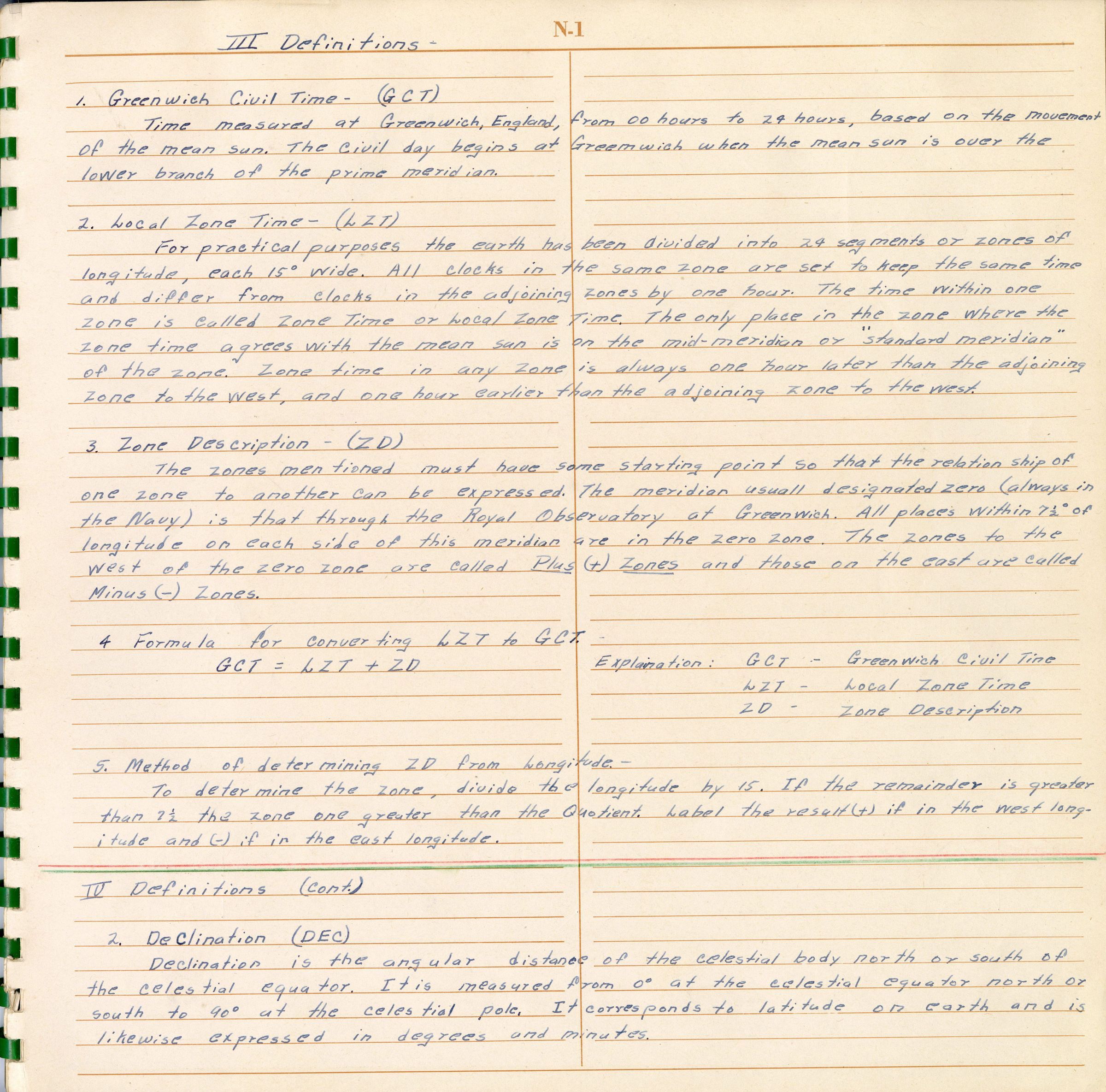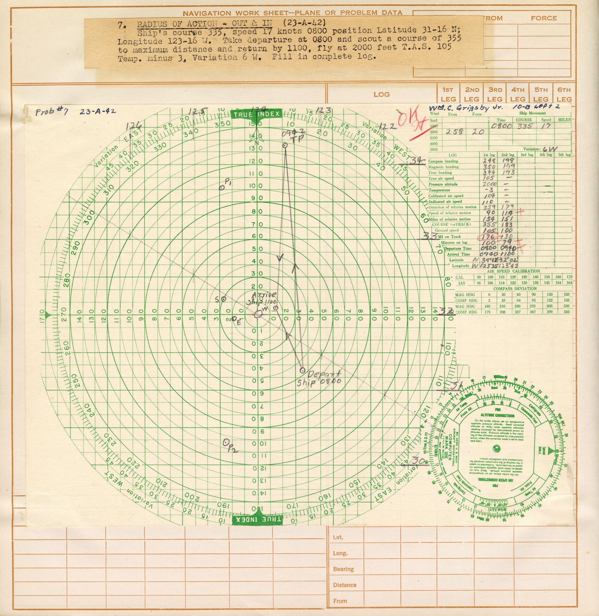 A celestial navigation practice notebook used by William Grigsby during his US Navy pilot training. Grigsby's handwritten notes and drawings can be seen throughout the notebook.Context