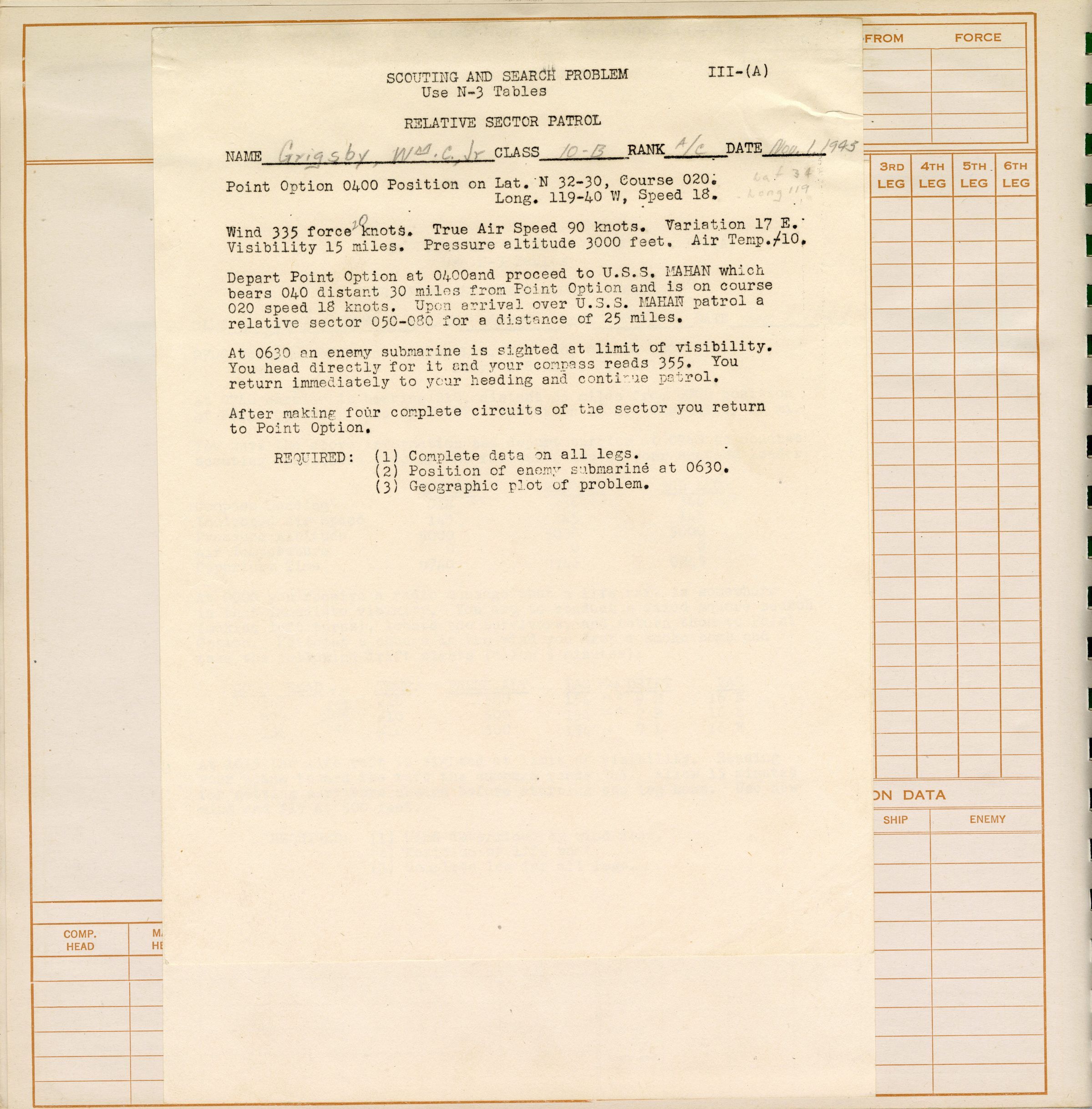 Over a year after enlisting in the US Navy, Ensign William "Bill" Grigsby was authorized to fly on March 14, 1944. This approval finally came after both pre-flight school in Athens, Georgia, and flight school at Naval Air Station (NAS) in Pensacola, Florida. After a mission testing experimental G-suits with Air Group Five in Fallon, Nevada, Grigsby transferred to Air Group Twelve and entered the Pacific War.