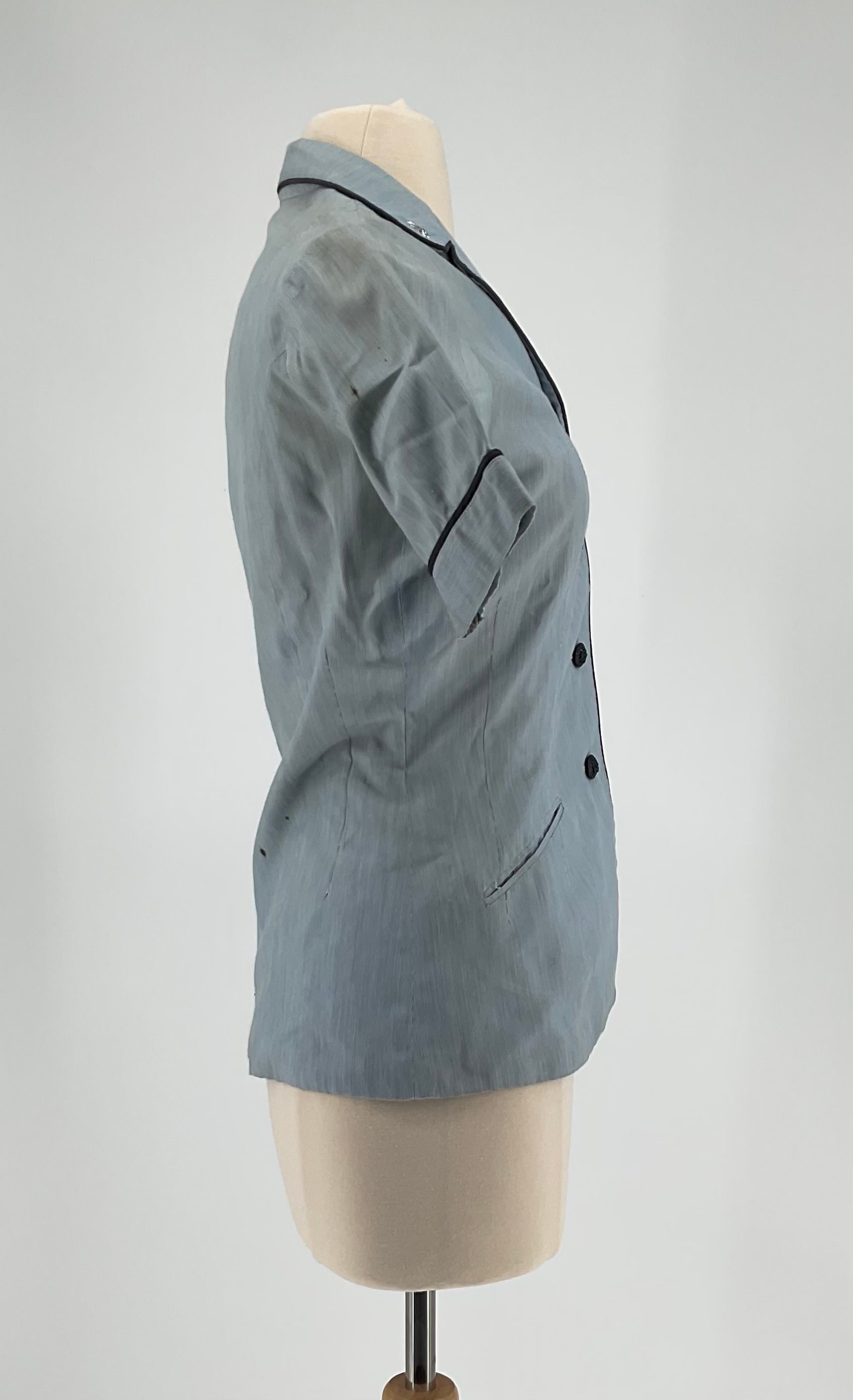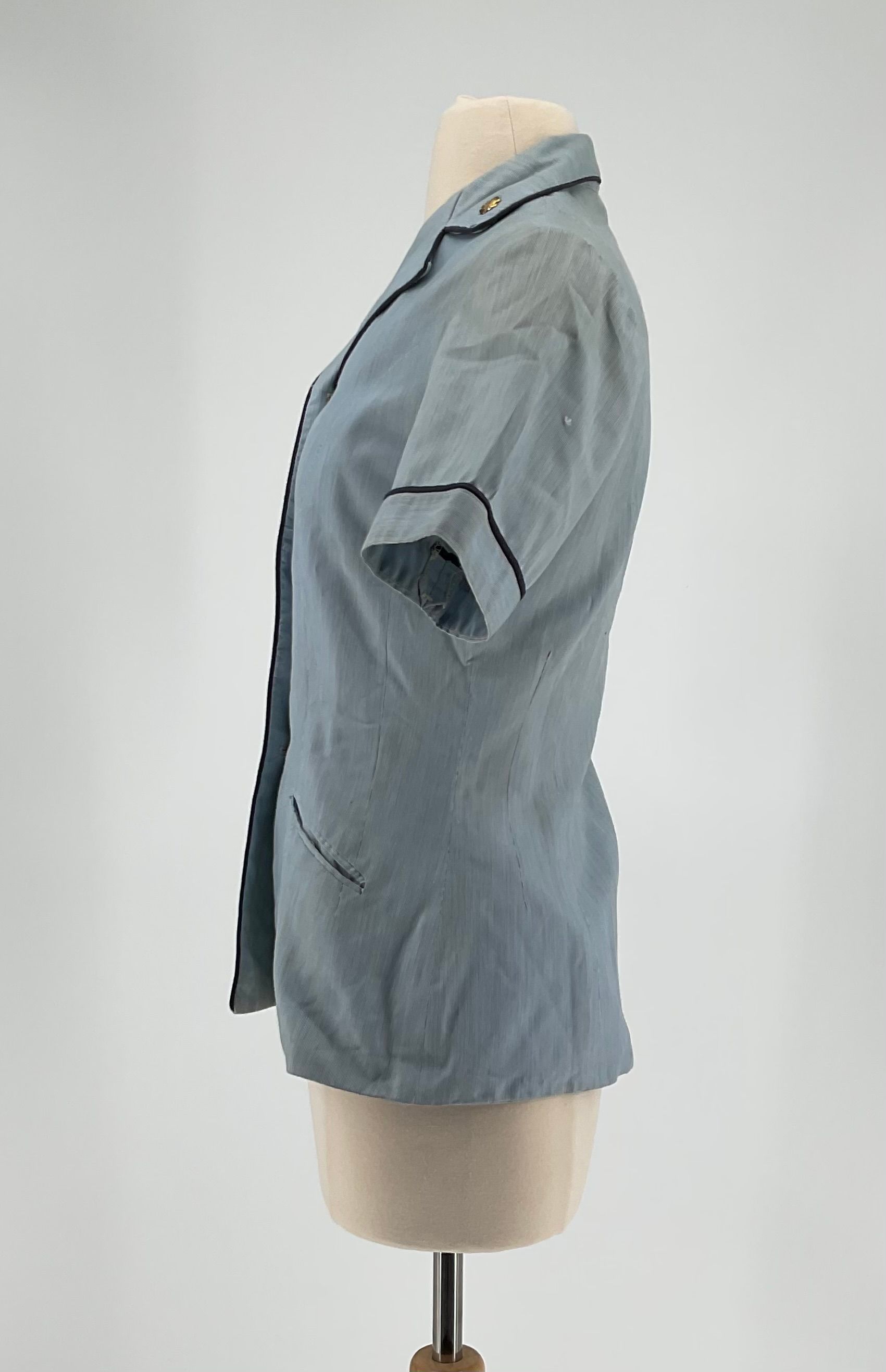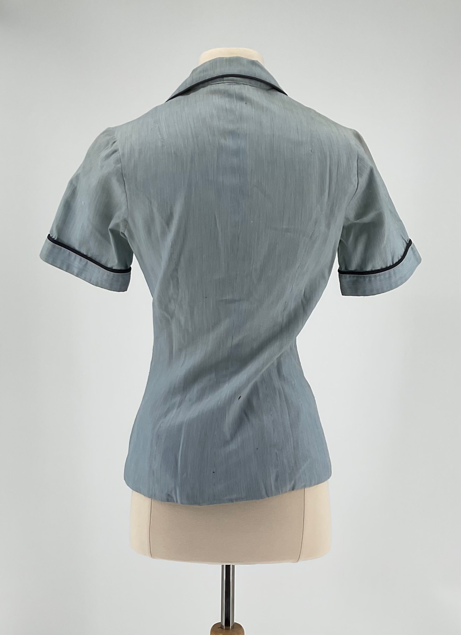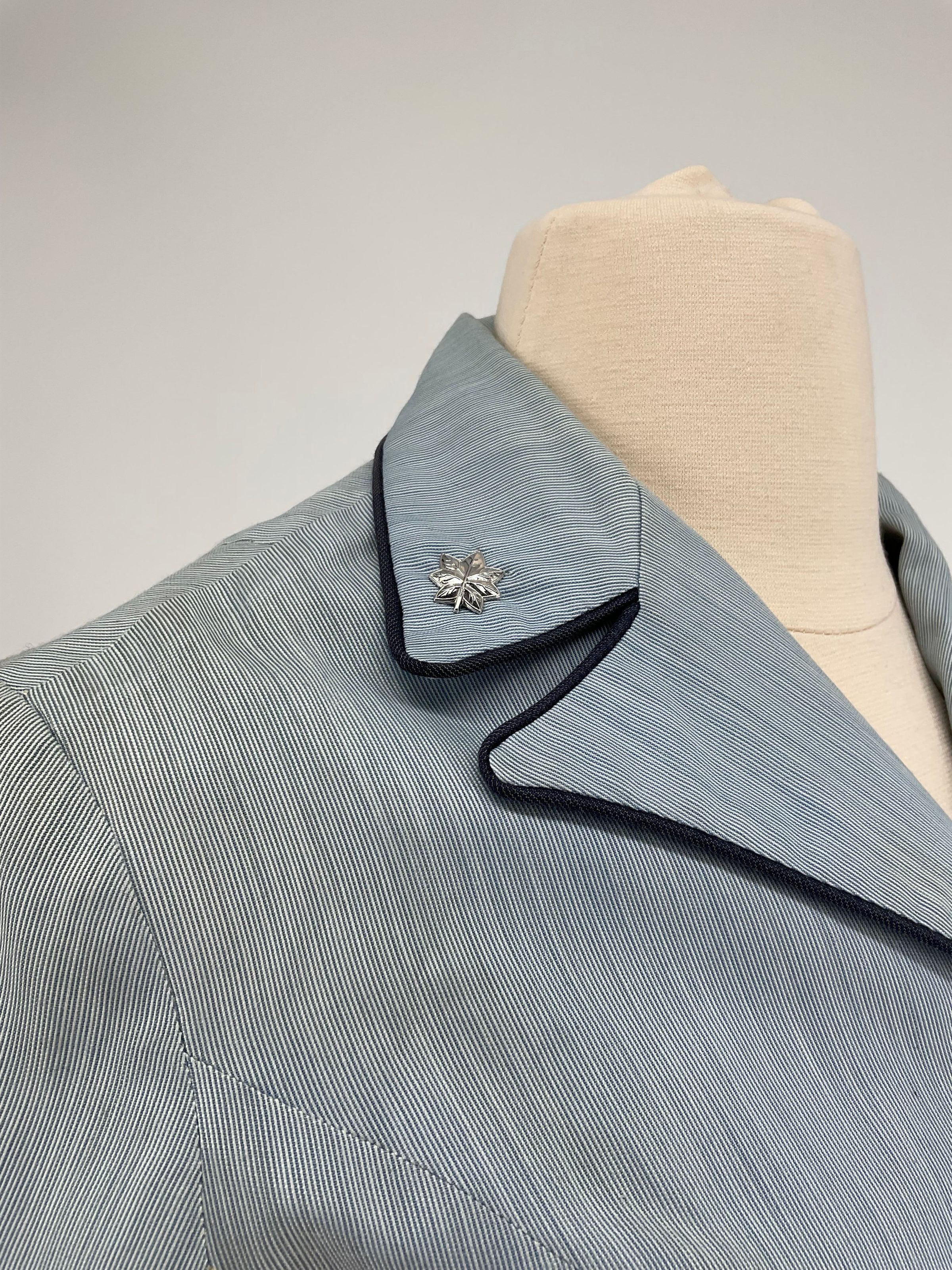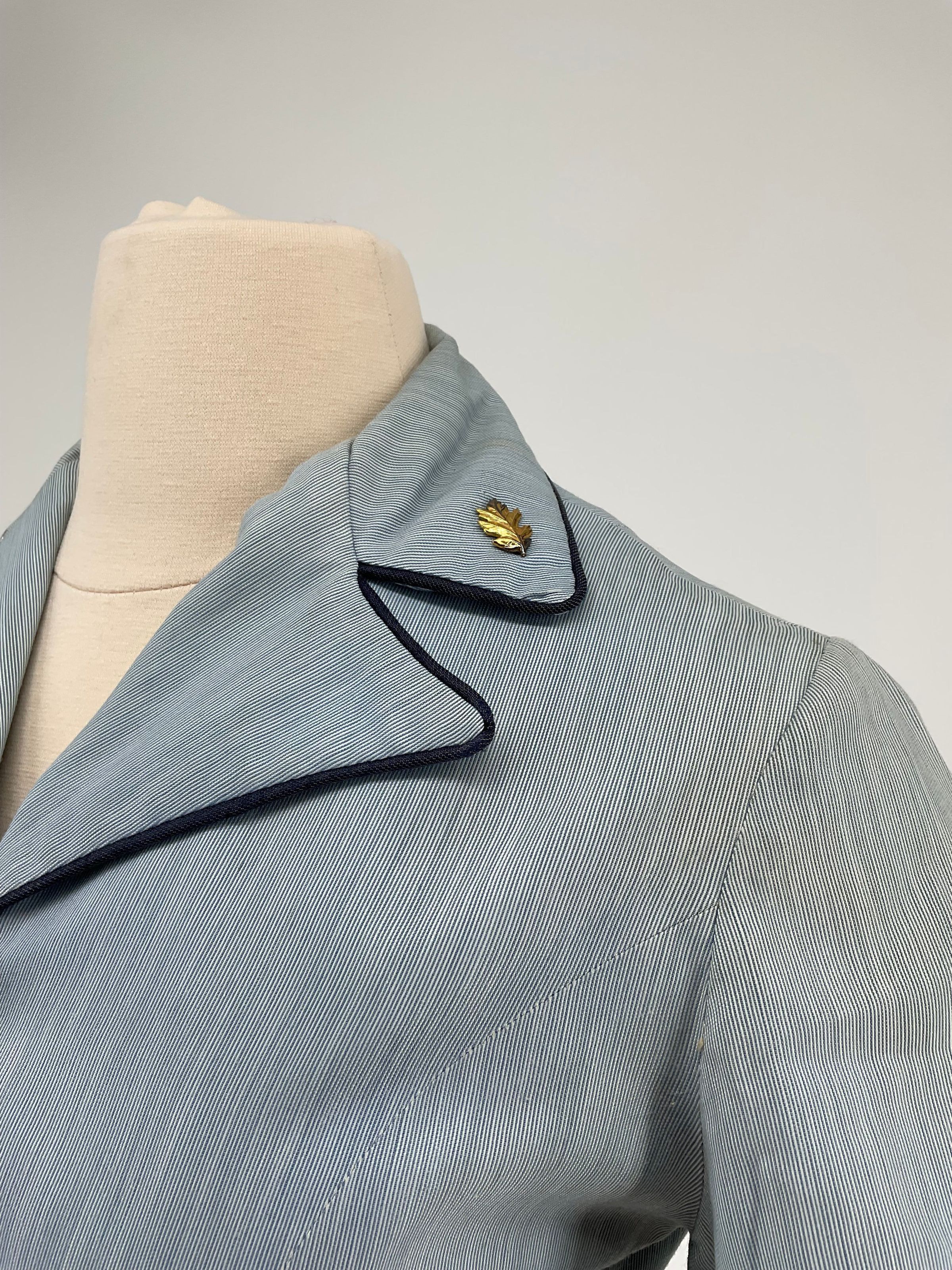 A post-World War II, US Navy Nurse Corps (NNC) summer uniform blouse with blue and white pin stripes. The shirt and sleeves are piped in navy blue and have navy blue anchor buttons. Nurse and Commander rank Oak Leaves appear in silver and gold on either side of the collar.Use