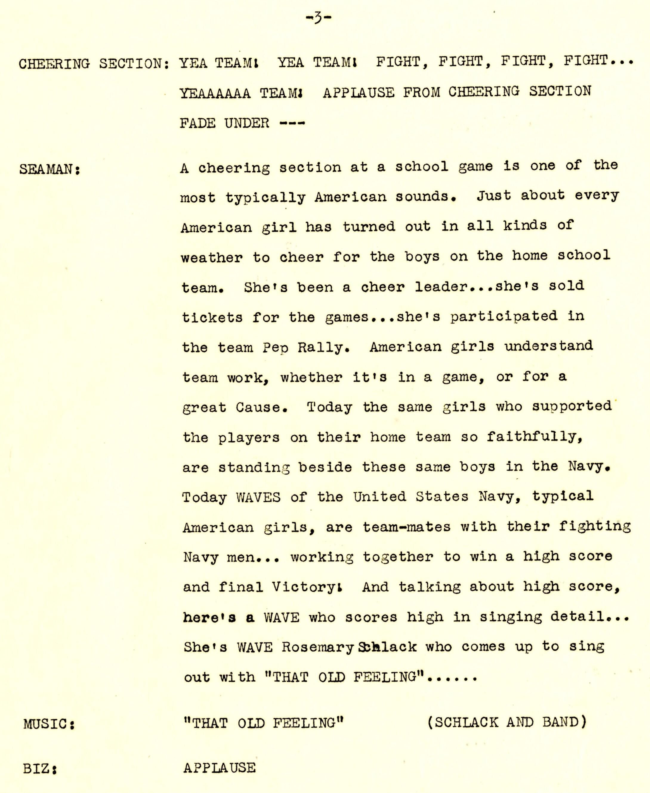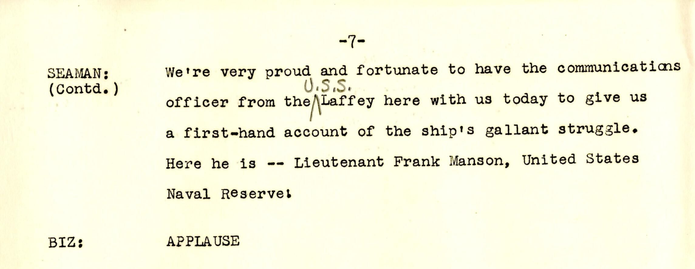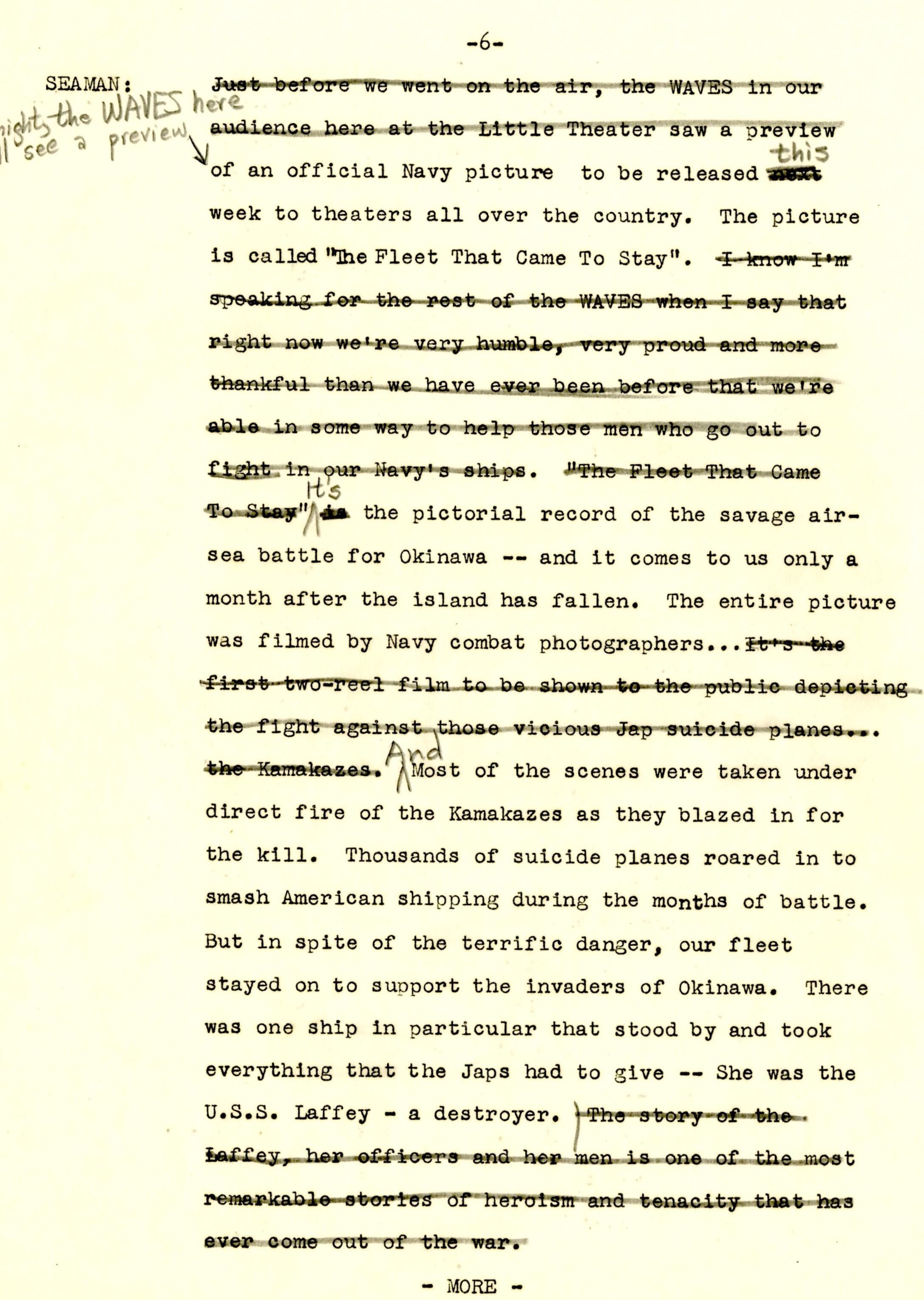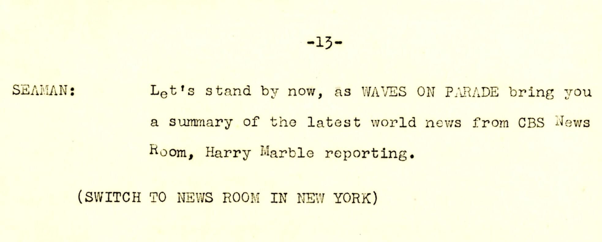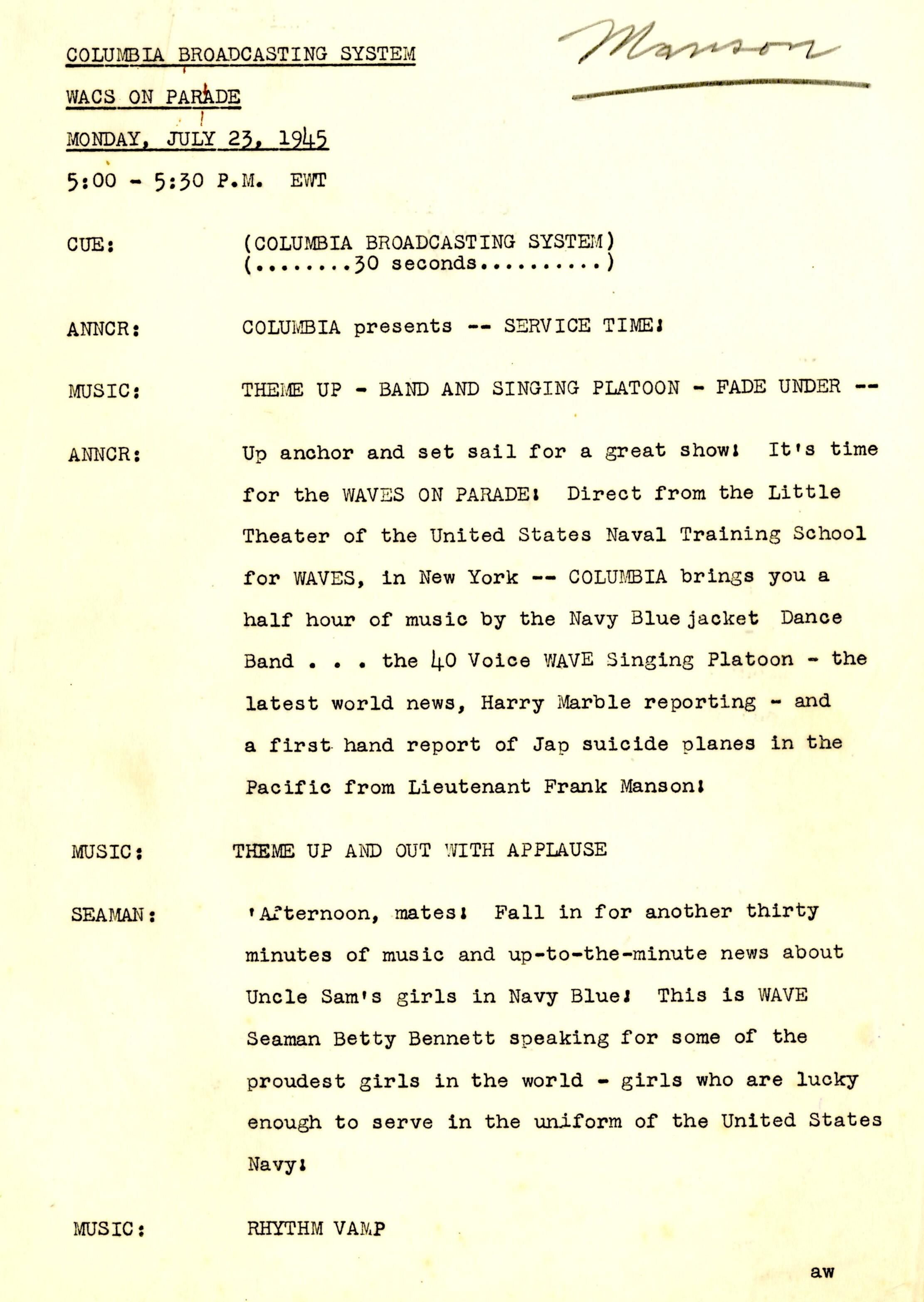A 14-page script produced for Columbia Broadcasting System (CBS) at the Little Theater of the United States Training School, Woman's Reserve New York City for the wartime program 'WAVES on Parade.' This musical variety show featured Frank Manson recounting the USS Laffey's ordeal off Okinawa. The program was broadcast on the Columbia Broadcasting System on Monday, July 23, 1945, from 5:00-5:30 pm Eastern War Time (EWT).Context