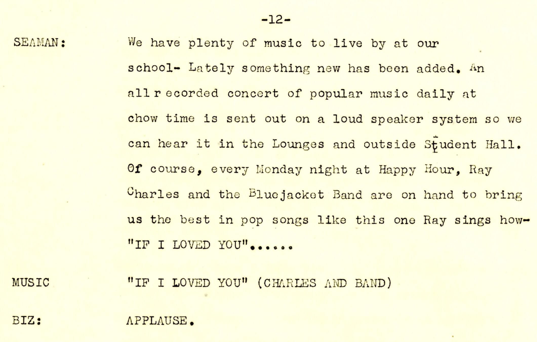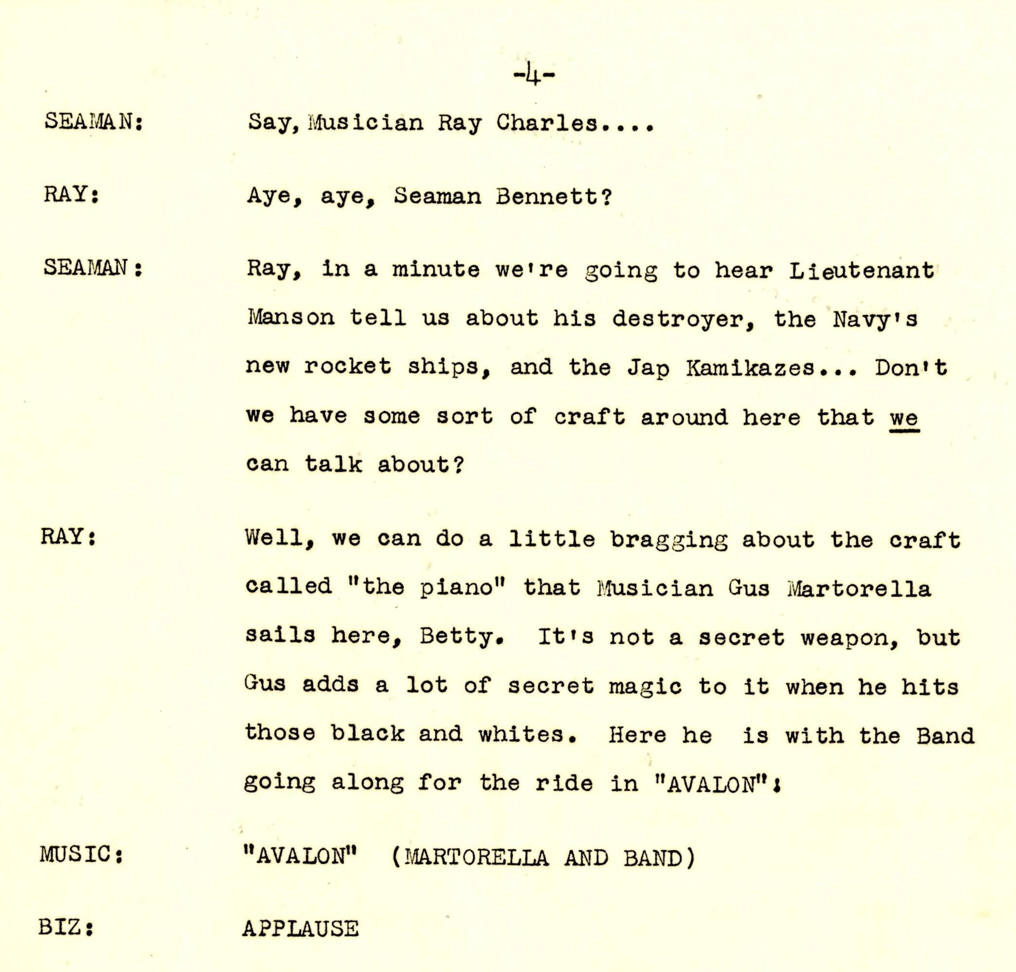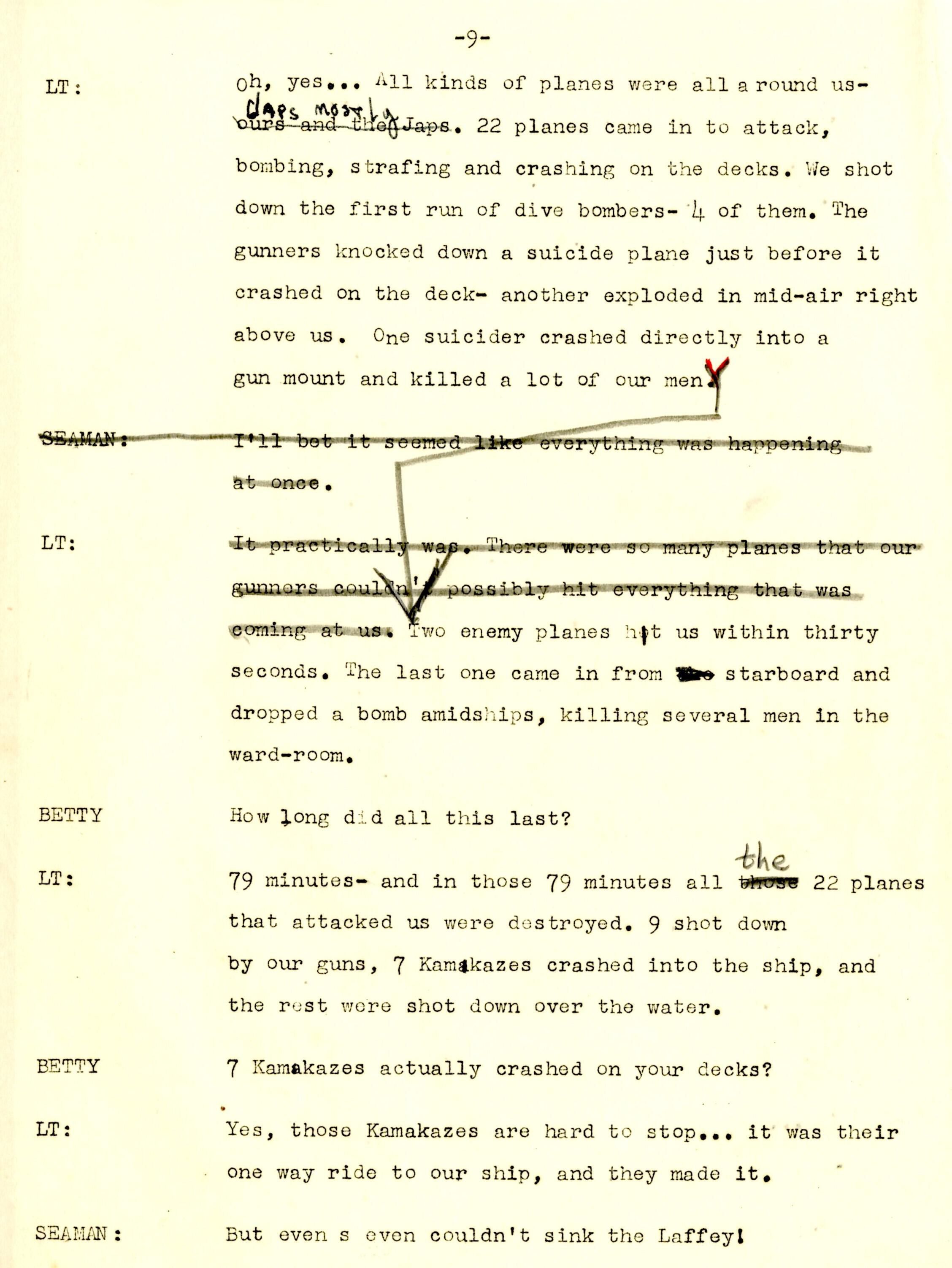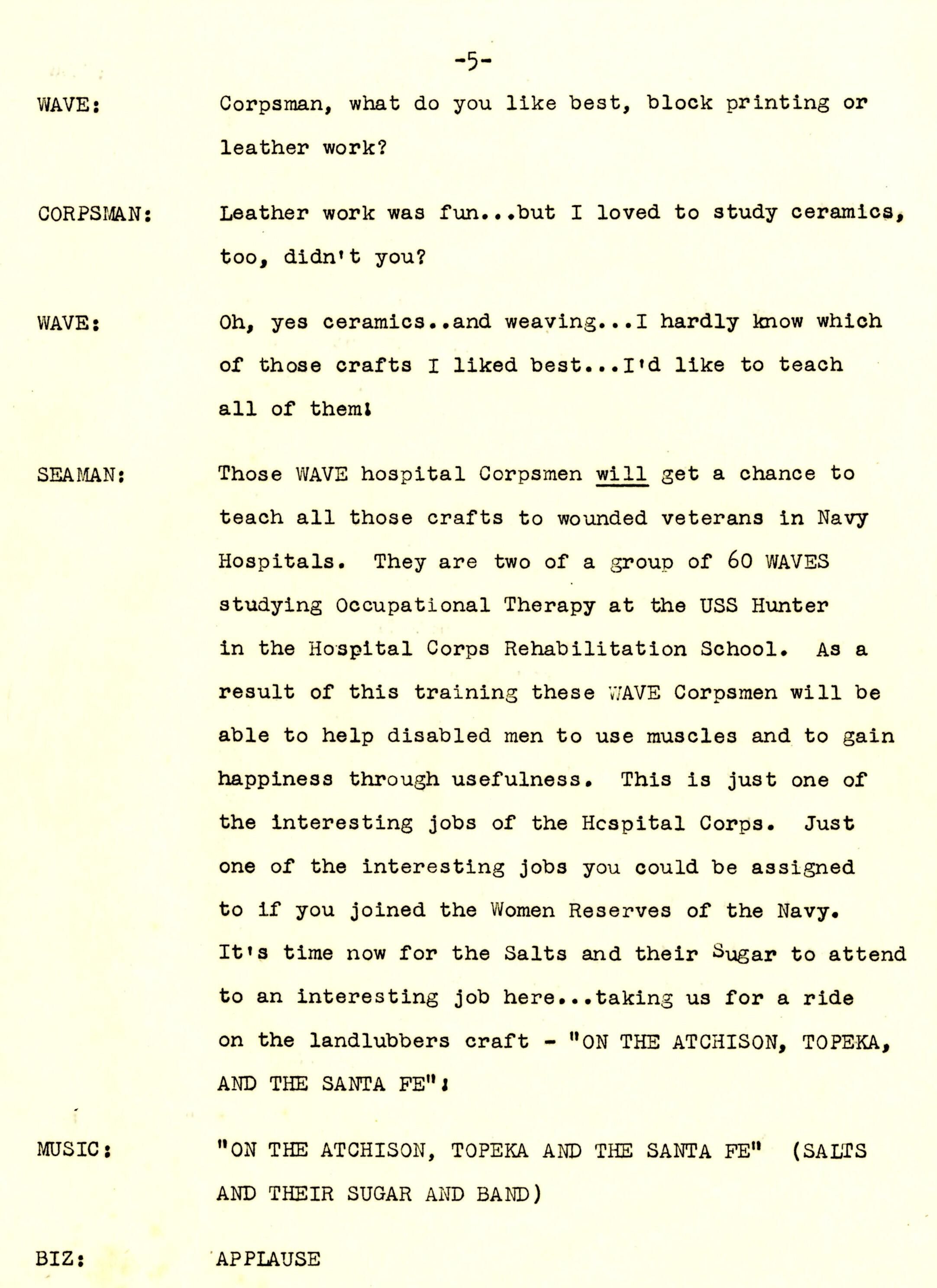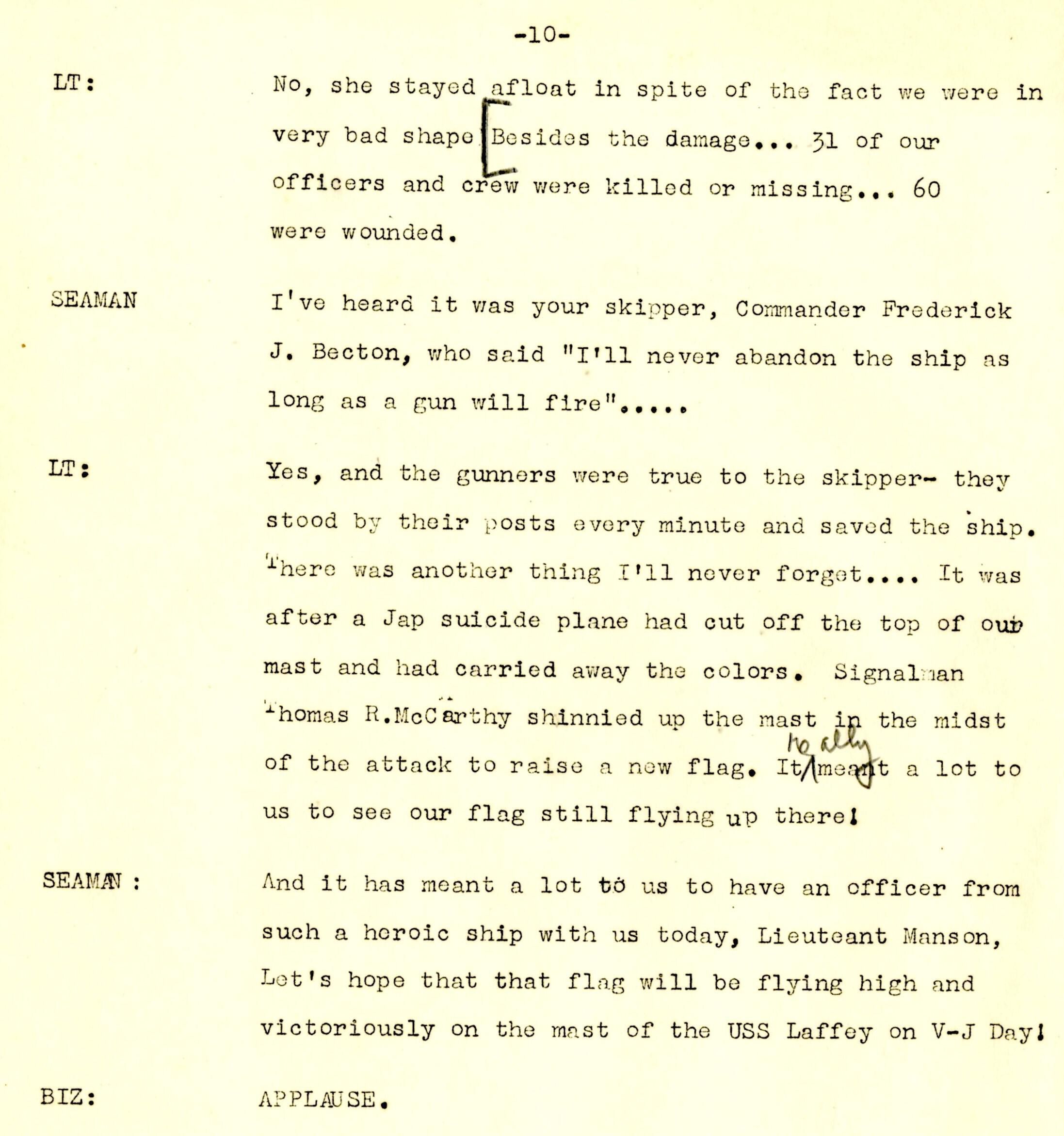 A 14-page script produced for Columbia Broadcasting System (CBS) at the Little Theater of the United States Training School, Woman's Reserve New York City for the wartime program 'WAVES on Parade.' This musical variety show featured Frank Manson recounting the USS Laffey's ordeal off Okinawa. The program was broadcast on the Columbia Broadcasting System on Monday, July 23, 1945, from 5:00-5:30 pm Eastern War Time (EWT).Context