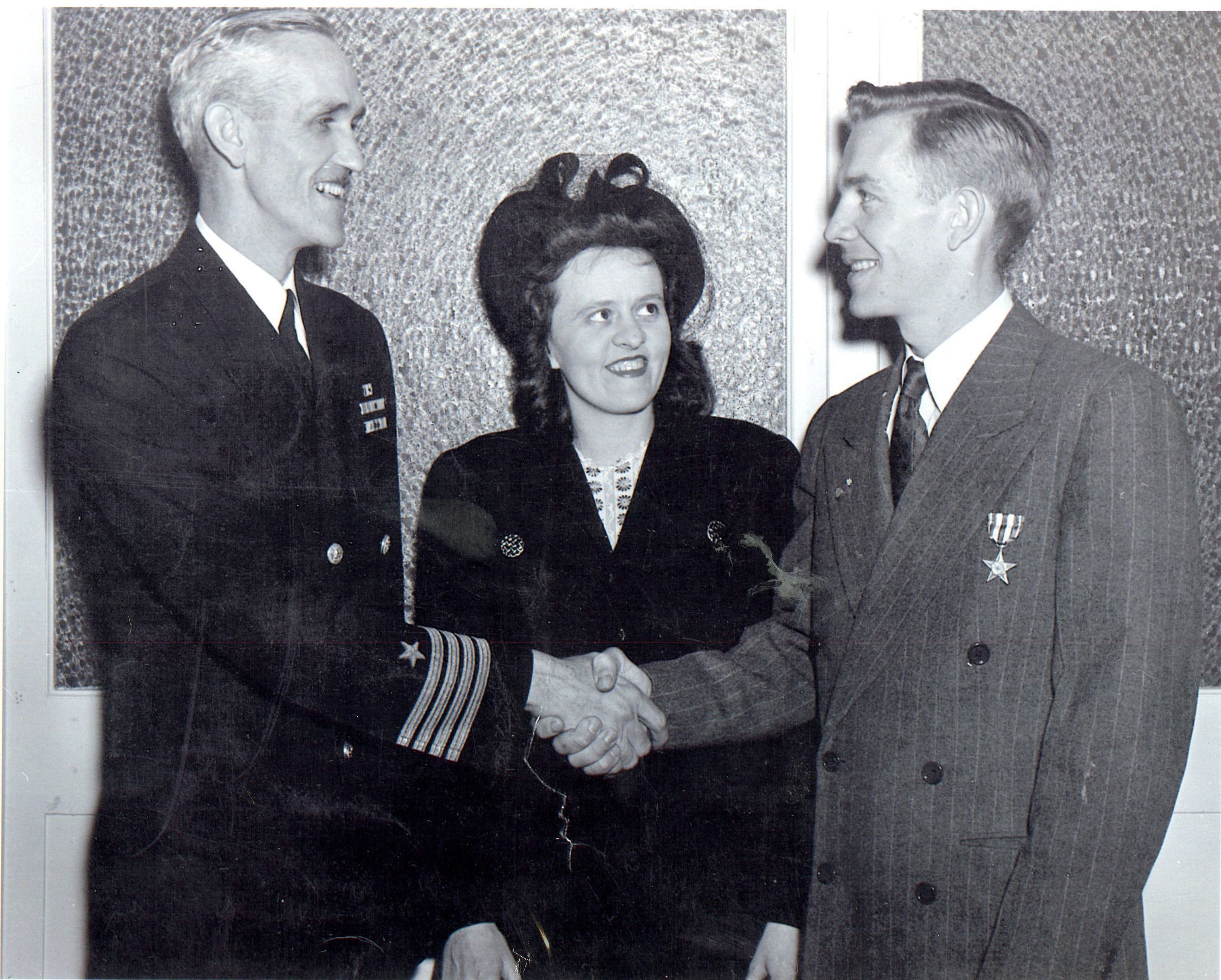 A black and white photograph of Arthur Hogan being congratulated by a US Navy captain after being awarded the Silver Star for his actions aboard the USS Laffey (DD-724) on April 16, 1945. Arthur's wife, Mary J. Hogan, grins proudly.Context