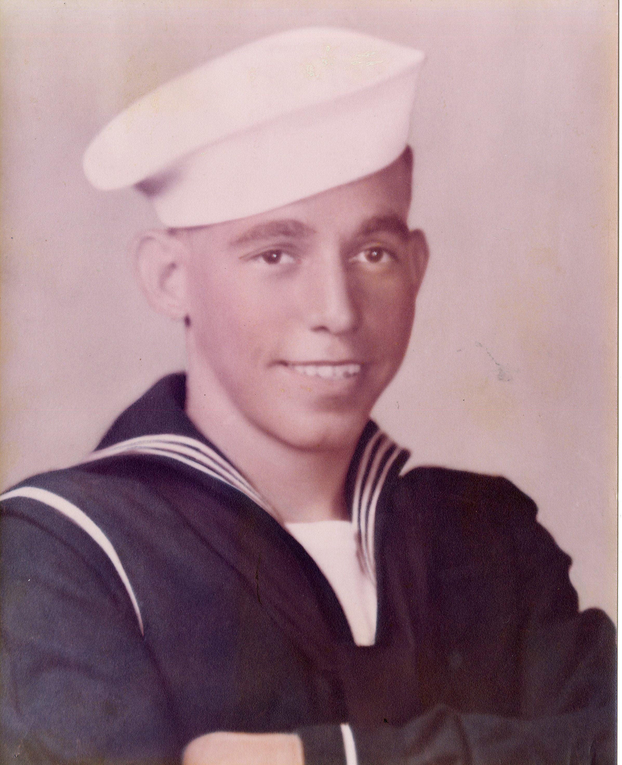 A color photo of Robert Daugherty in his US Navy dress blues uniform, also called a crackerjack.Context
