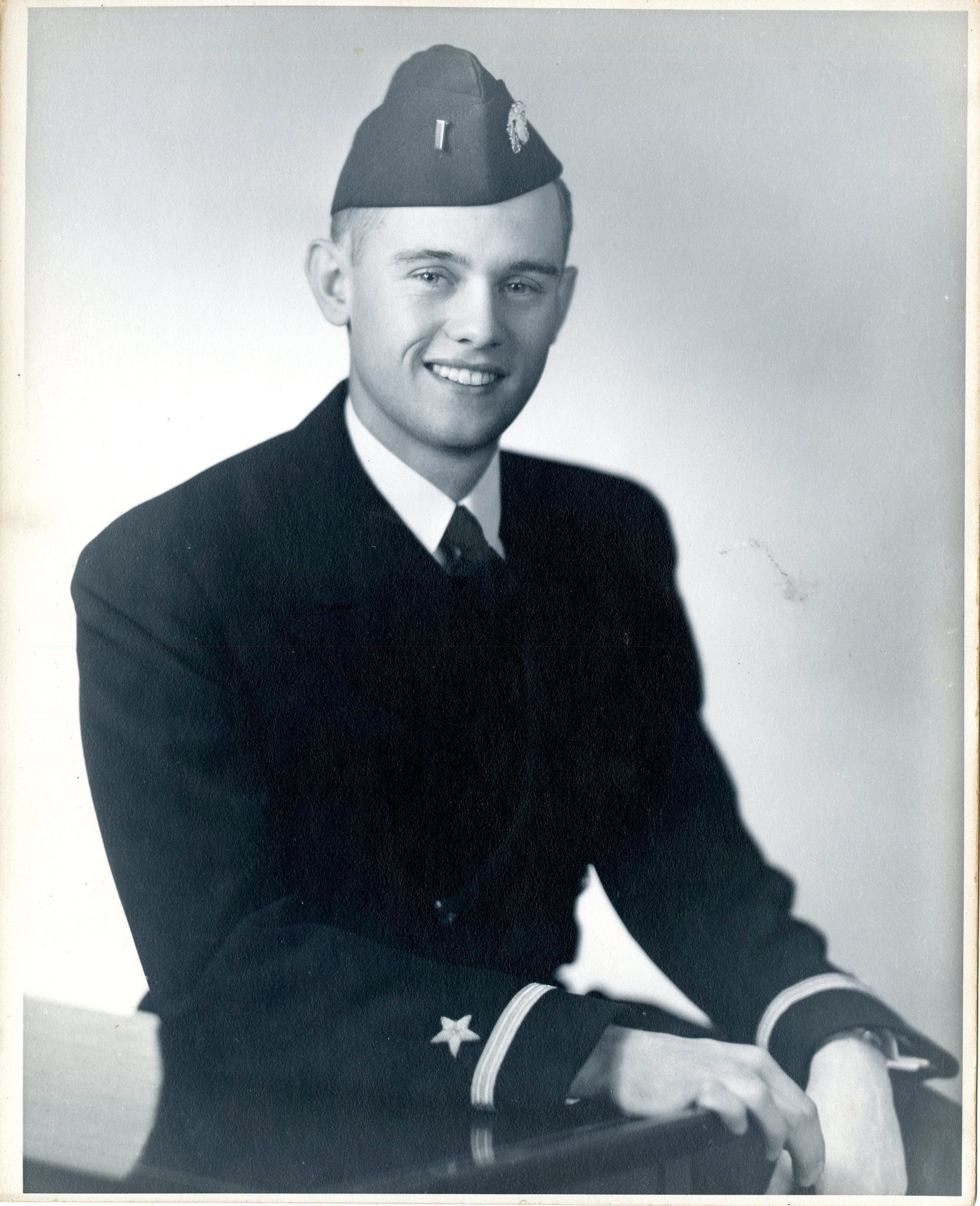A black and white photo of a smiling Ensign Jerome "Skeeter" Sheets in his US Navy blues officers' dress uniform.Context