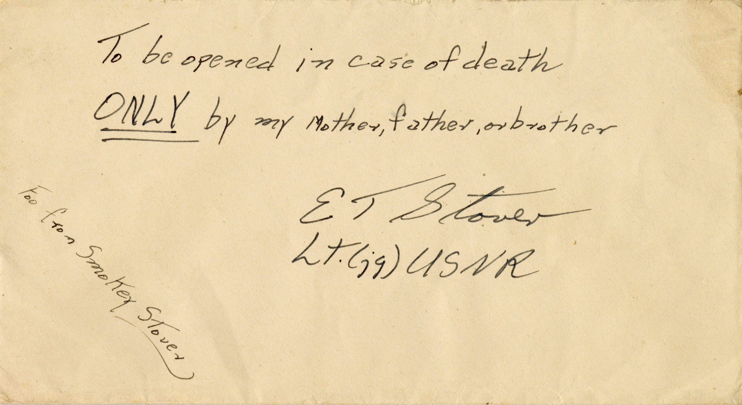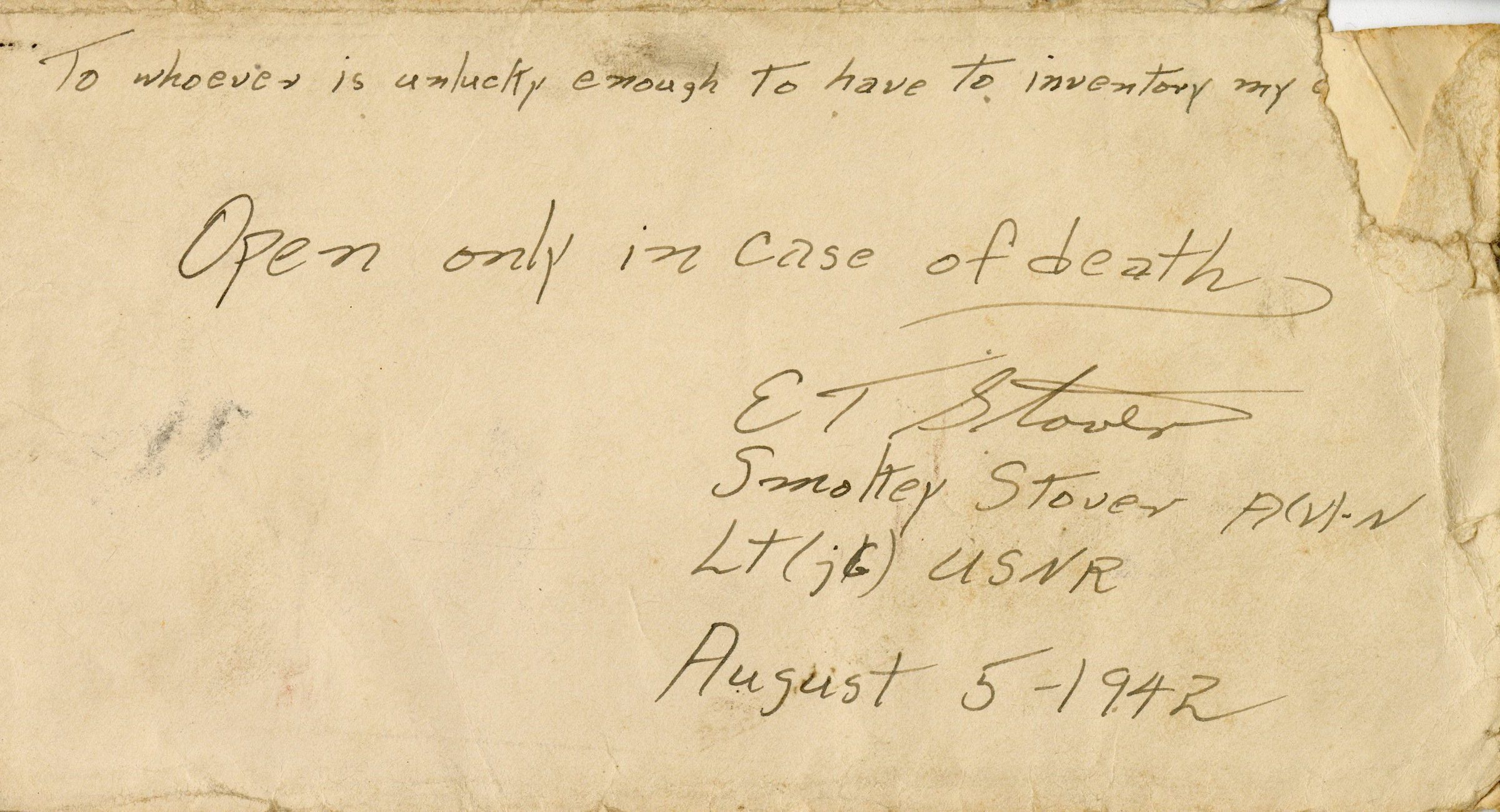 Elisha "Smokey" Stover's "Open in Case of Death" Letter Dated August 5, 1942Scope and Content