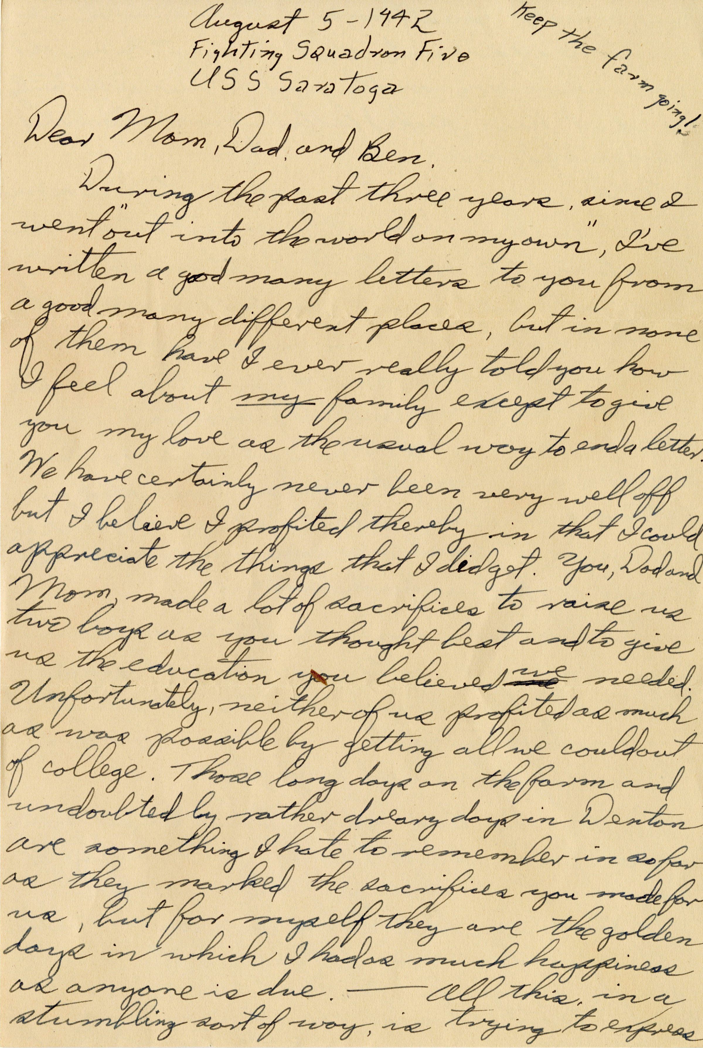 A letter from Elisha "Smokey" Stover to his family. This letter was written on August 5, 1942, while he was still aboard the USS Saratoga (CV-3).Context