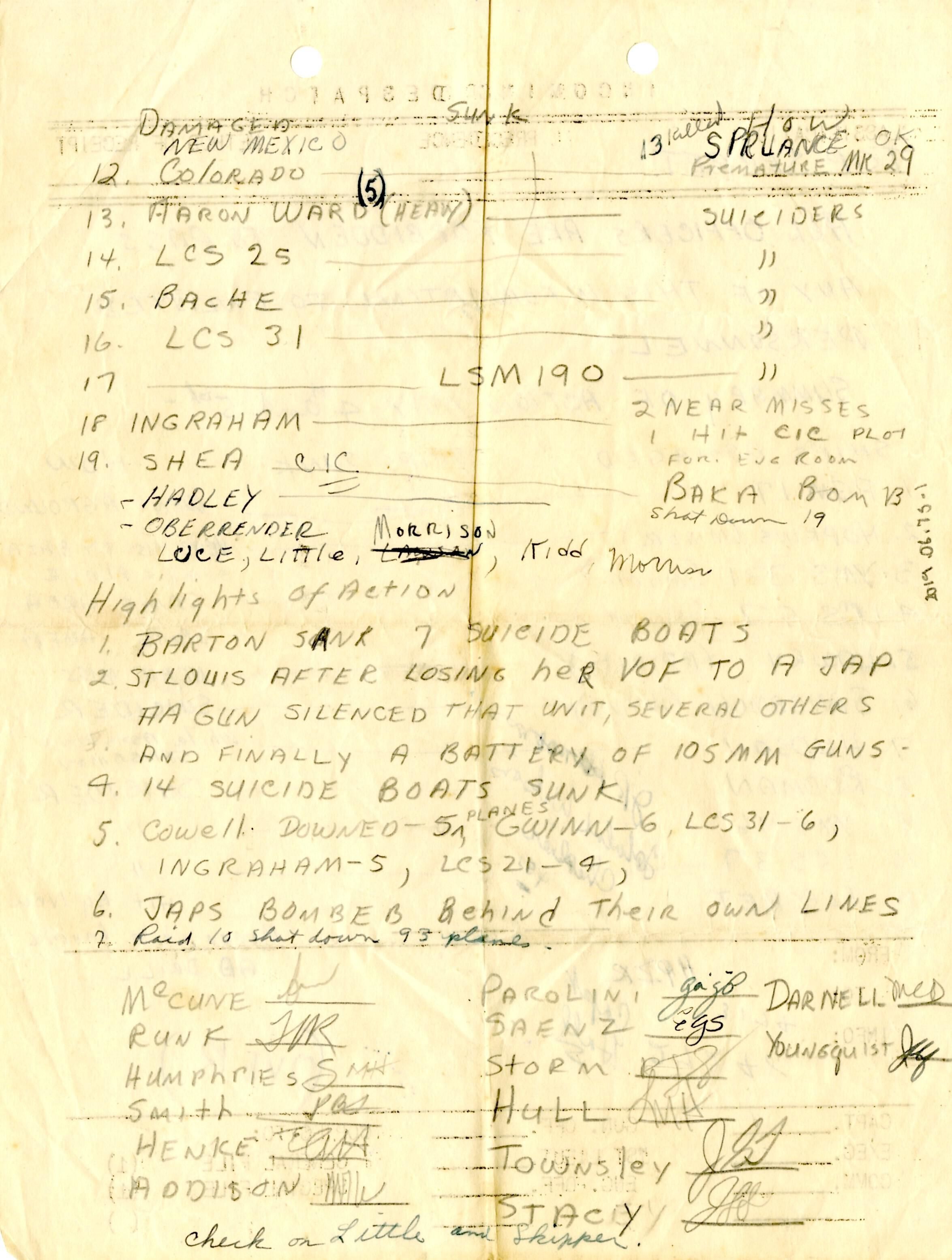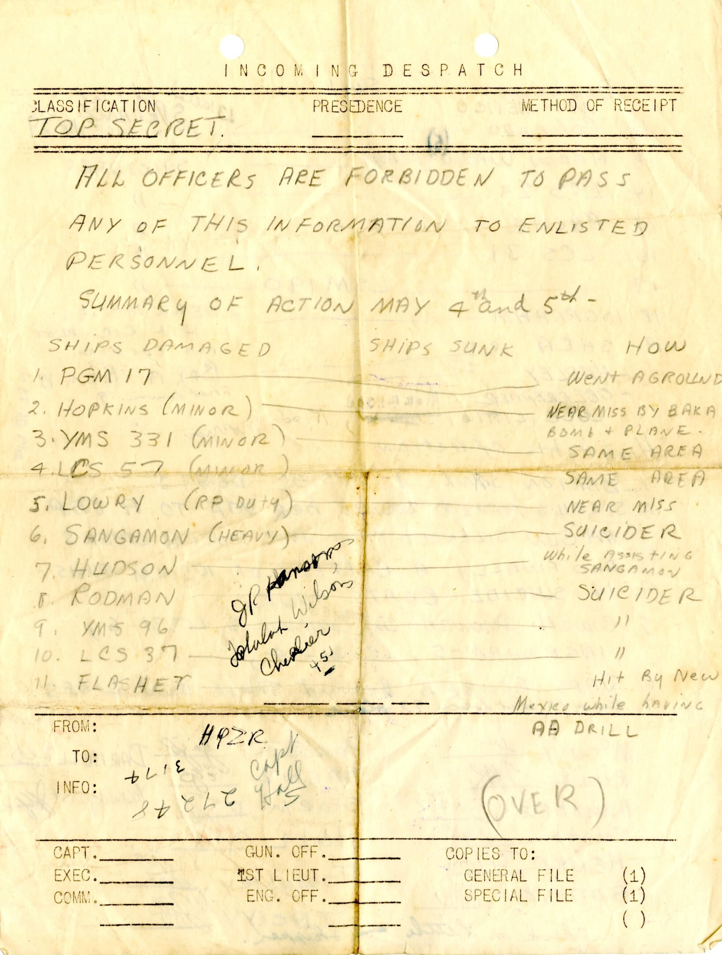 A handwritten memo on the Communication Department Form of the summary of naval action around Okinawa during May 4th and 5th, 1945. It is classified top secret and contains a hand-written notation that "All officers are forbidden to pass any of this information to enlisted personnel". The memo contains a summary of the attacks on US ships, the damage incurred, and the manner of the attacks. The bottom of the second page contains the initials of the officers who viewed the memo.Context