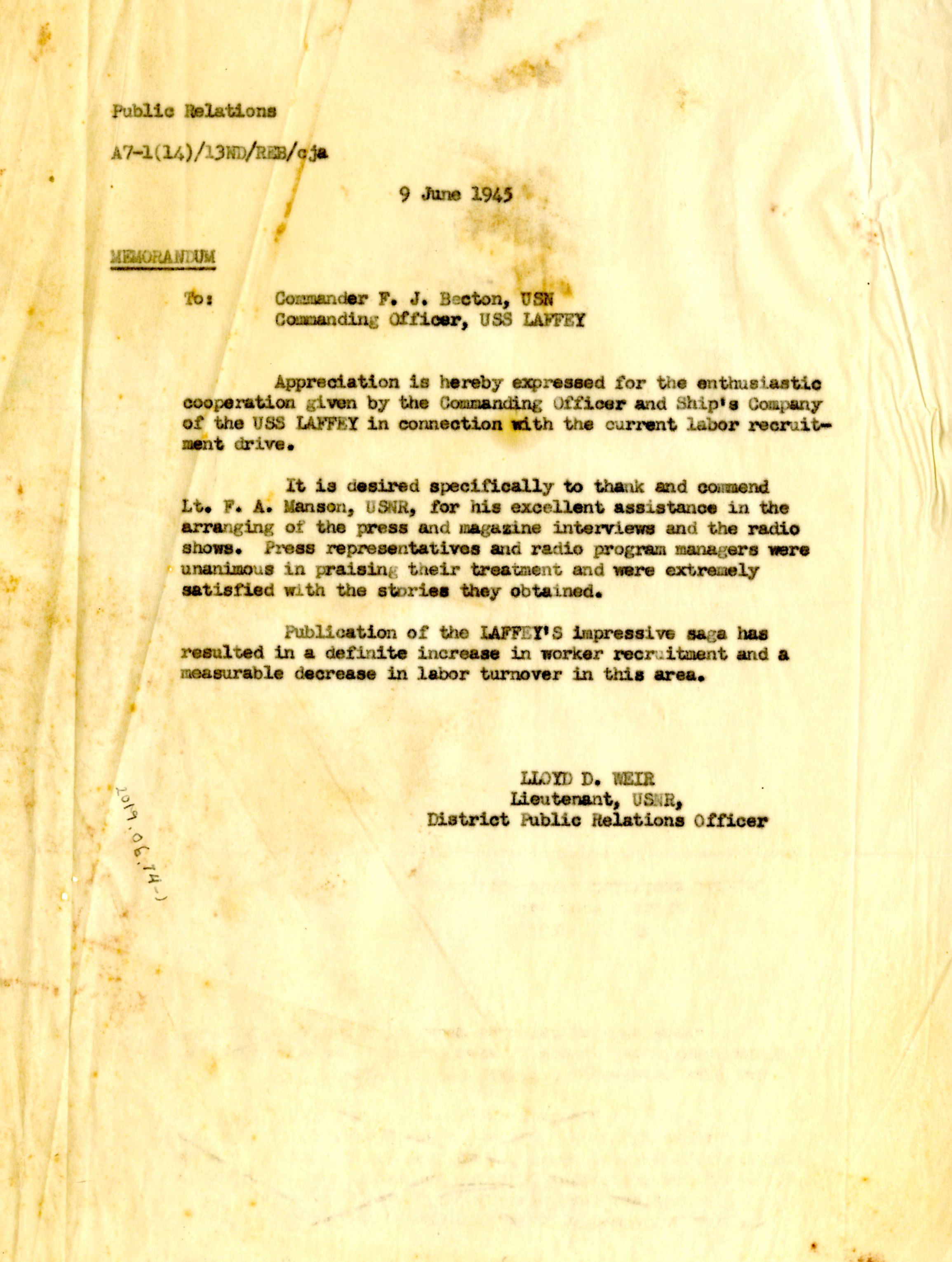 A memorandum to Commander Frederick Julian Becton from Lieutenant Lloyd Weir, District Public Relation Officer, dated June 9, 1945. Lt. Weir expresses his appreciation for the "enthusiastic cooperation given by the Commanding Officer and Ship's Company of the USS Laffey in connection with the current labor recruitment drive".