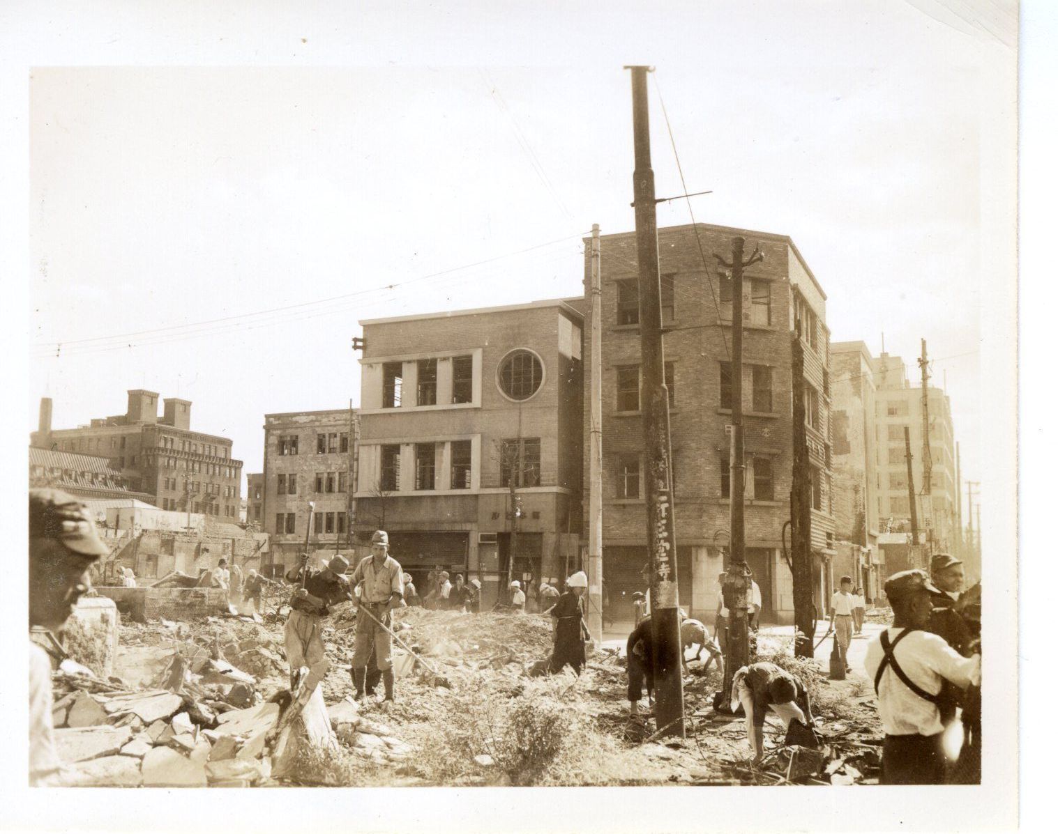 A black and white photograph of a Japanese soldiers and civilians clearing building debris in Tokyo. The photo is from an album containing 53 photographs taken by Warren Tucker and his friends during the USS Yorktown (CV-10) crew liberty in Tokyo, Japan in September of 1945.