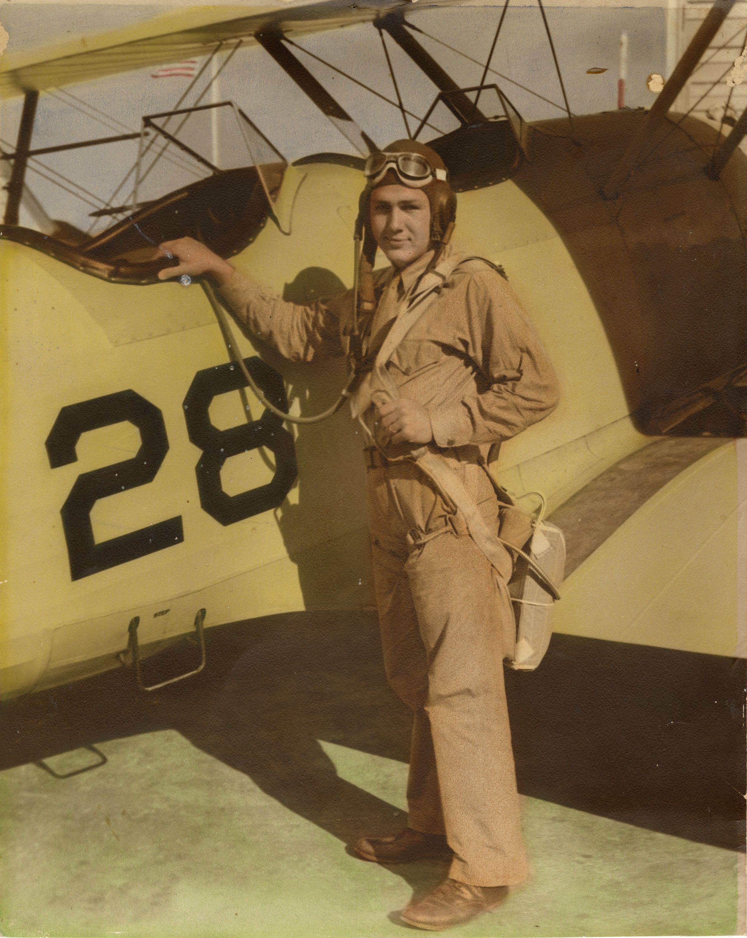 Elisha "Smokey" Stover Standing in Front of a Stearman BiplaneDescription