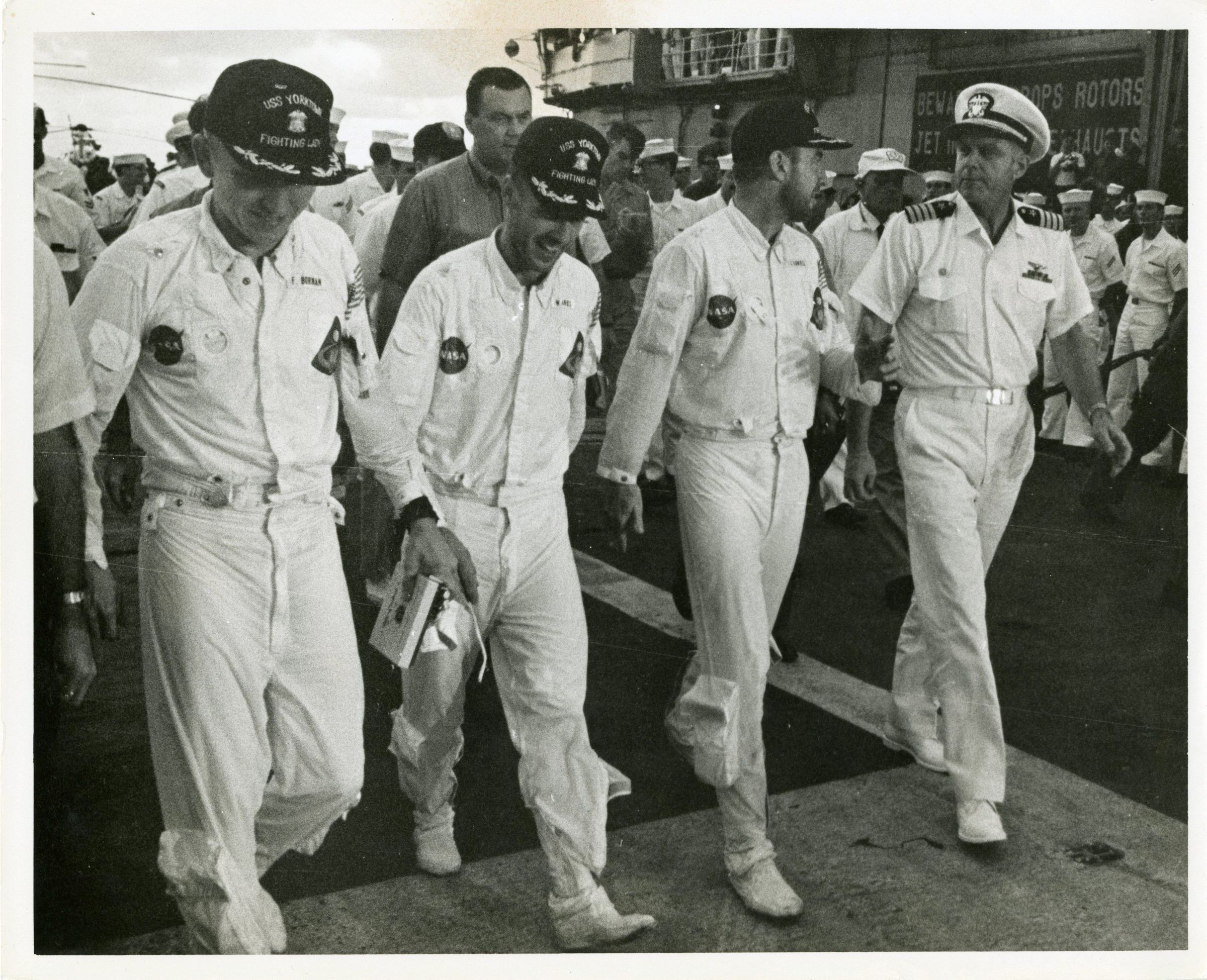 Photograph of the three Apollo 8 astronauts walking on the flight deck just after their arrival. From left to right are: Frank Borman, James A. Lovell Jr., William Anders, and Captain John Fifield.Context