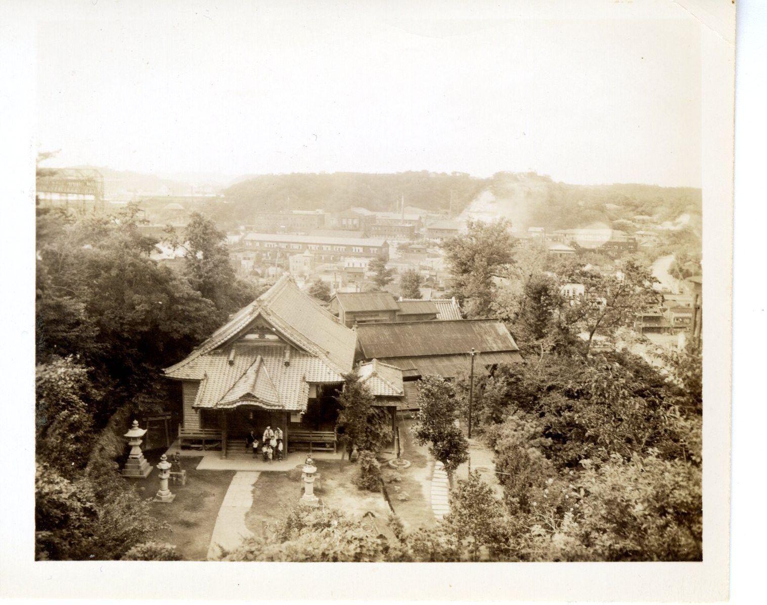 The caption accompanying the photo reads " A couple of sailors visit a small temple high on a hill away from the noise of the once busy shops that can be seen at the naval base in the distance."Context