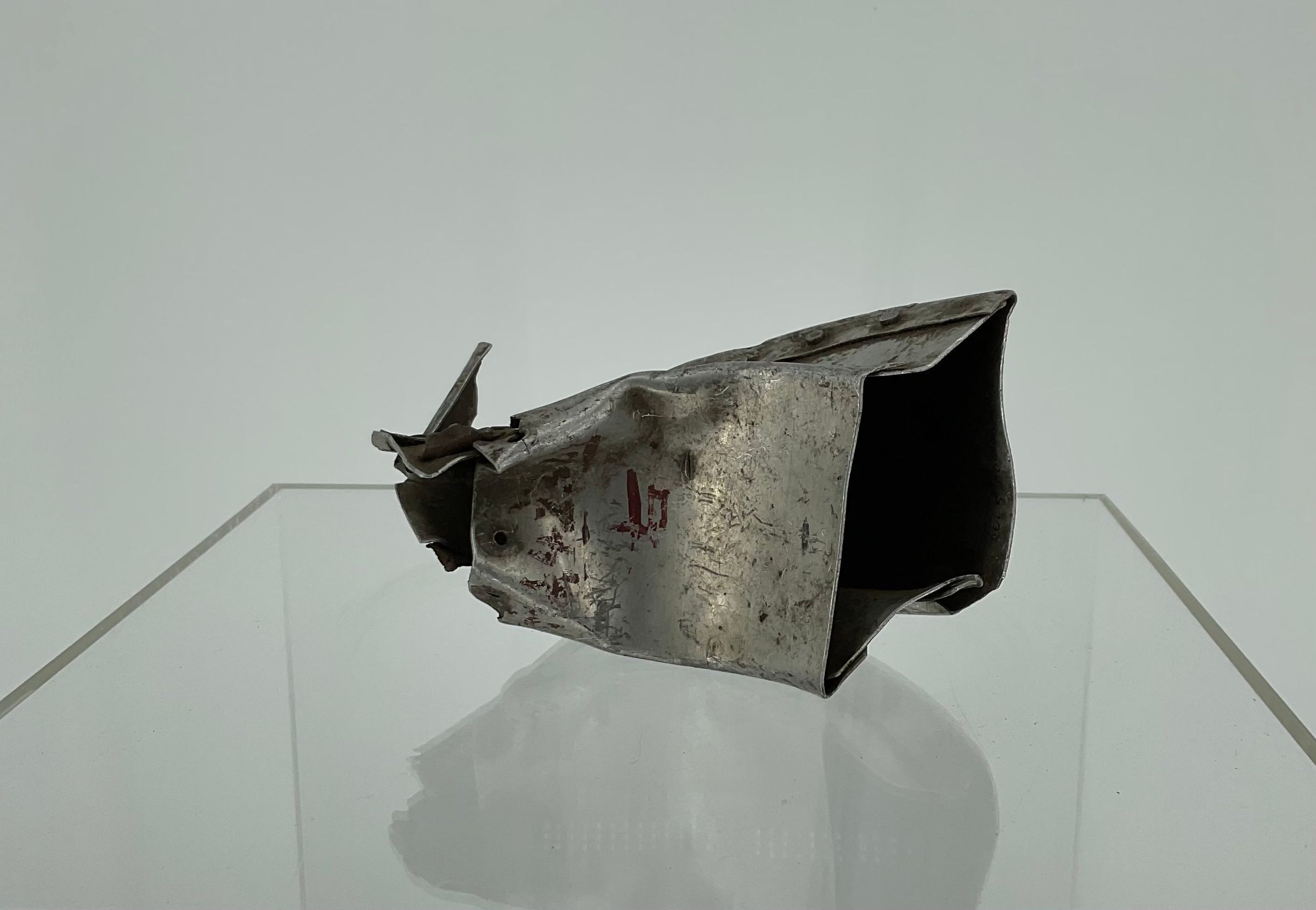 This metal fragment came from the last Japanese airplane to strike the USS Enterprise (CV-6) during World War II. Piloted by Lt. jg Shunsuke Tomiyasu, the kamikaze attack took place on May 14, 1945, during the Battle of Okinawa. The USS Enterprise's forward elevator was destroyed, and 14 men were killed with another 68 wounded.Collection
