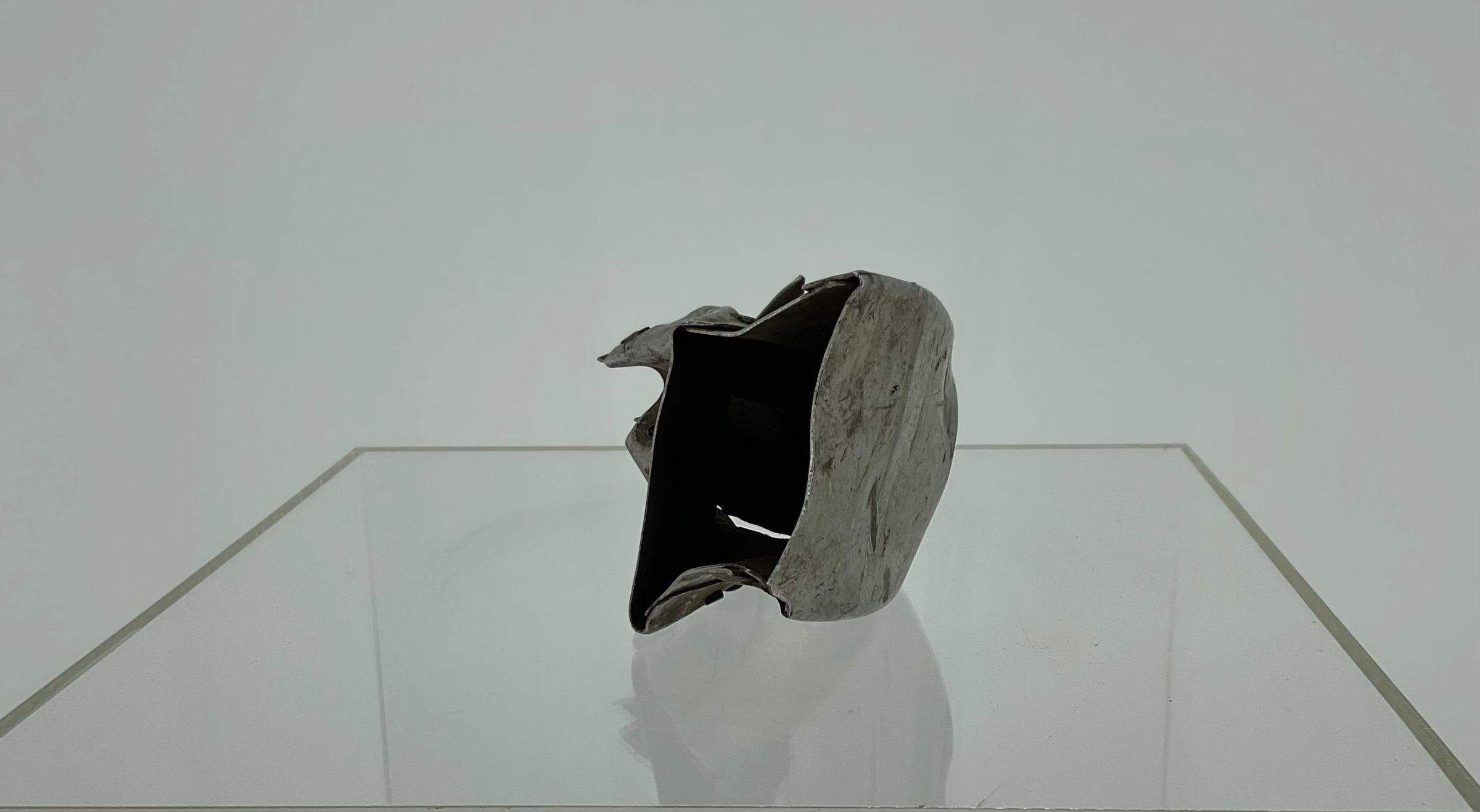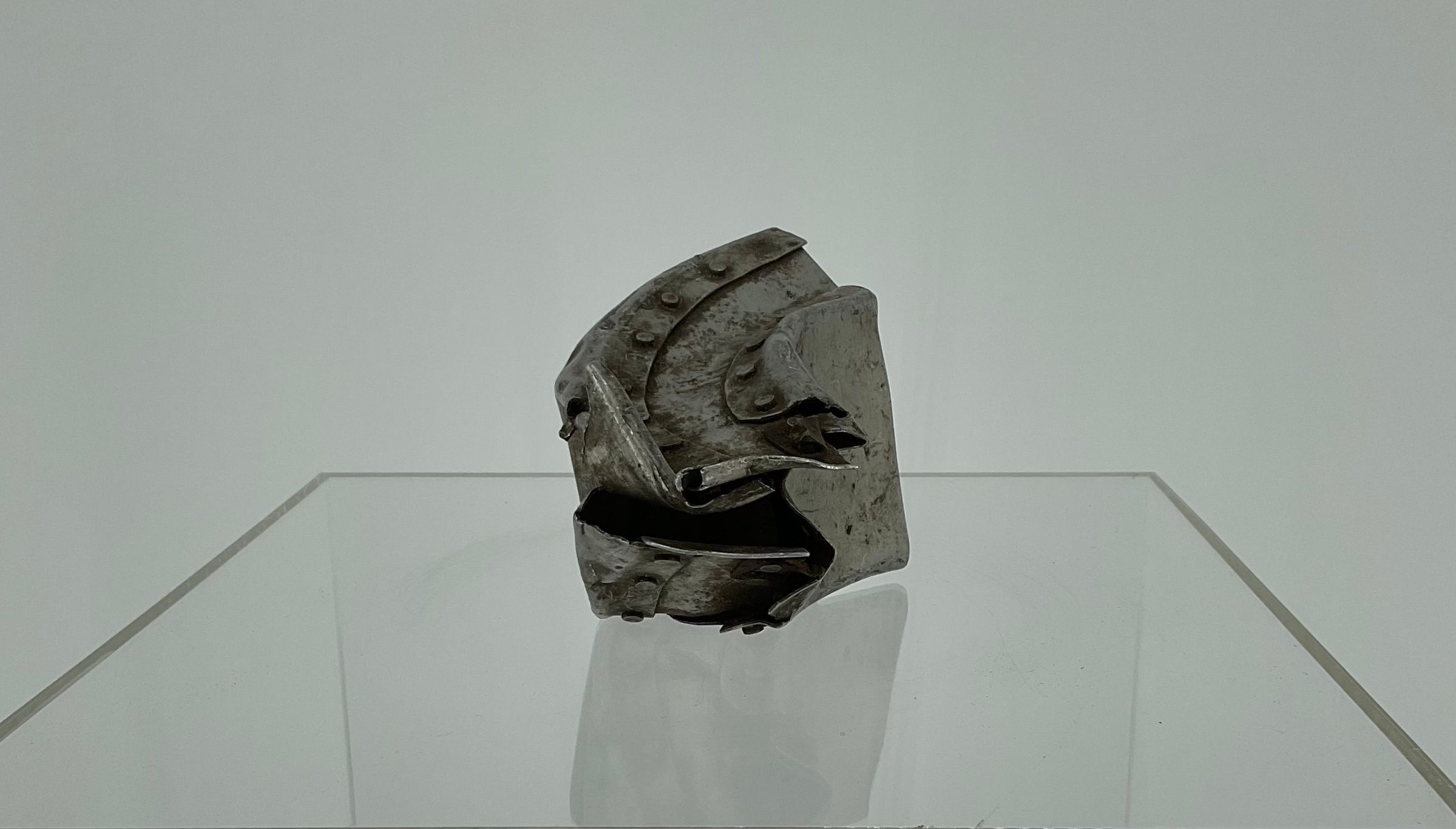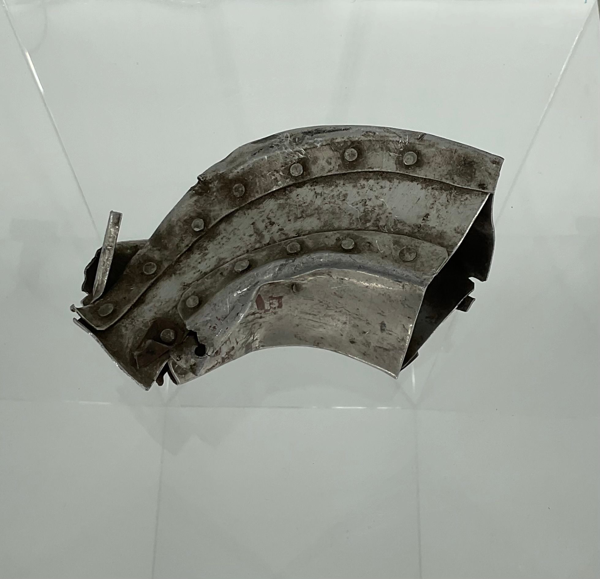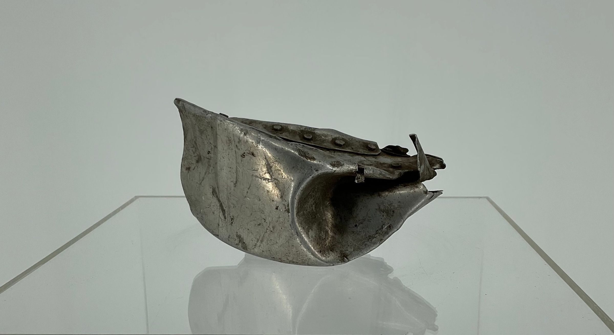 An angular and crushed gray piece of metal with two lines of rivets and red kanji along the sides.Use