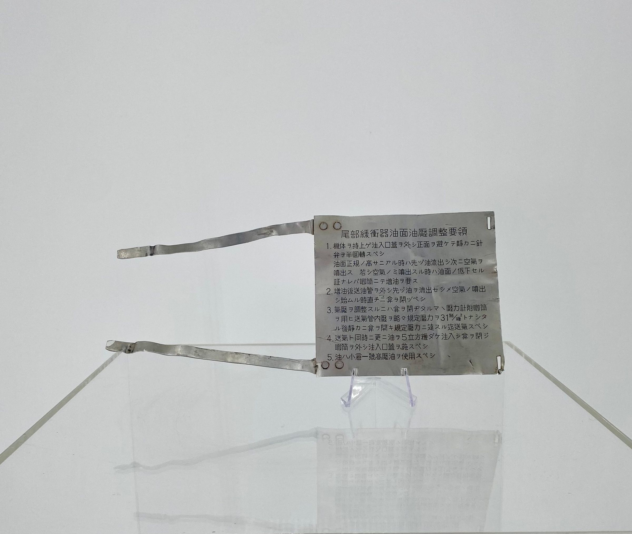 The plate would have been secured inside a Japanese aircraft as a reminder and aide in fixing problems with the tail shock absorber.Context