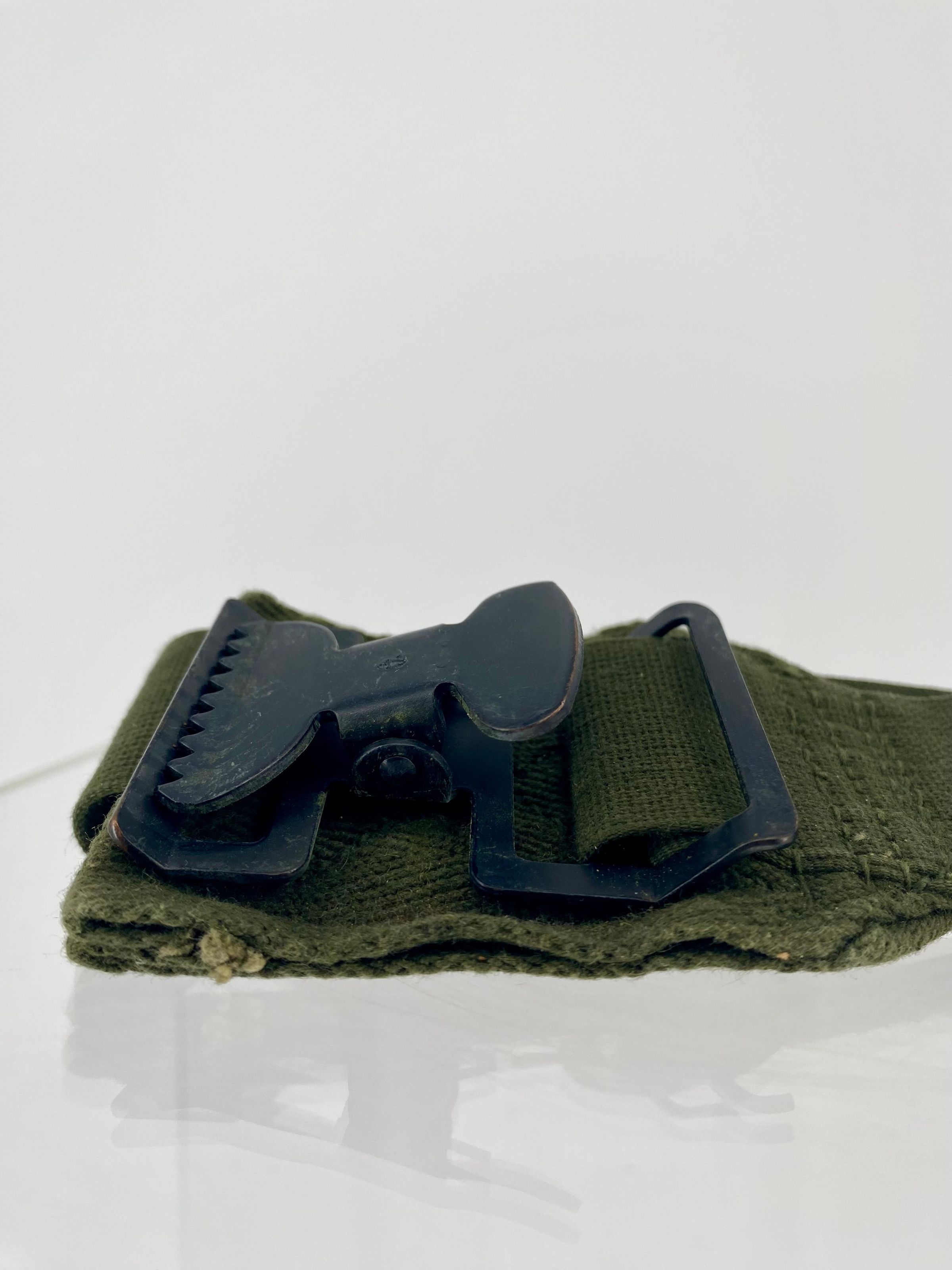 A long, olive-drab piece of fabric with a black metal cinch on one end with an instruction label sewn near it.Use