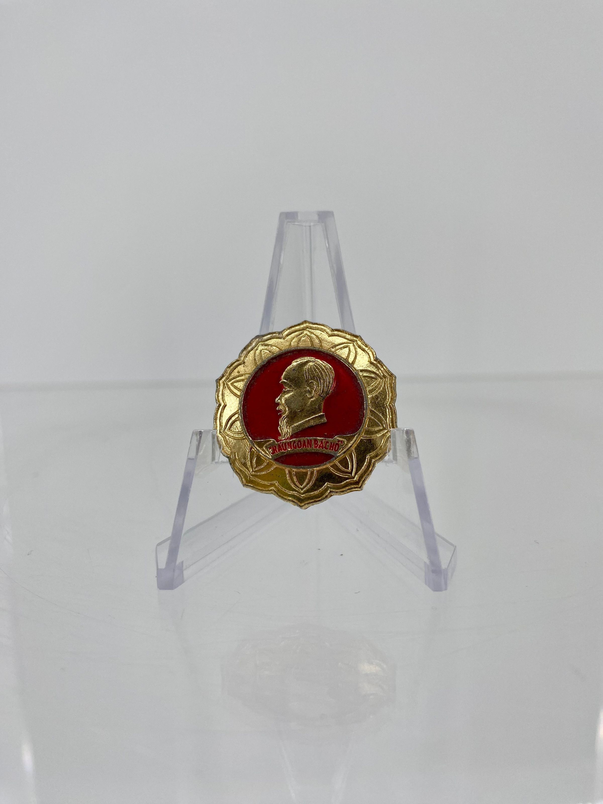 A thin, scalloped badge with a side-profile of Ho Chi Minh and the word 'cháu ngoan bác hồ' in gold foil. 'Cháu ngoan bác hồ' translates as 'Good Nephew Uncle Ho.'Use
