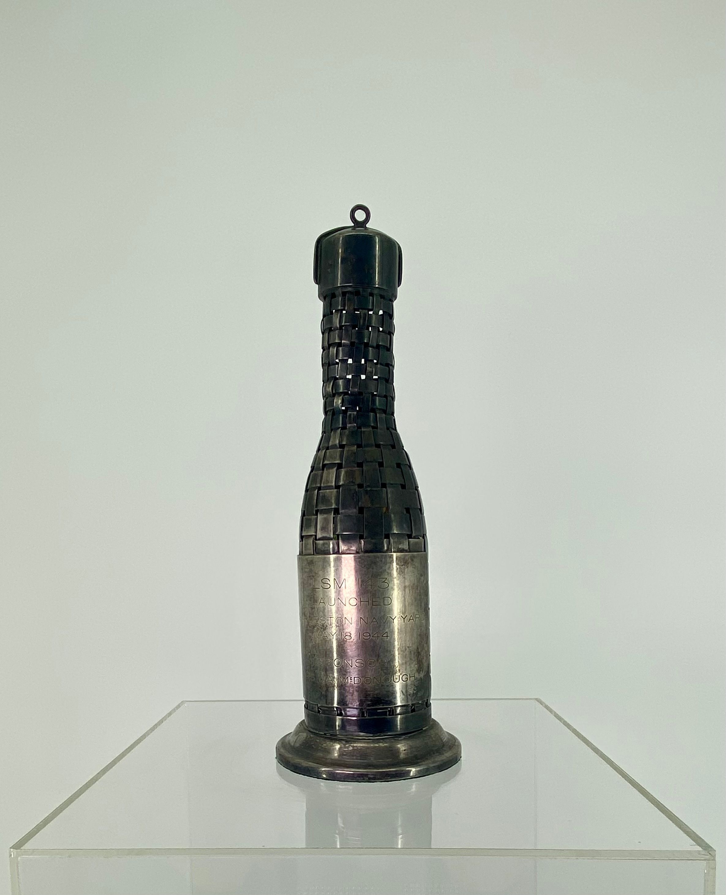 Woven silver christening bottle sealed with the remnants of a glass champagne bottle tucked inside. The bottle reads "LSM 143, Launched, Charleston Navy Yard, May 18 1944, Sponsor Mrs. JA McDonough."Use