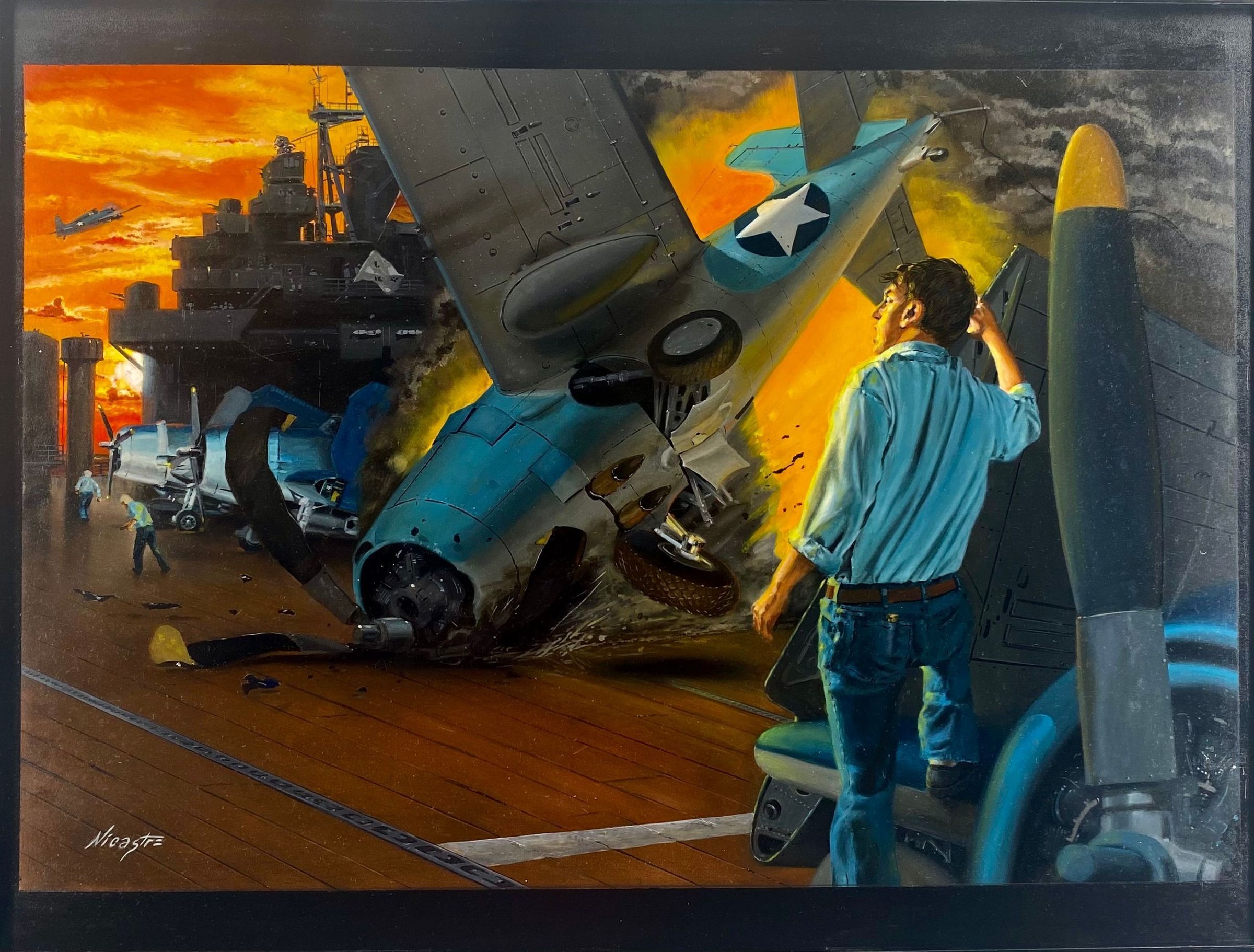 Oil painting showing William Vassallo (right) watching horrified as an F4F Wildcat attempts to land and crashes on the deck of the USS Yorktown (CV-10) on November 23, 1943.Acquisition