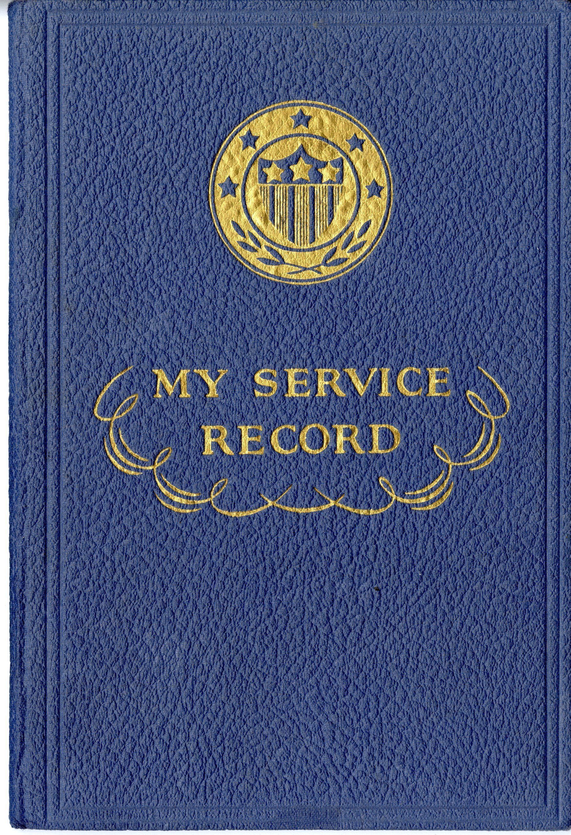 A blue and gold service record book produced containing sections for notations of enlistments, transfers, promotions, foreign service, engagements, disability, and discharge of Warren Vernon Tucker, as well as sections for personal notes and recollections of wartime service.Context