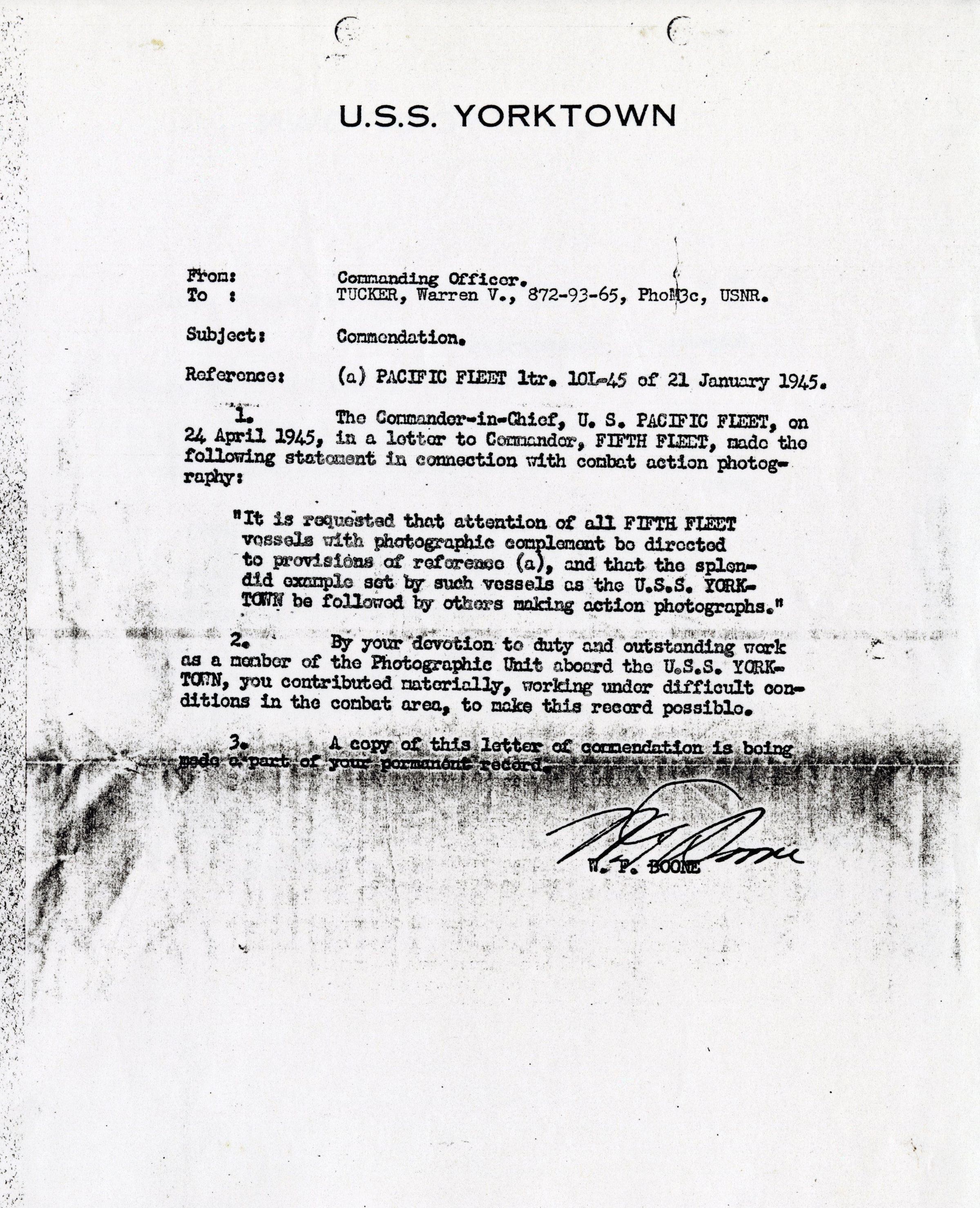 A copy of the commendation received by Warren Tucker from Captain Walter Boone on April 24, 1945 as part of the USS Yorktown (CV-10)'s Photographic Complement. The Photographers Mates receiving a commendation from Commander in Chief Pacific Fleet Headquarters (CINCPAC) for their exemplary action photographs while part of the US Pacific Fifth Fleet.Context