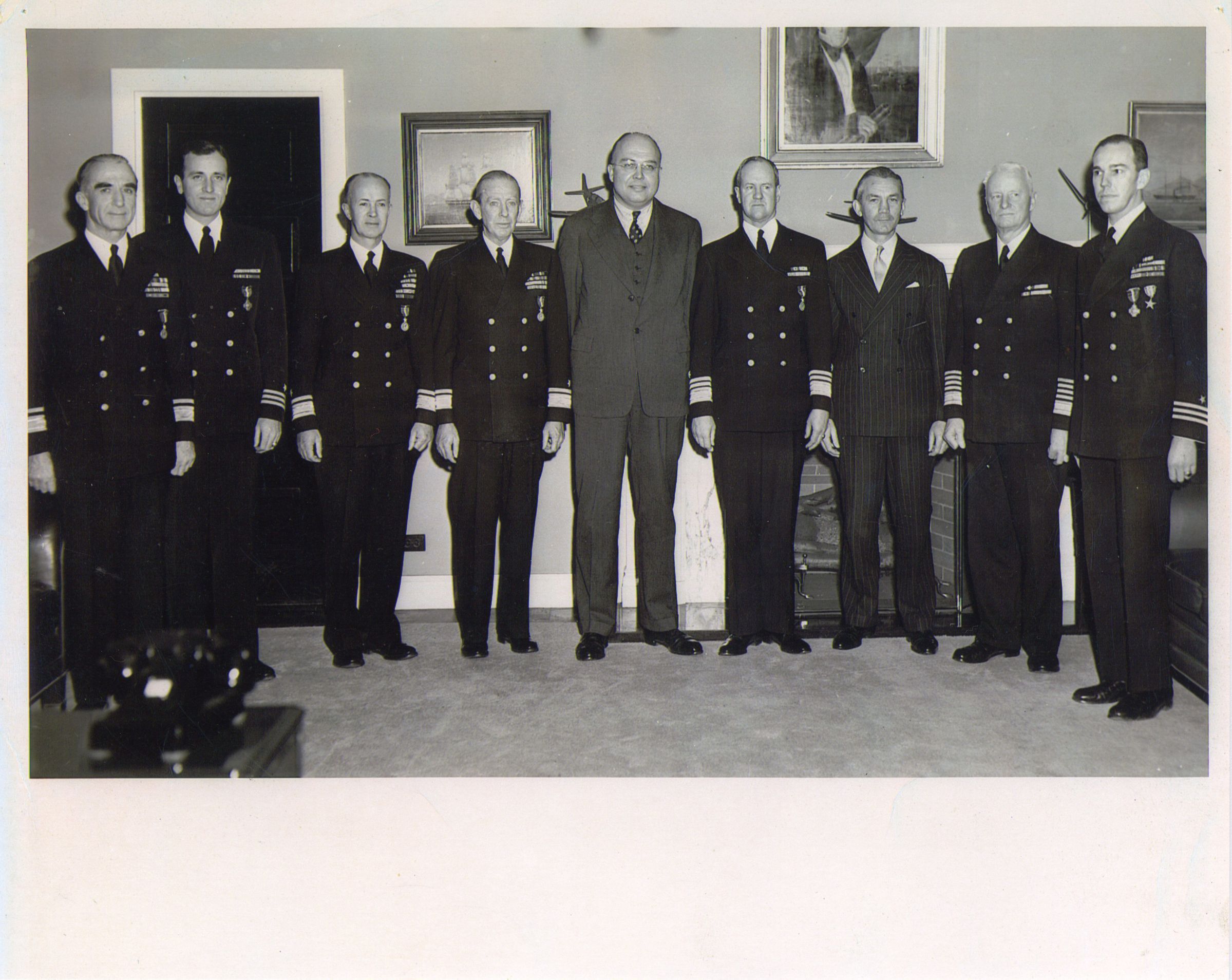 An awards ceremony that took place on January 14, 1946. Included in this image are Morton Deyo, Benedick Sammes, Robert Carney, William Parnell, H. Struve Hansel, George Hussey, James Forrestal, Chester Nimitz, and Julian Becton.Context