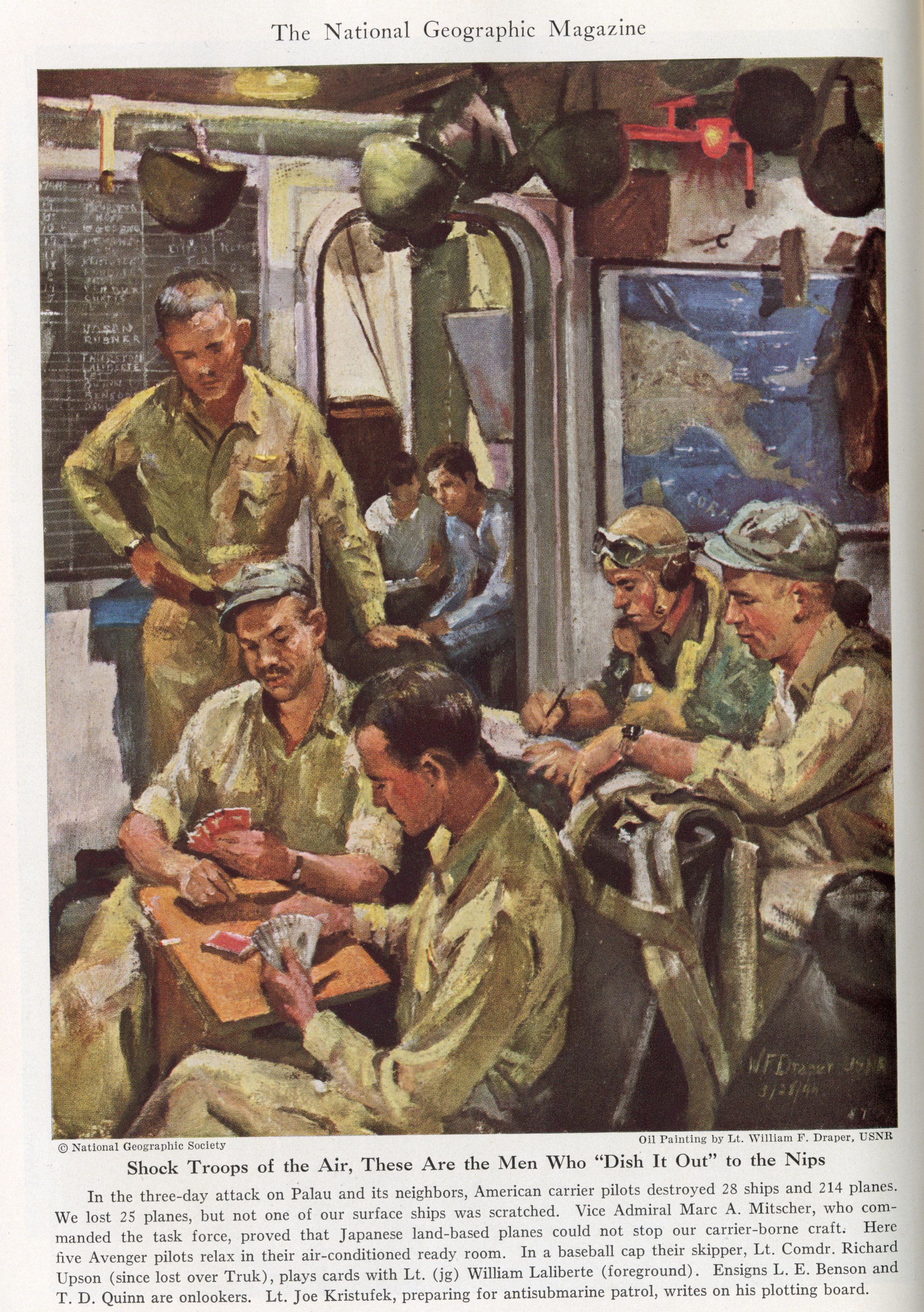October 1944 issue of National Geographic Magazine with a collection of Pacific War artwork by US Navy combat artist Lt. William F. Draper. Included in the collection is the painting "Shock Troops of the Air" on page 424. This painting shows Joseph Kristufek and other pilots in a ready room.Context