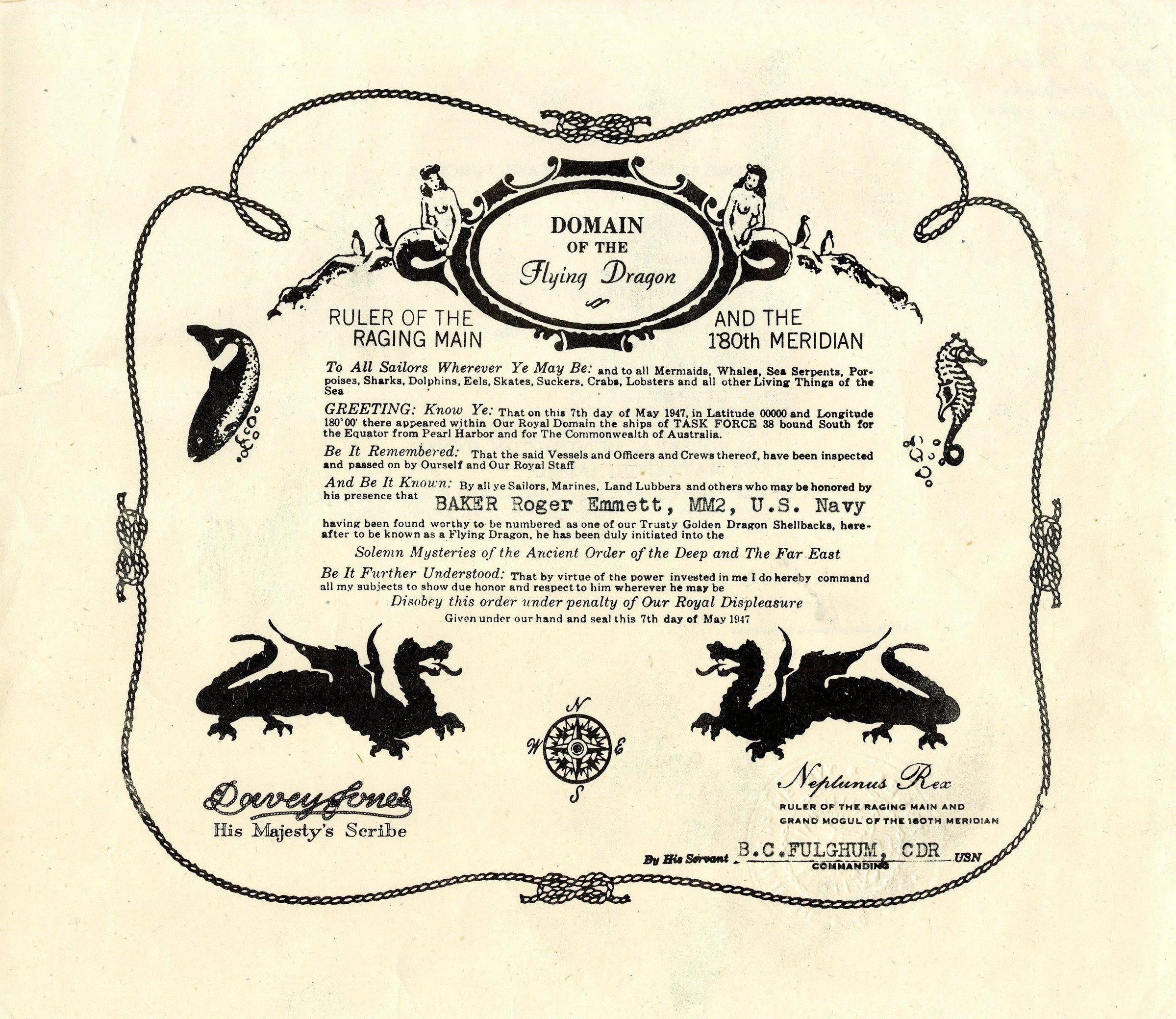 A certificate of membership in the Domain of the Flying Dragon issued to Machinists Mate 2/c Roger Baker for crossing the both the Equator and the International Date Line (180th meridian) aboard the USS Laffey (DD-724) as part of Task Force 38 on May 7, 1947.Use