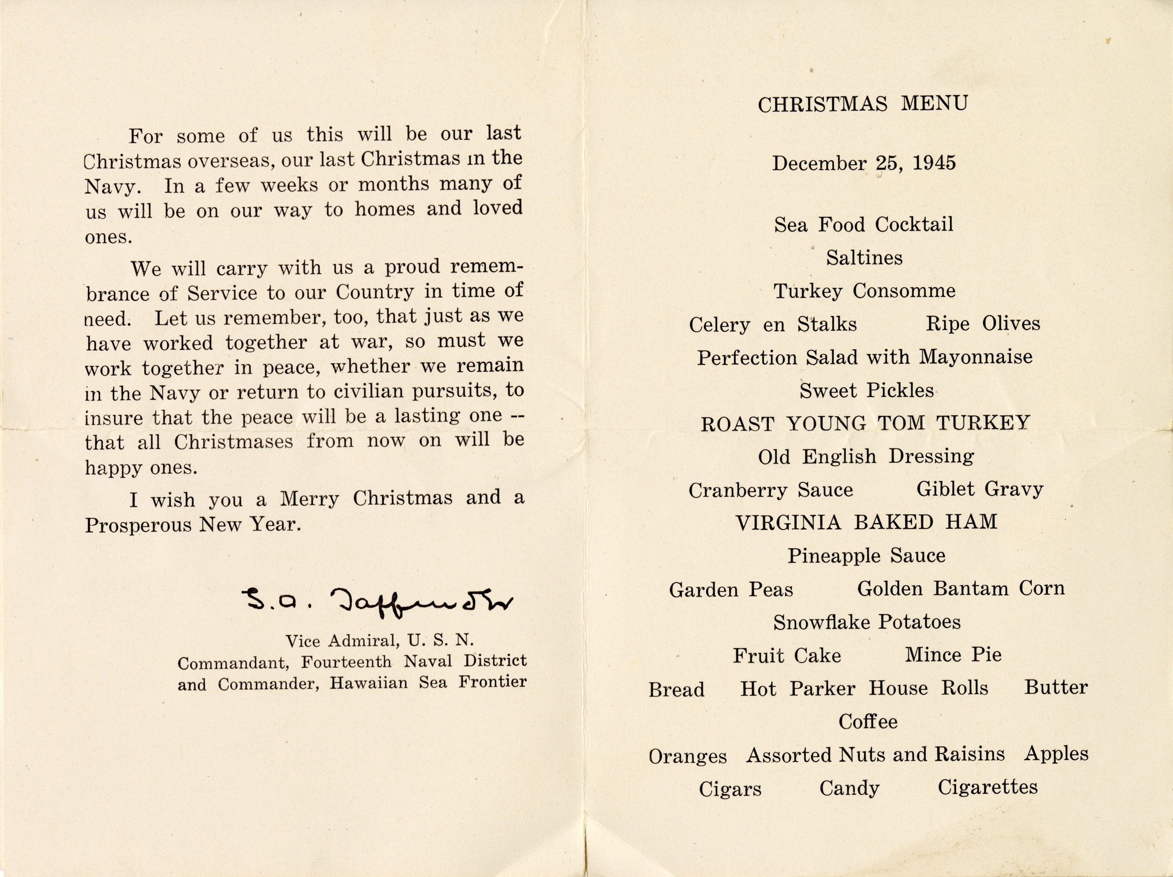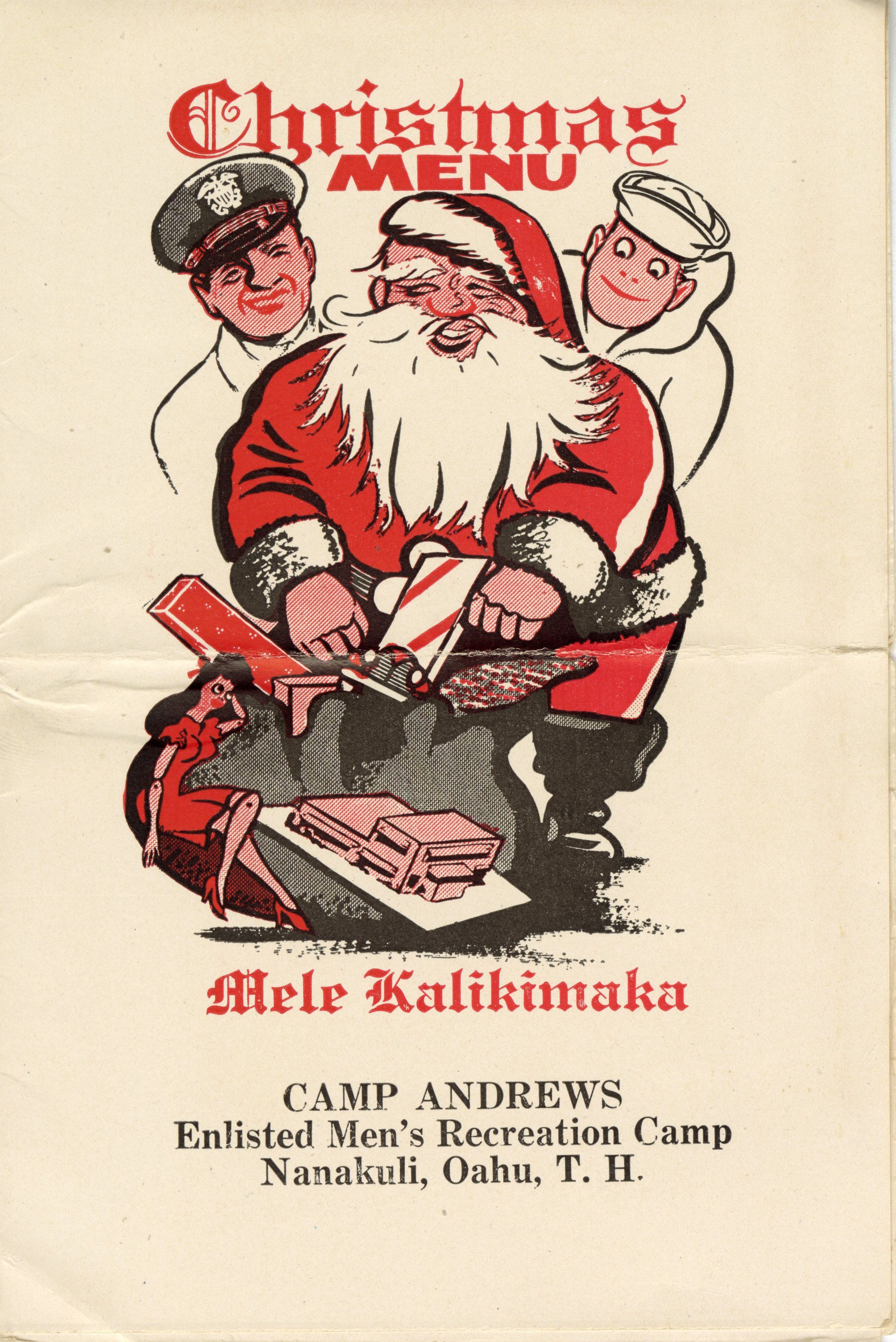 Christmas menu from Camp Andrews on Oahu, Hawaii. The menu is dated December 25, 1945.Context