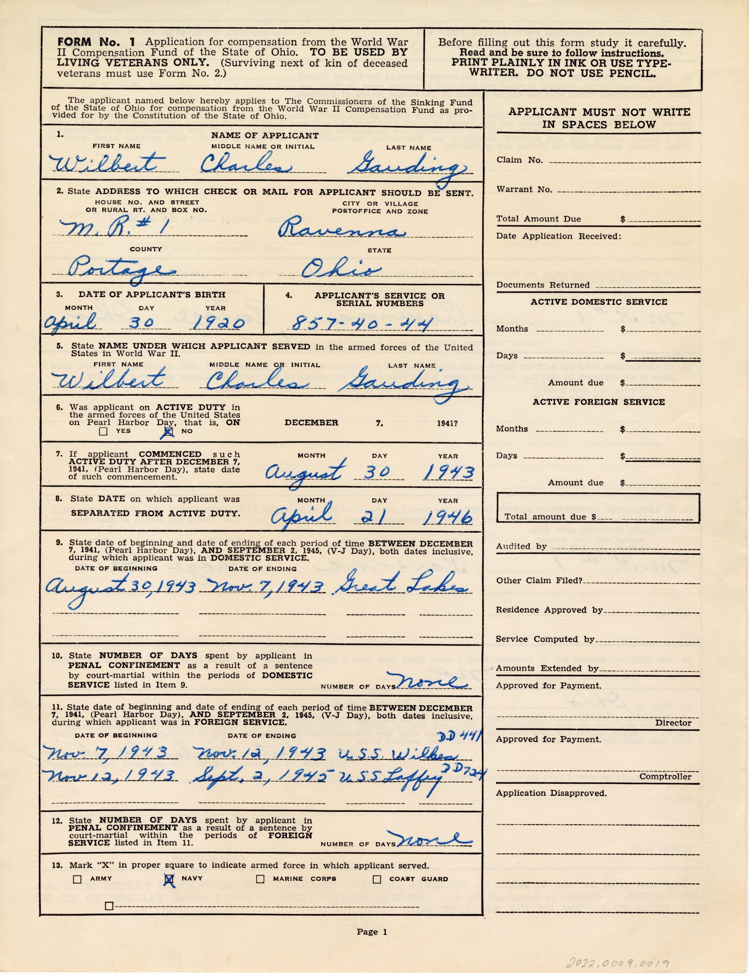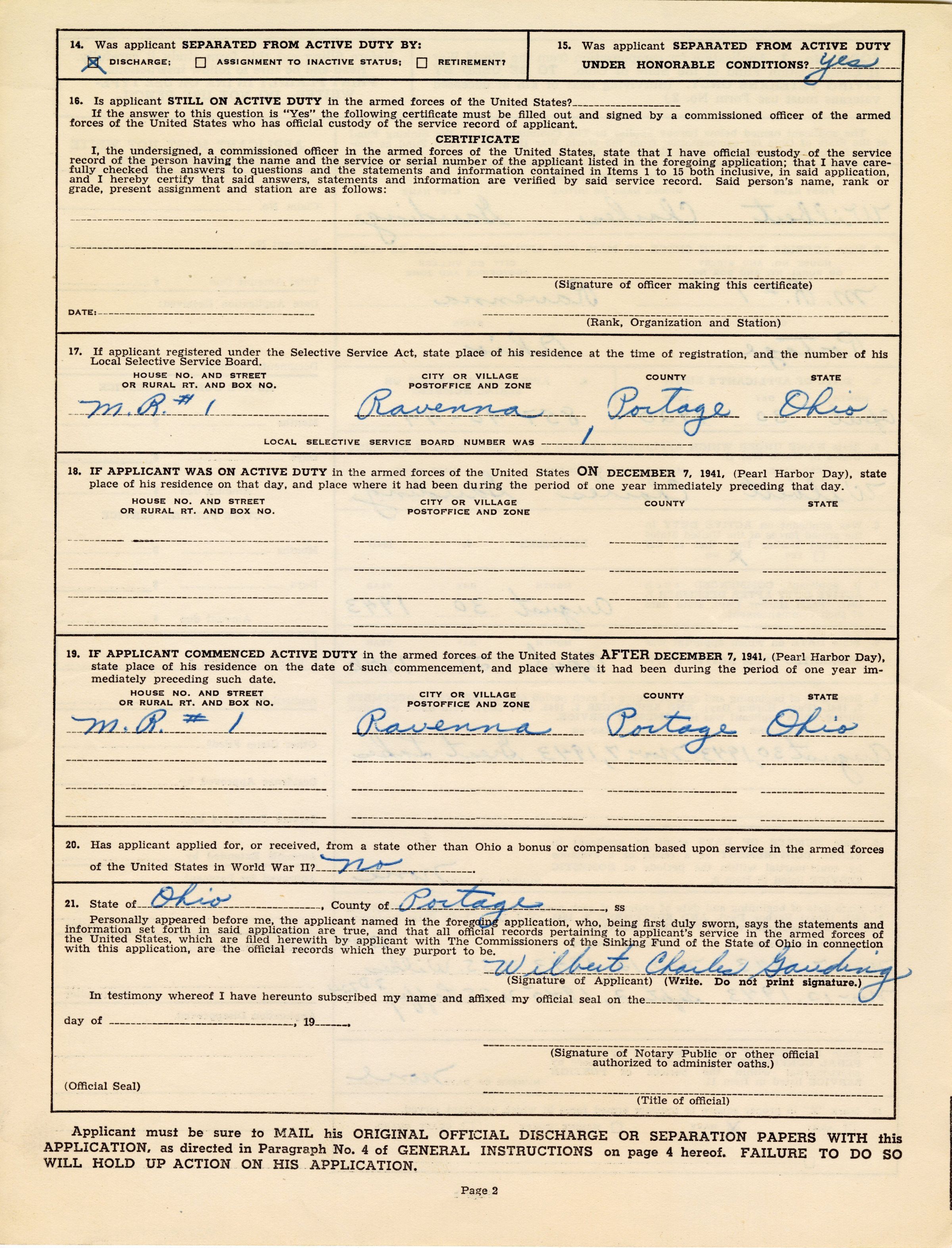 Application for compensation from the World War II Compensation Fund from the State of Ohio, filled out by Wilbert Gauding.Context