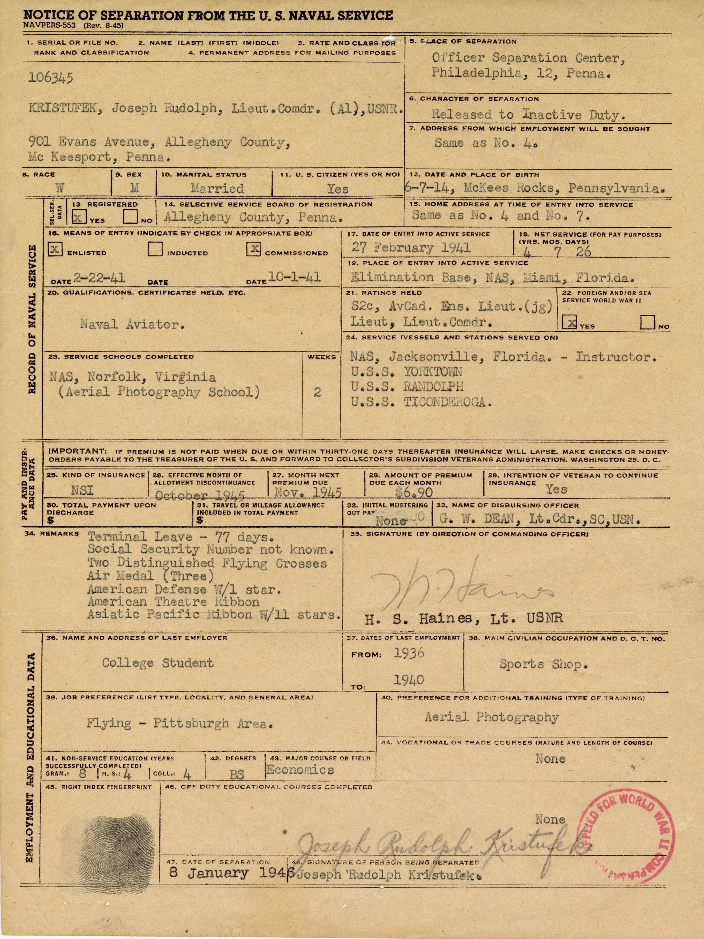 Notice of separation from the U.S. Naval Service for Joseph Kristufek. This paperwork provides a brief overview of Kristufek's service history and even some information on his life before World War II.Context