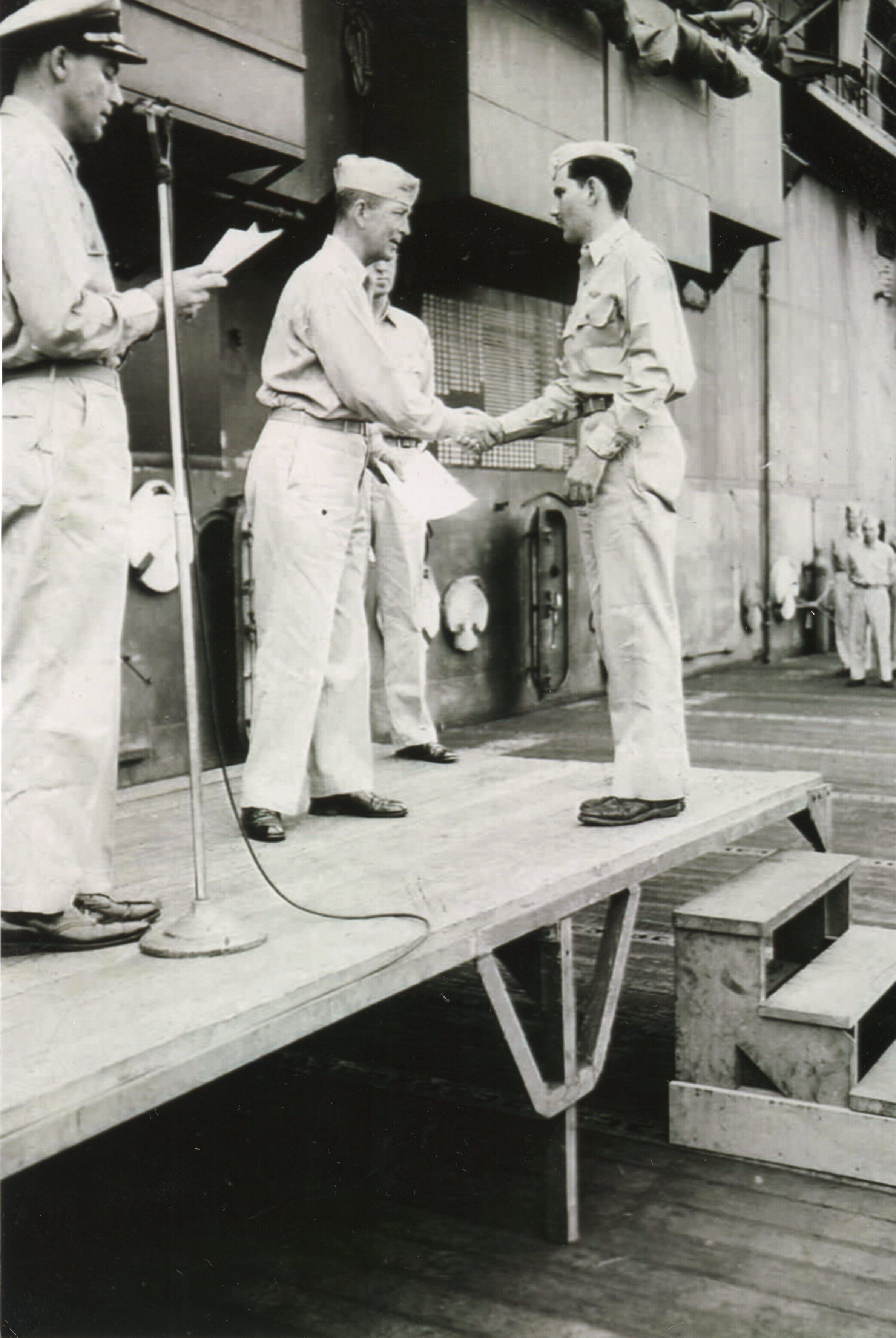 Photograph of Gerald Hennesy at an award ceremony that was held aboard the USS Yorktown (CV-10) following the end of World War II.Context