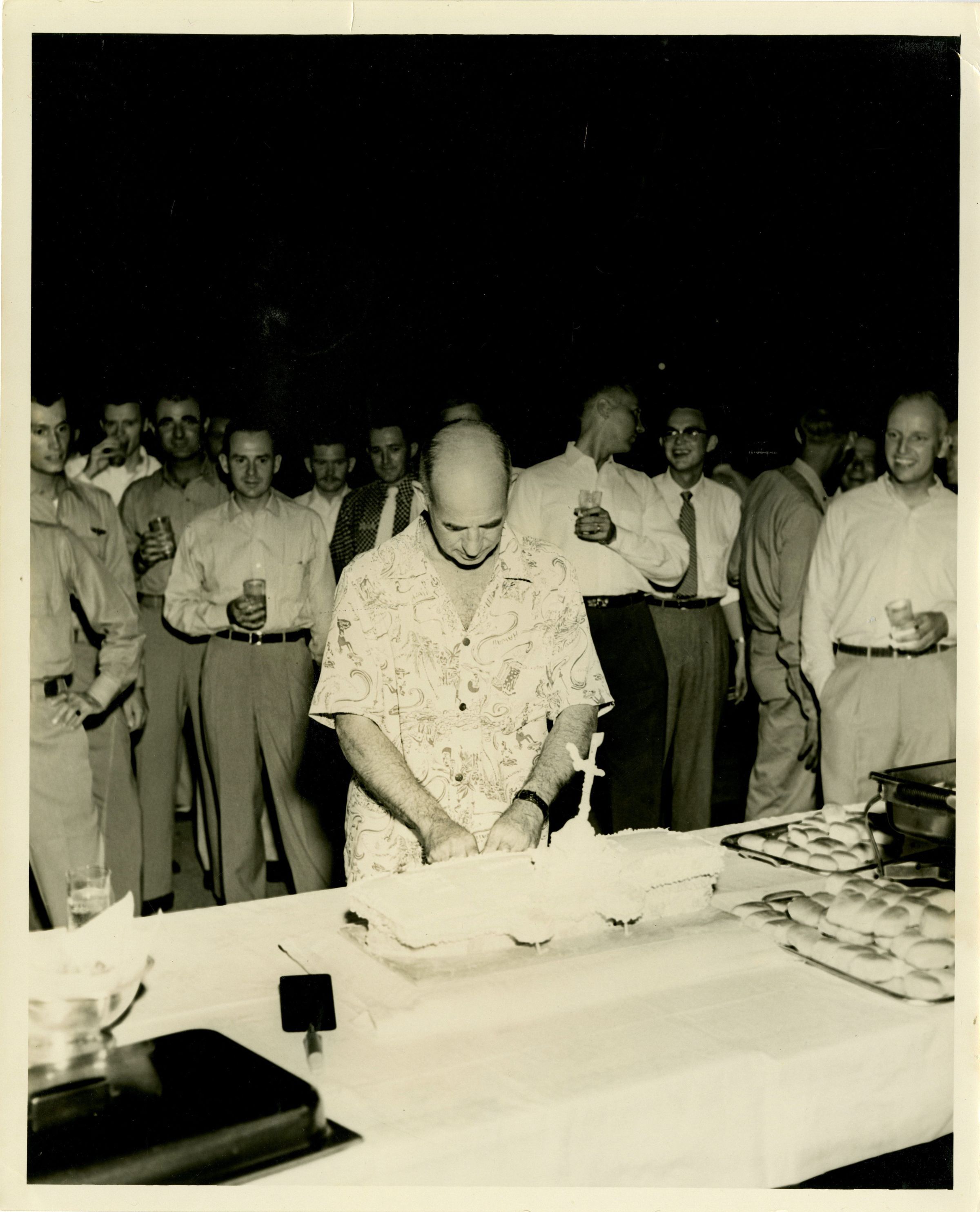 This photograph shows Captain McKechnie cutting into his farewell cake.Context