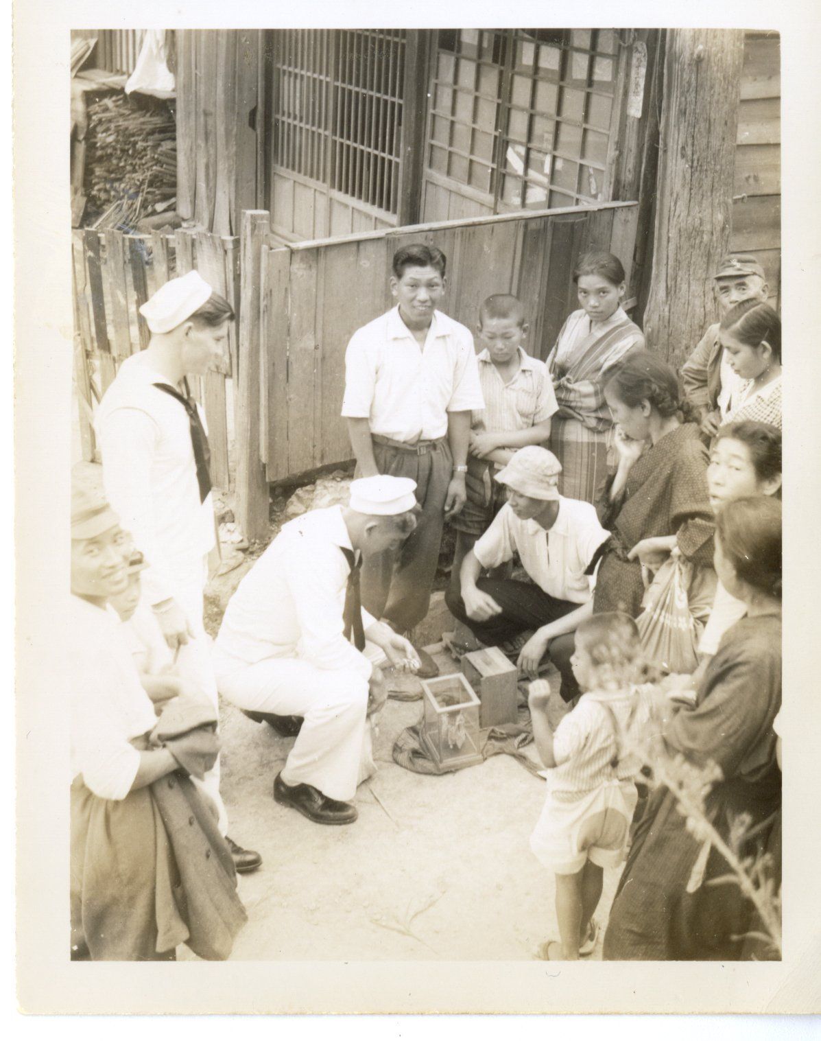 The caption accompanying the photo reads " Trading or buying from the Japs was lots of fun and much to our surprise most of them spoke English well enough that we could understand it."Context